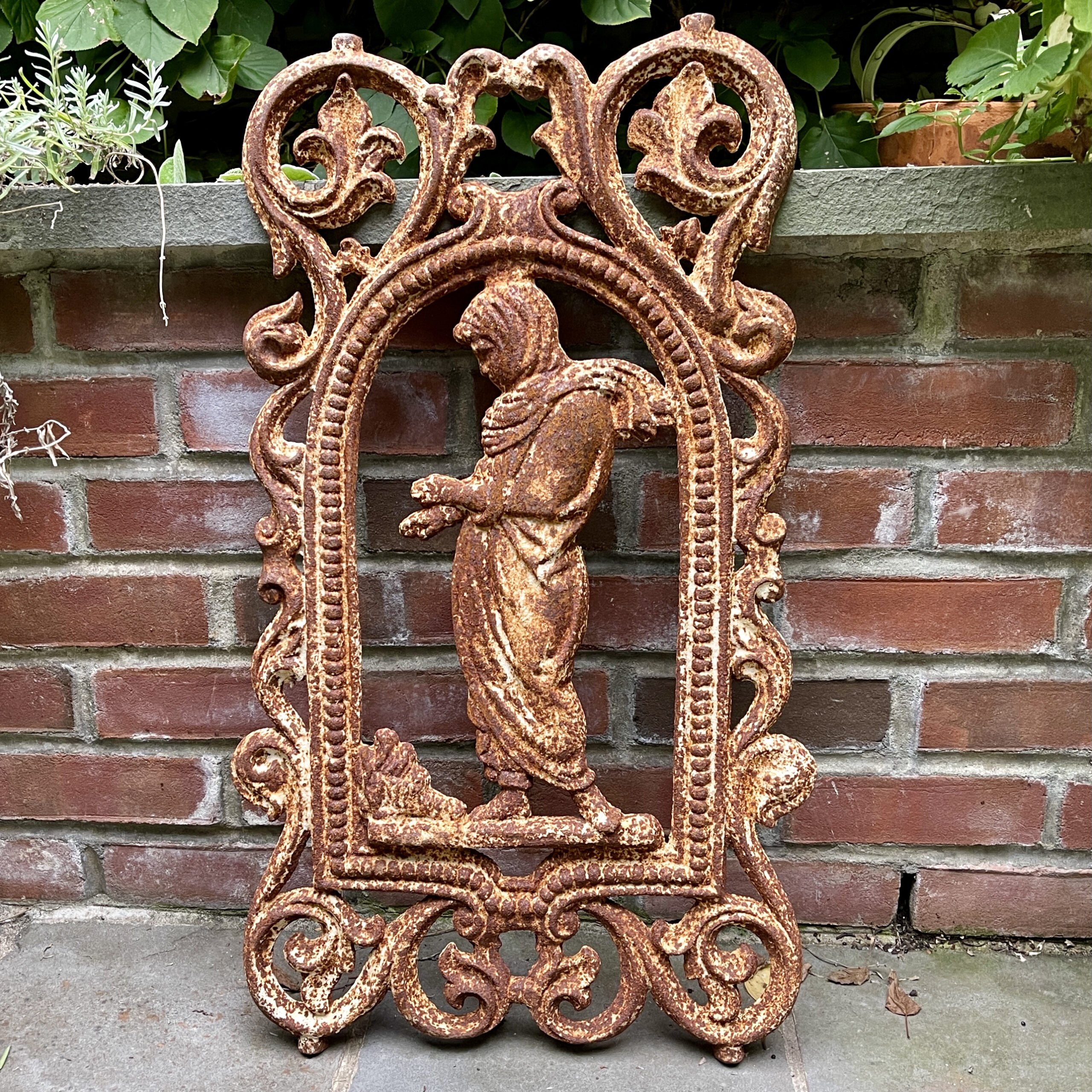 Heavy, weighing about 25 pounds, and aged with a beautiful patina, the panel shows a robed figure within an ornate scrolled frame.