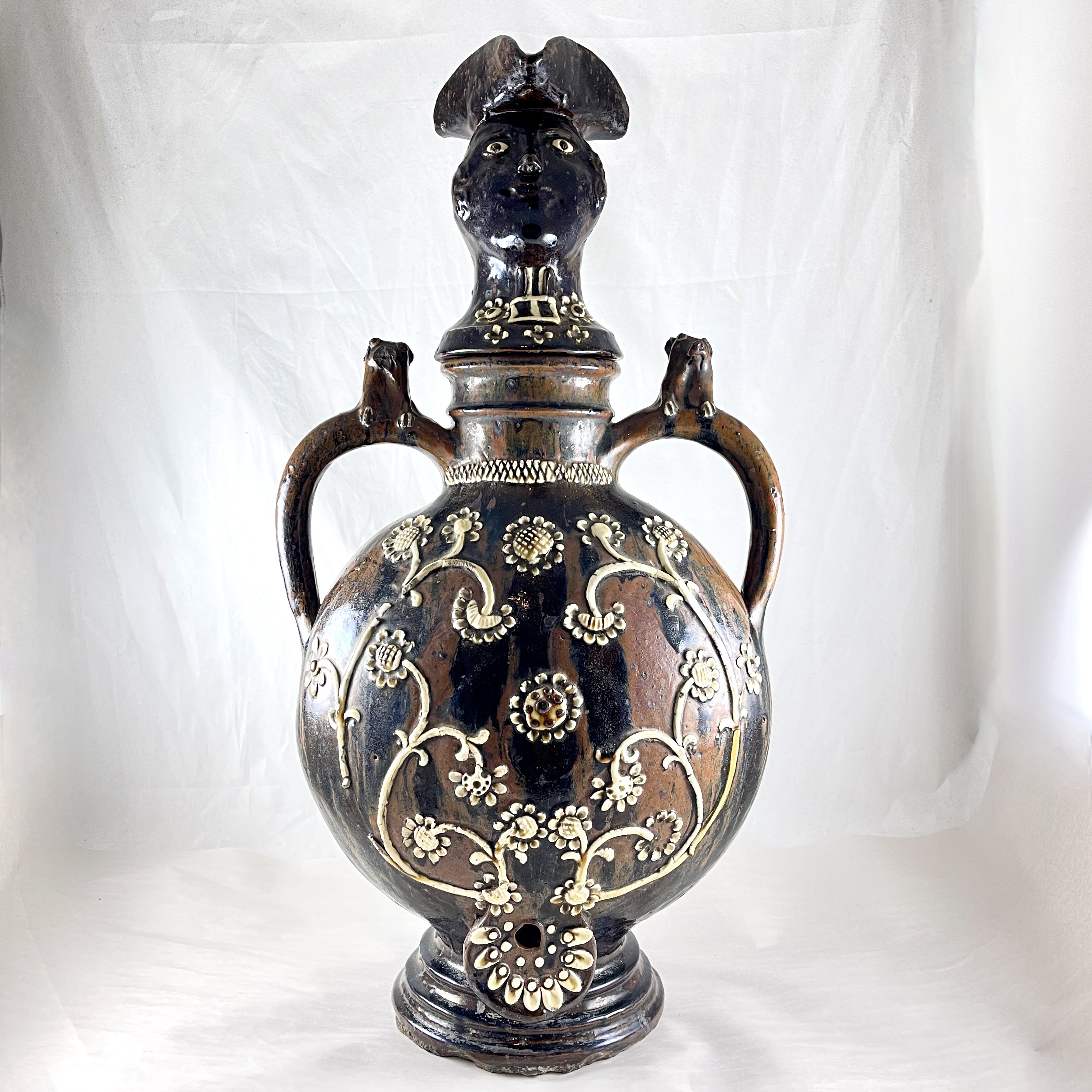 Referred to as a fountain, this vessel was used for the storing and serving of water or wine. Glazed in a treacle glazed earthenware of brown and black with a raised Kaolin clay decoration in an ivory color, the body is decorated with stylized daisy flowers and stems in light relief. Finished with twin ermine handles, and a capped head for a lid. The body is flat backed and sits on a circular footing. The pour spout is at the front near the base, and would have been corked.