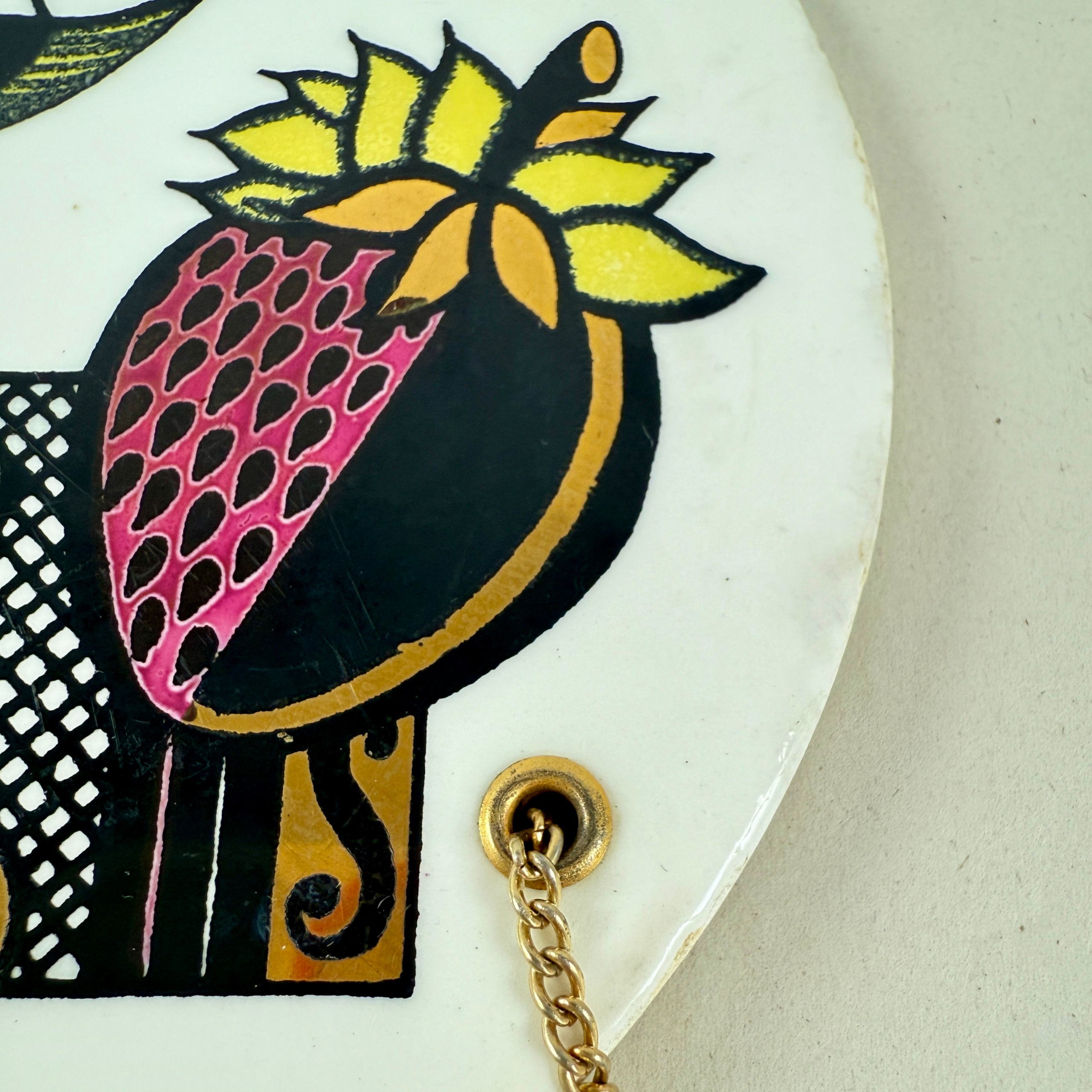 The set includes a round ceramic cheese board printed with an array of mixed fruit, a melon wedge, lemon half, and a strawberry in bright colors – yellow, red, black, and gold.