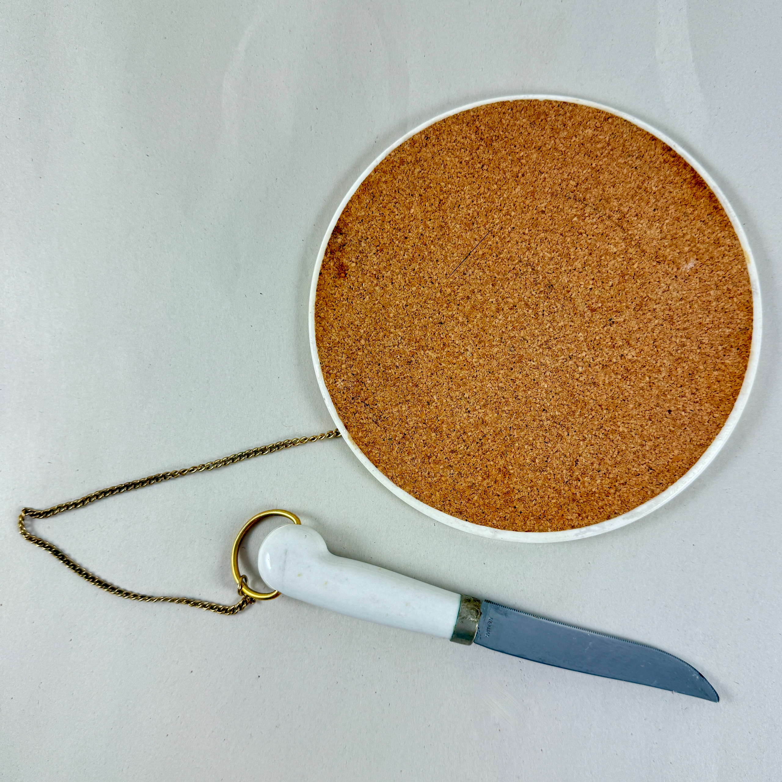 The board is cork-backed. The knife has a ceramic handle colored in gold, yellow, and black, a stainless blade, attached to the board by a chain.