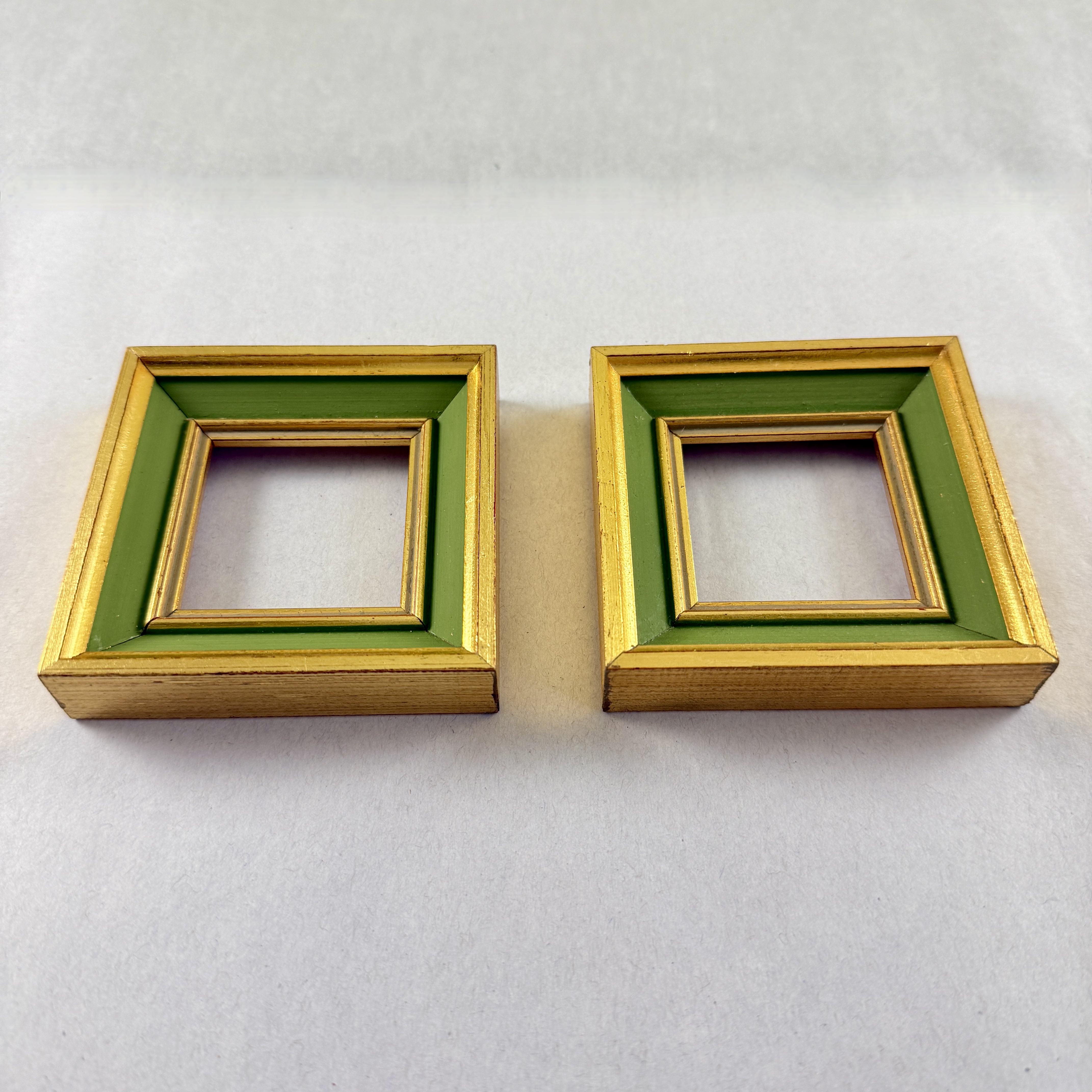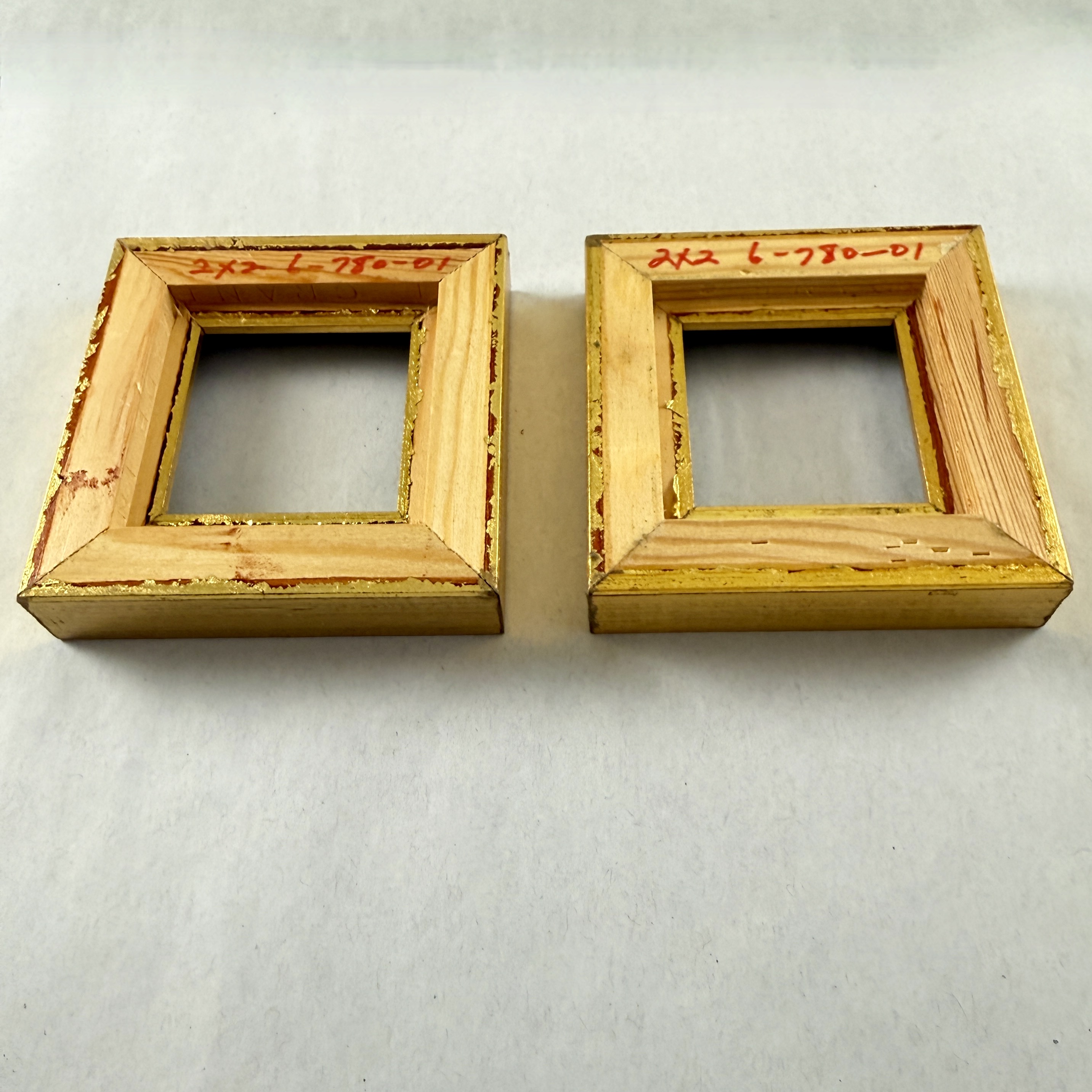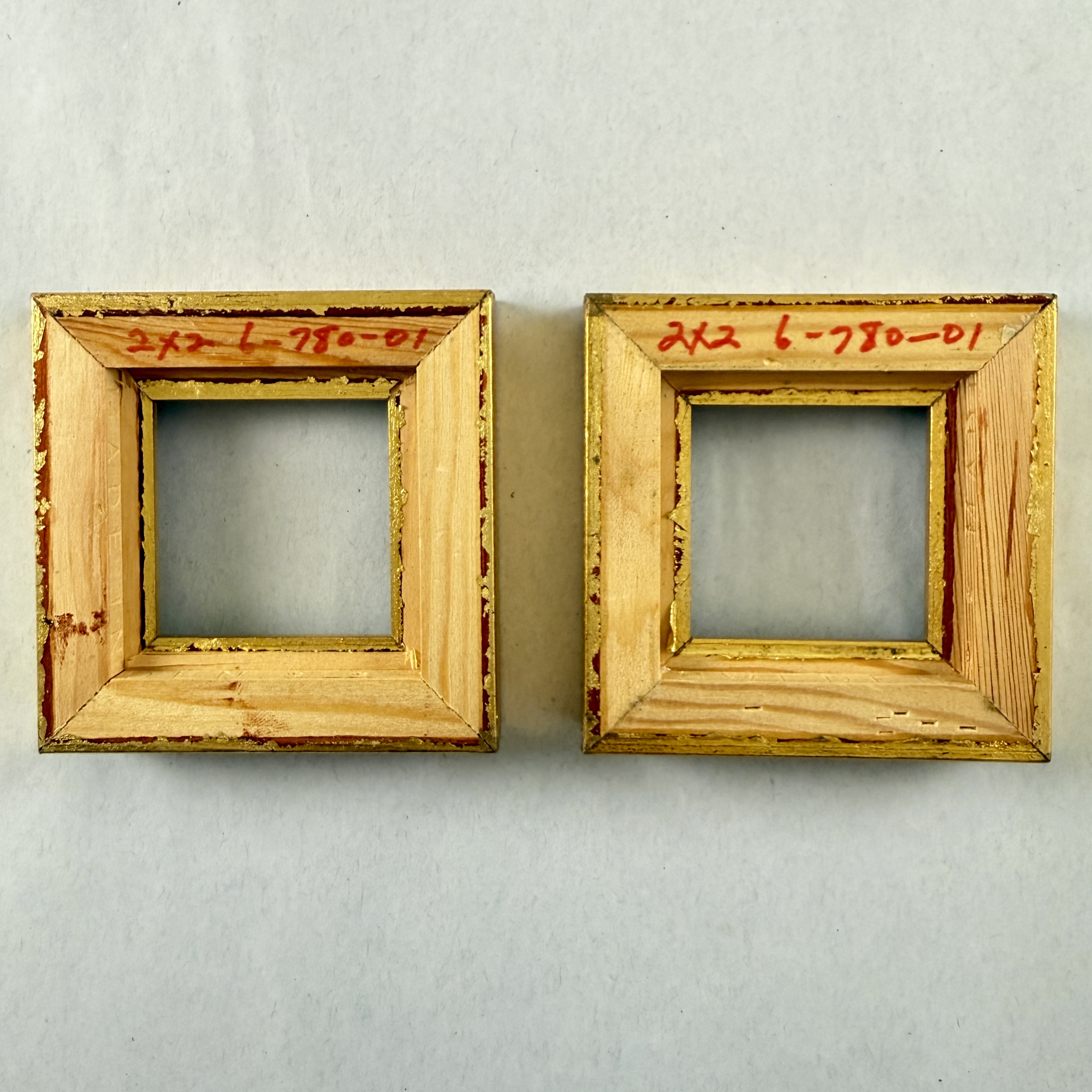 A pair of small square shaped gilded wood picture frames.