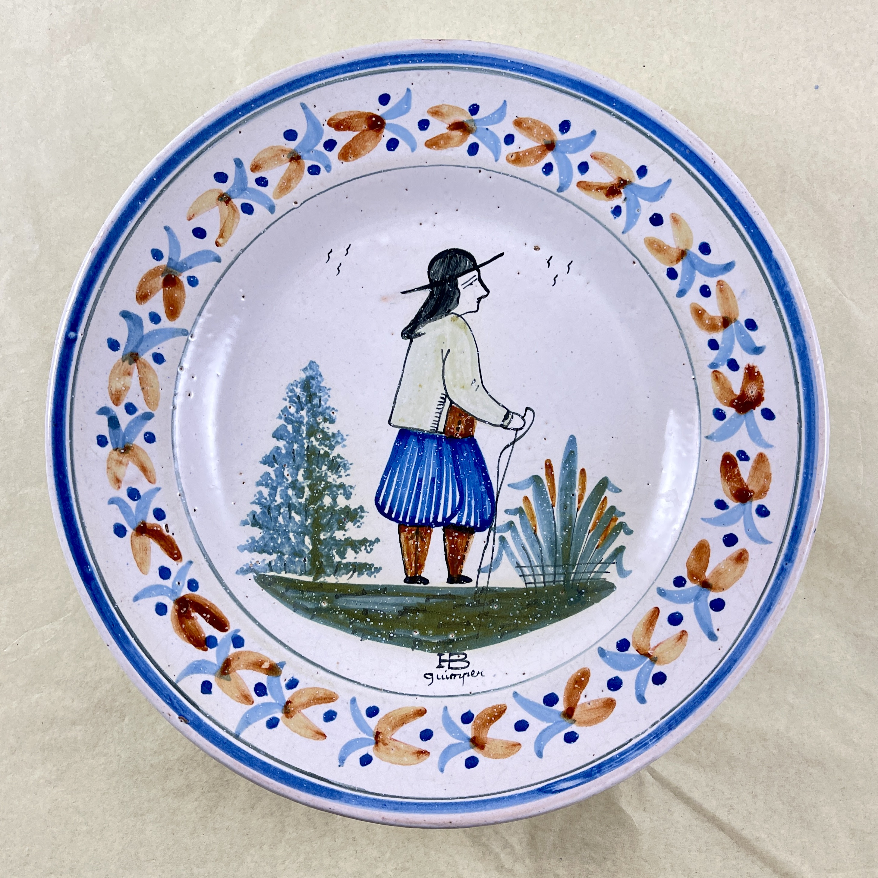Faïenceries de Quimper has been potted and hand painted in a factory near Quimper, in Brittany, France since 1708. The pottery reflects a strong traditional Breton influence and the typical design is the “Petit Breton”, a naive representation of a Breton man or woman in traditional costume. The “Petit Breton” became popular circa 1870 and is still the main design used in newer pieces.