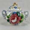 A scarce hand painted piece in an overall floral decoration with a bright blue dash and dot border. The lid has a top knob formed as a pear with two green leaves. The double handles also show a dot and dash lining. Brightly glazed, the Rose floral pattern is distinctive to this type of Italian majolica ceramics.