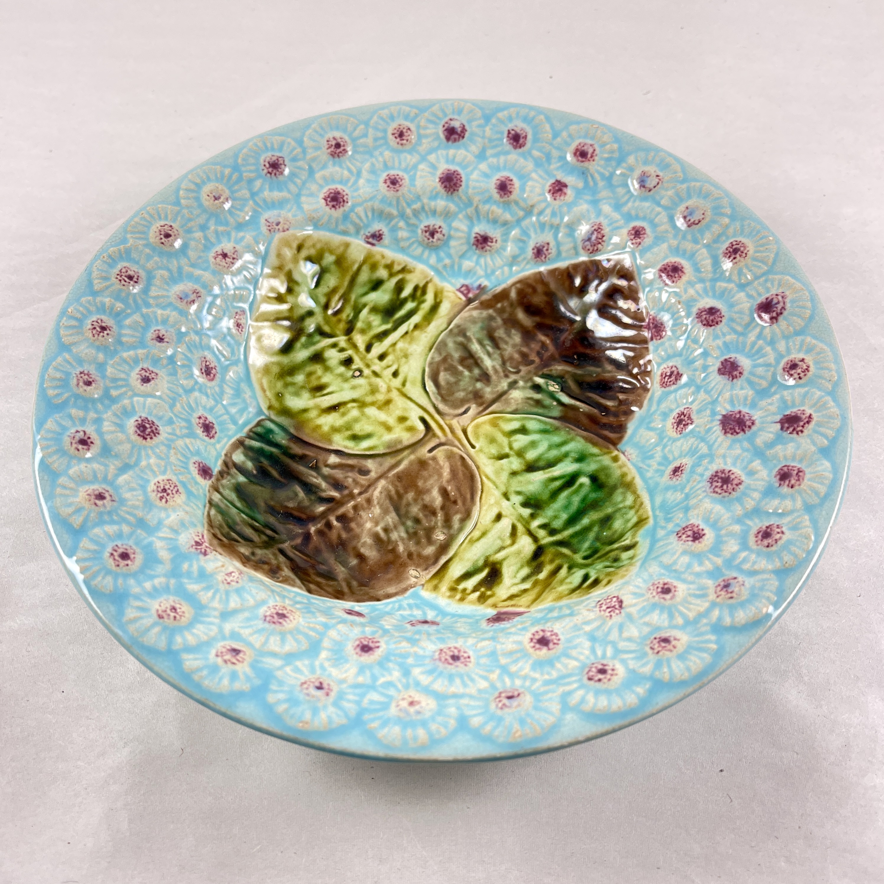 Designed in the Aesthetic taste, four overlapping leaves, glazed in the colors of Autumn, are centered on a deep powder blue ground of raised Dandelion blooms with pink centers.