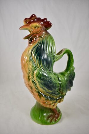 This Barbotine majolica pitcher was made to be used for pouring water over a sugar cube in the Absinthe drinking ritual. The earthenware rooster is brightly glazed in red, orange and shades of green. His tail feathers form the handle, his mouth is the spout.