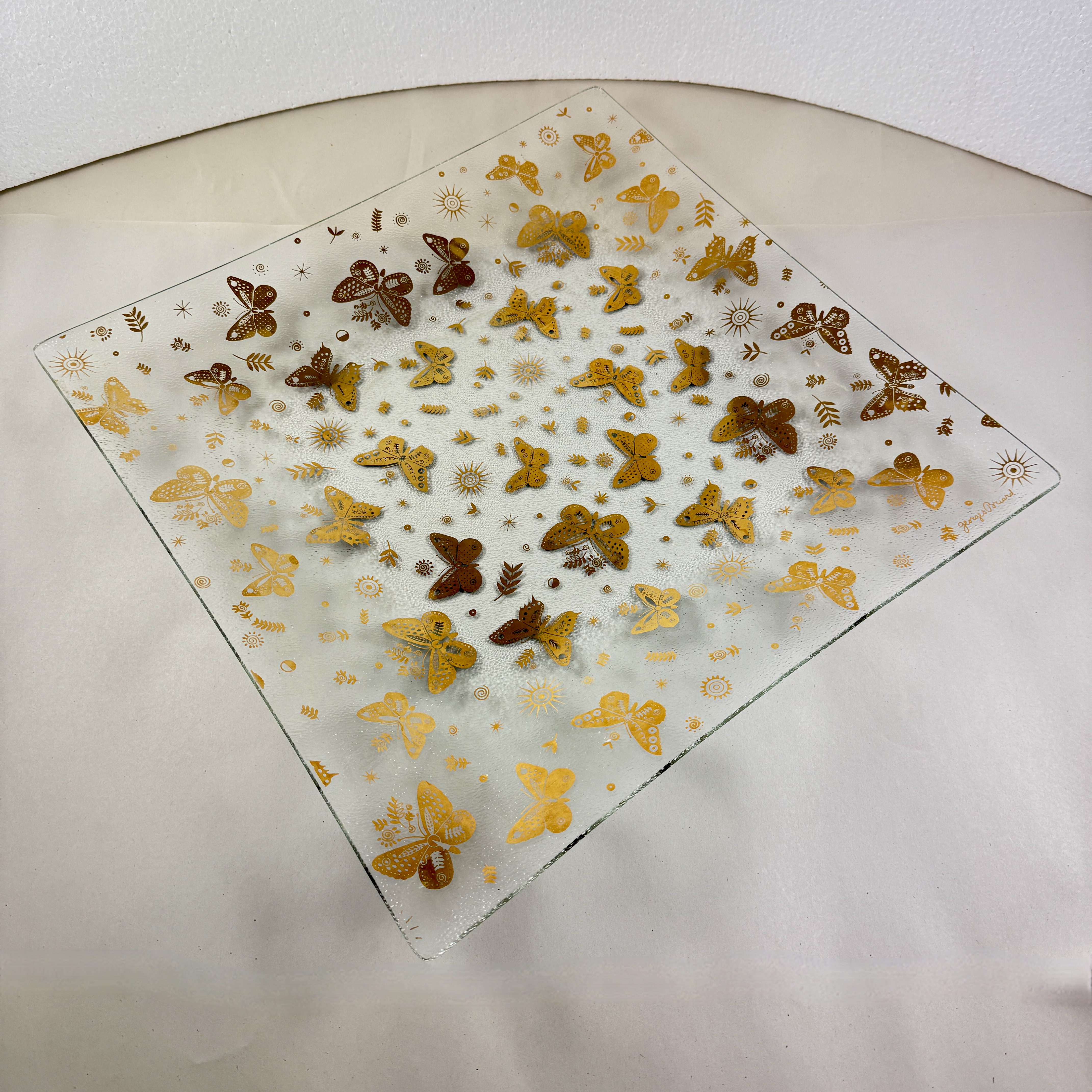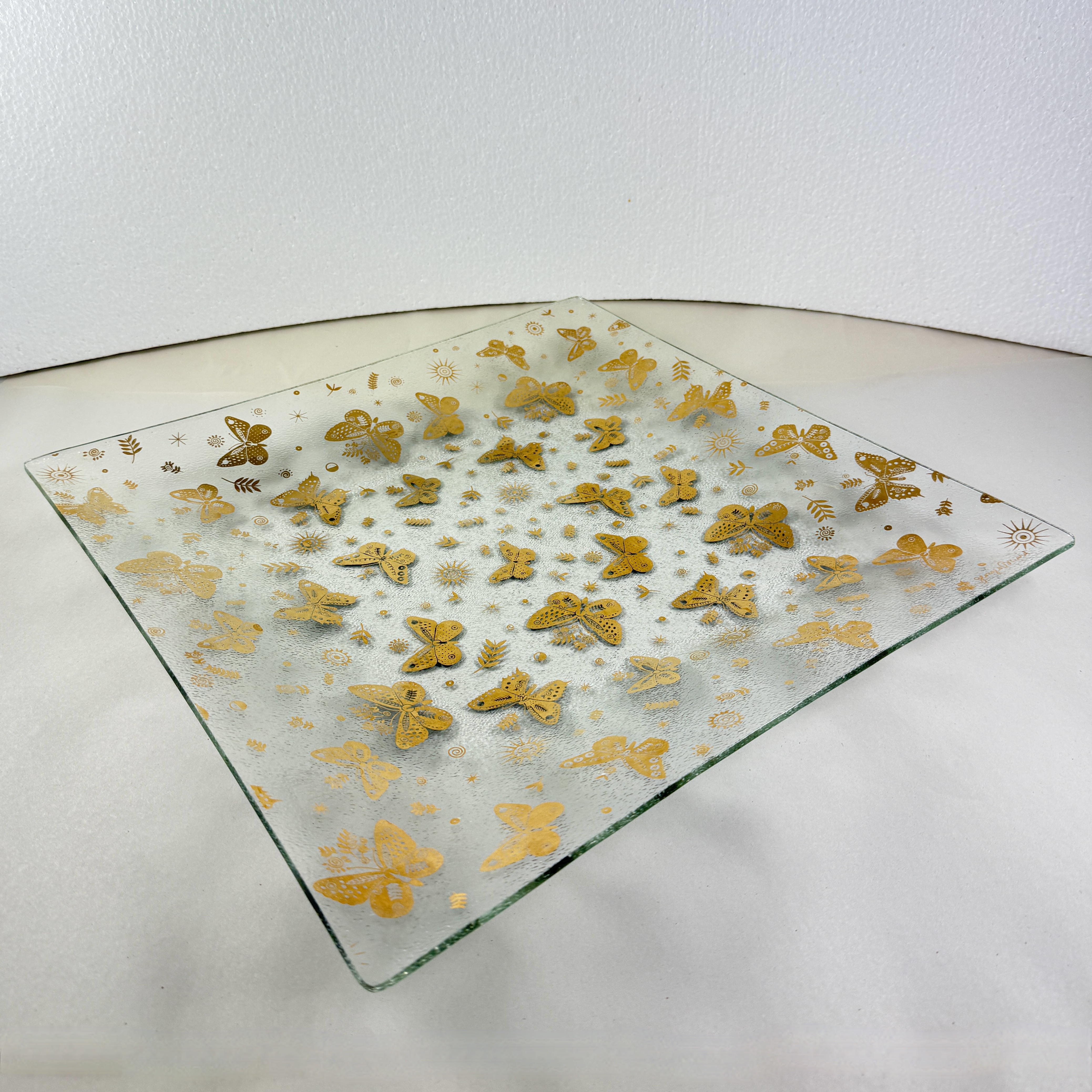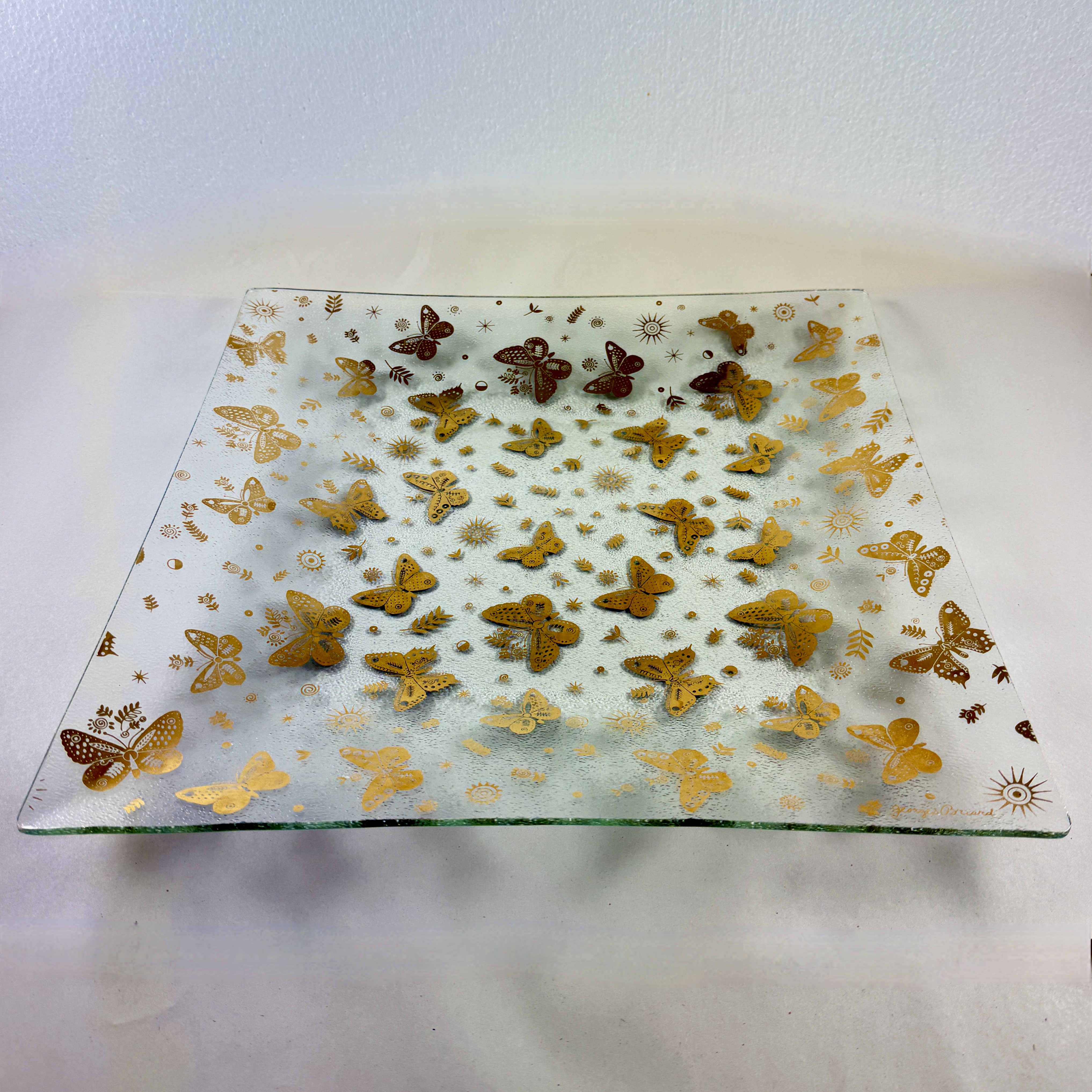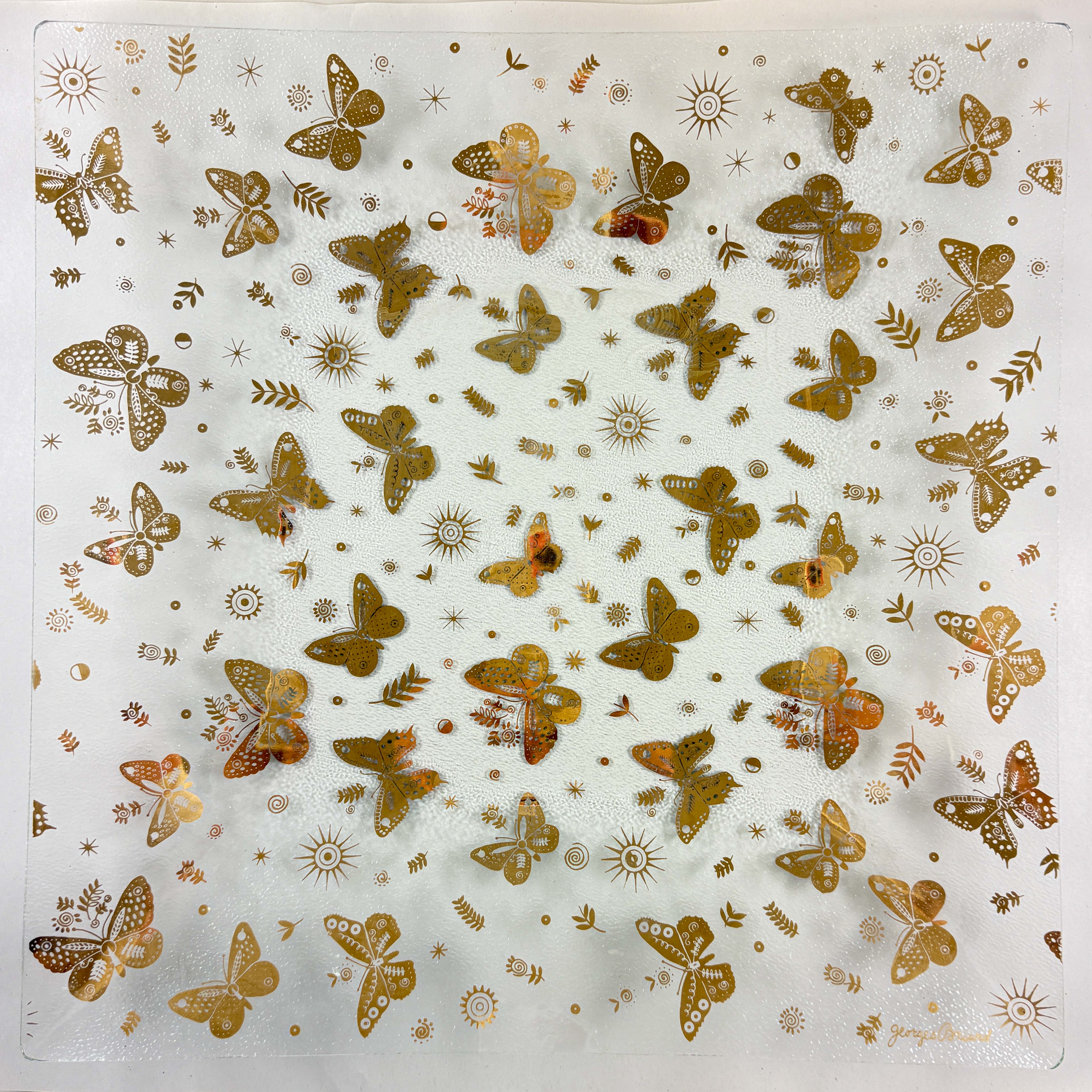 From the designer Georges Briard, and from the Butterfly collection, a large square pebbled glass and gold leaf platter, circa 1969.