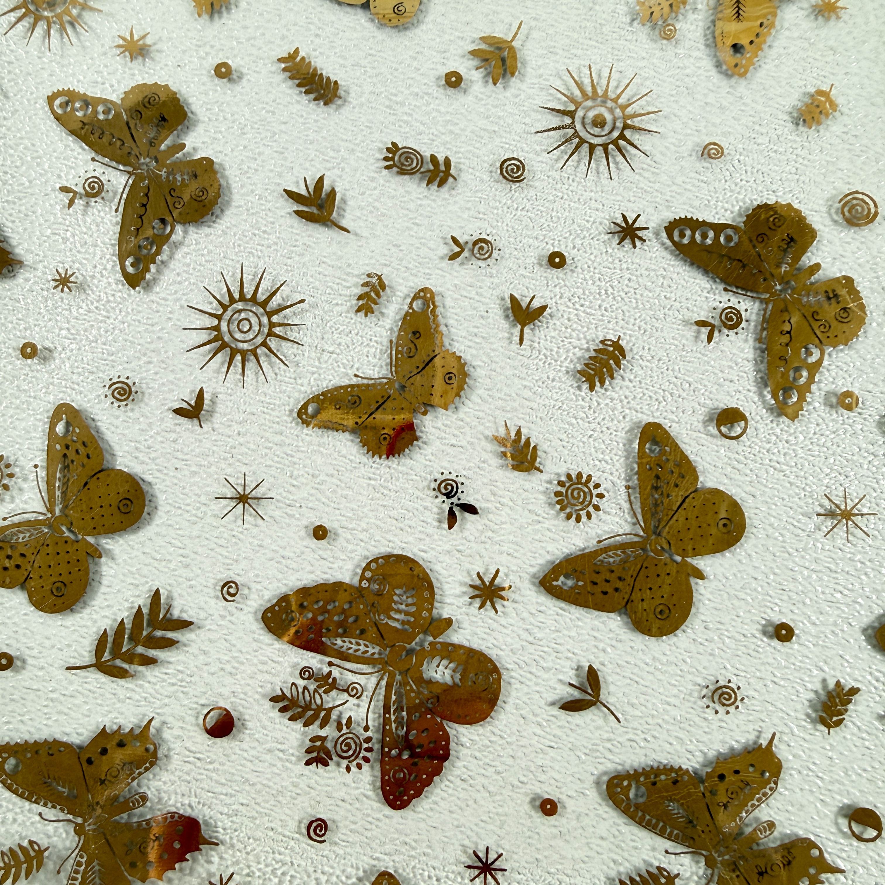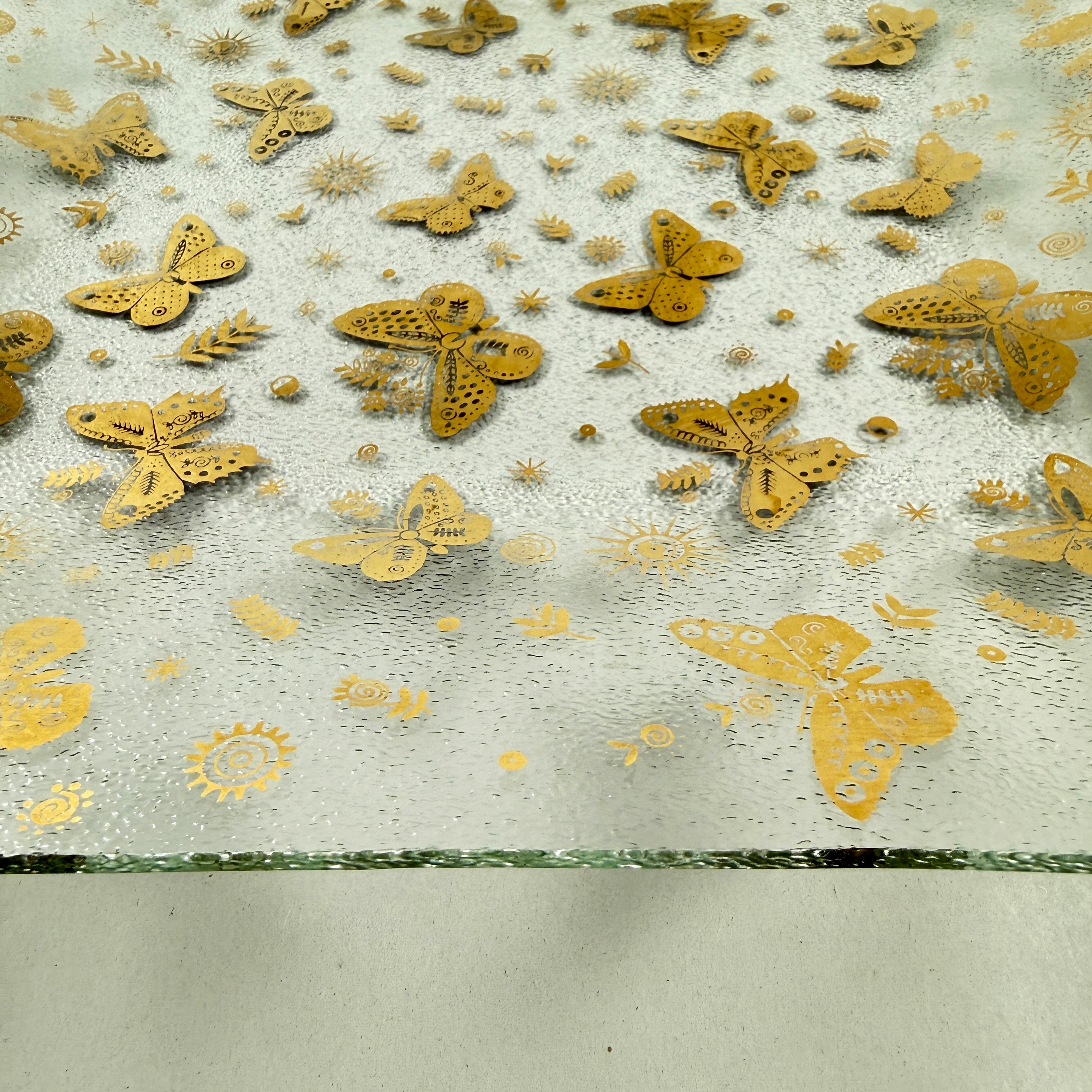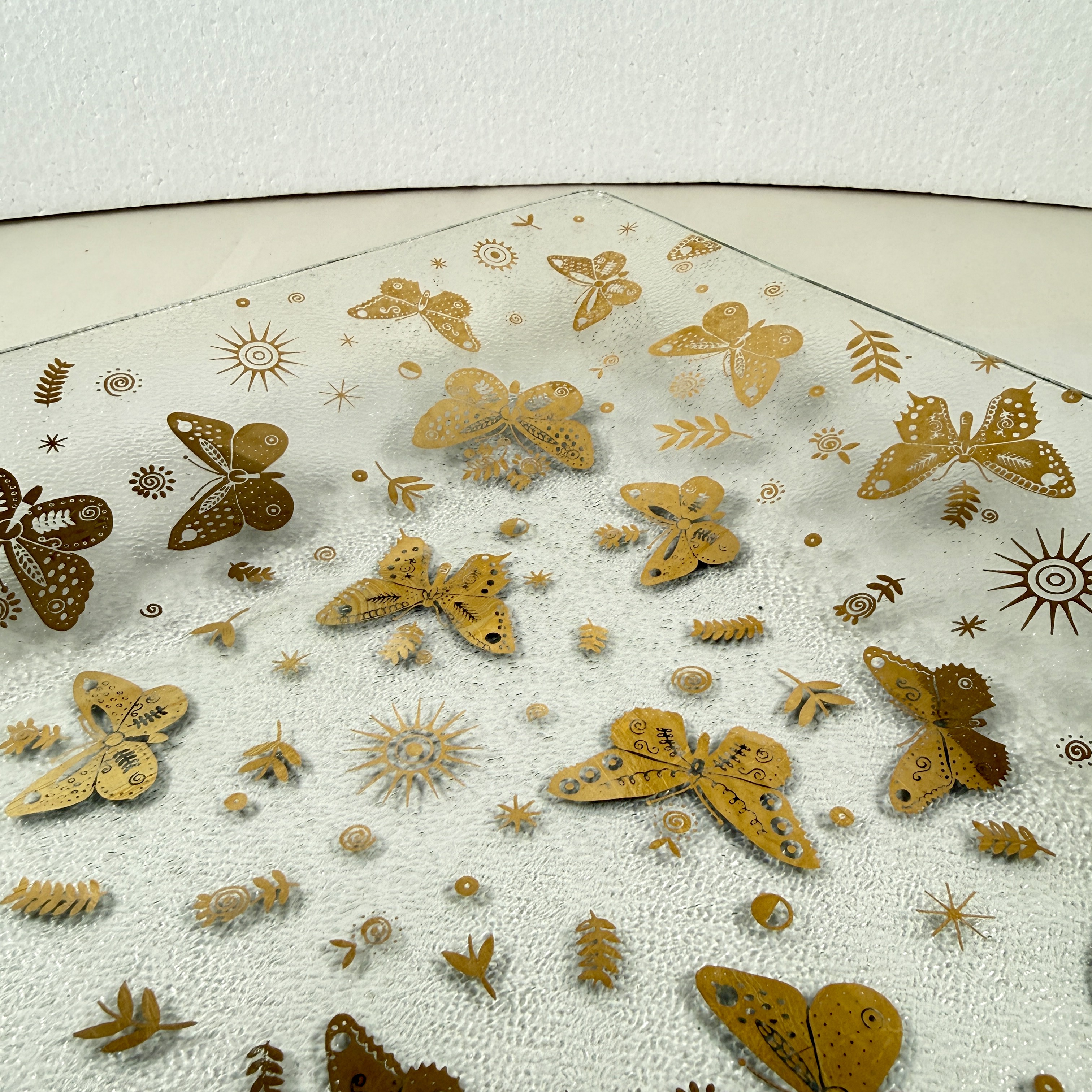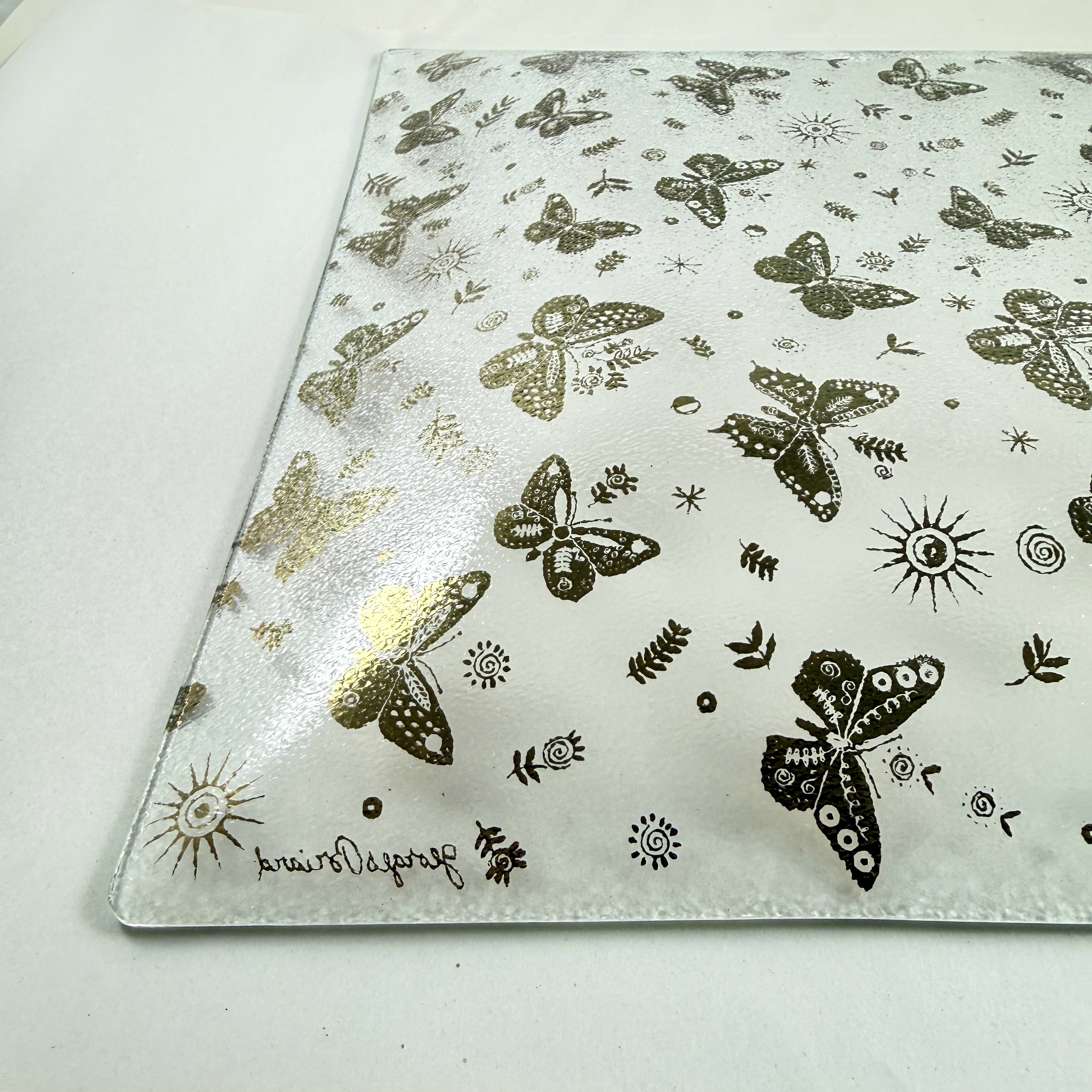 From the designer Georges Briard, and from the Butterfly collection, a large square pebbled glass and gold leaf platter, circa 1969.