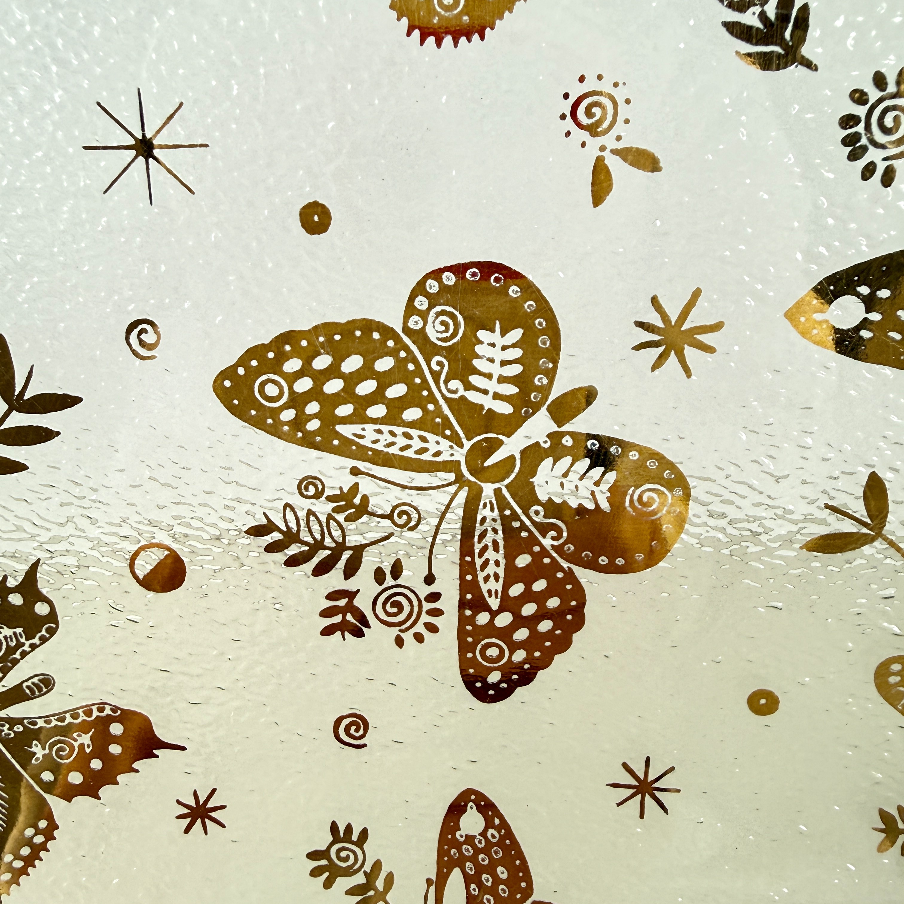Georges Briard created his Butterfly collection for his 1969 catalogue. The glassware serving pieces are considered Mid-Century Modern and feature a variety of gilded butterflies flying with smaller leaf and celestial motifs colored in gold on a pebbled transparent ground.