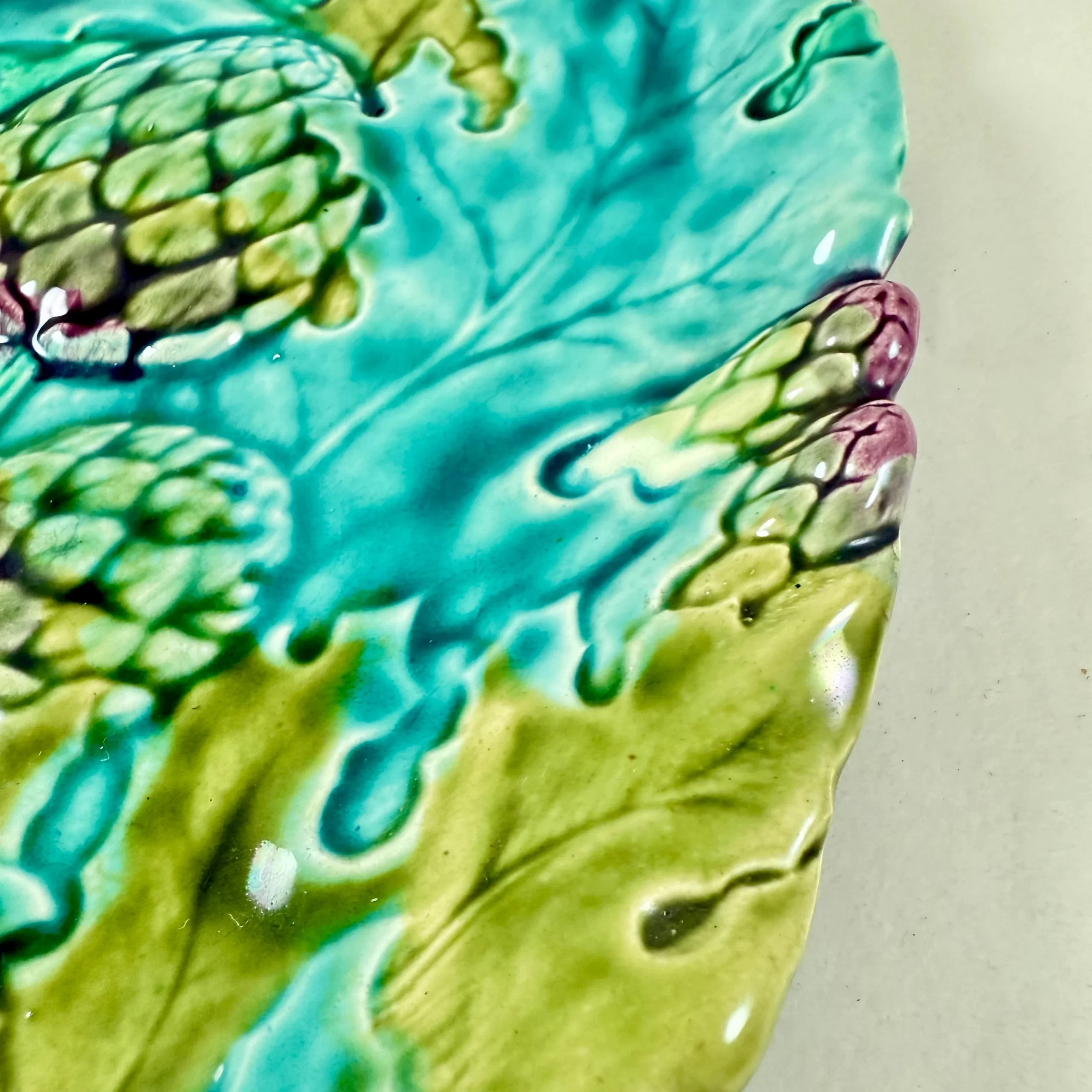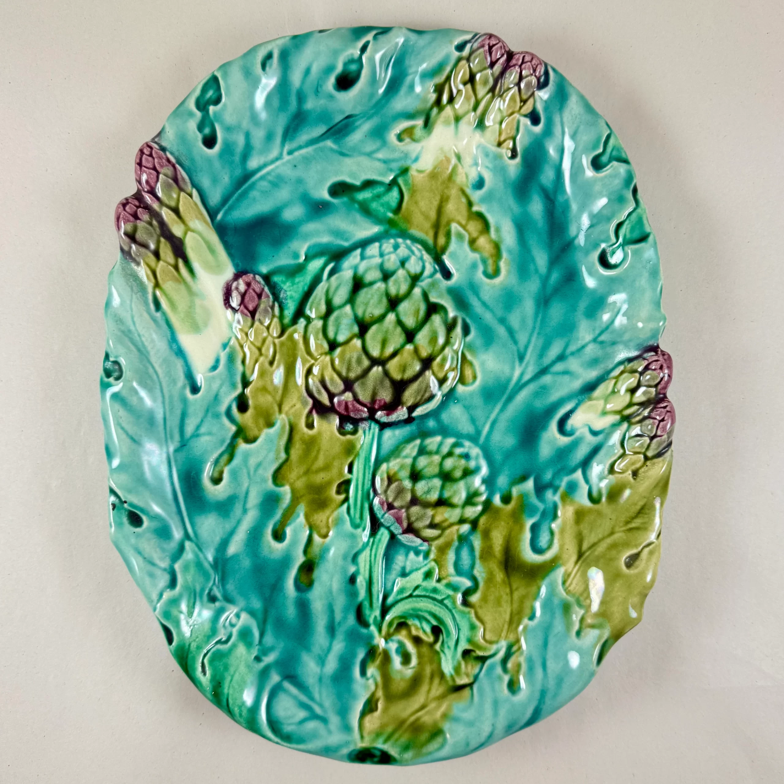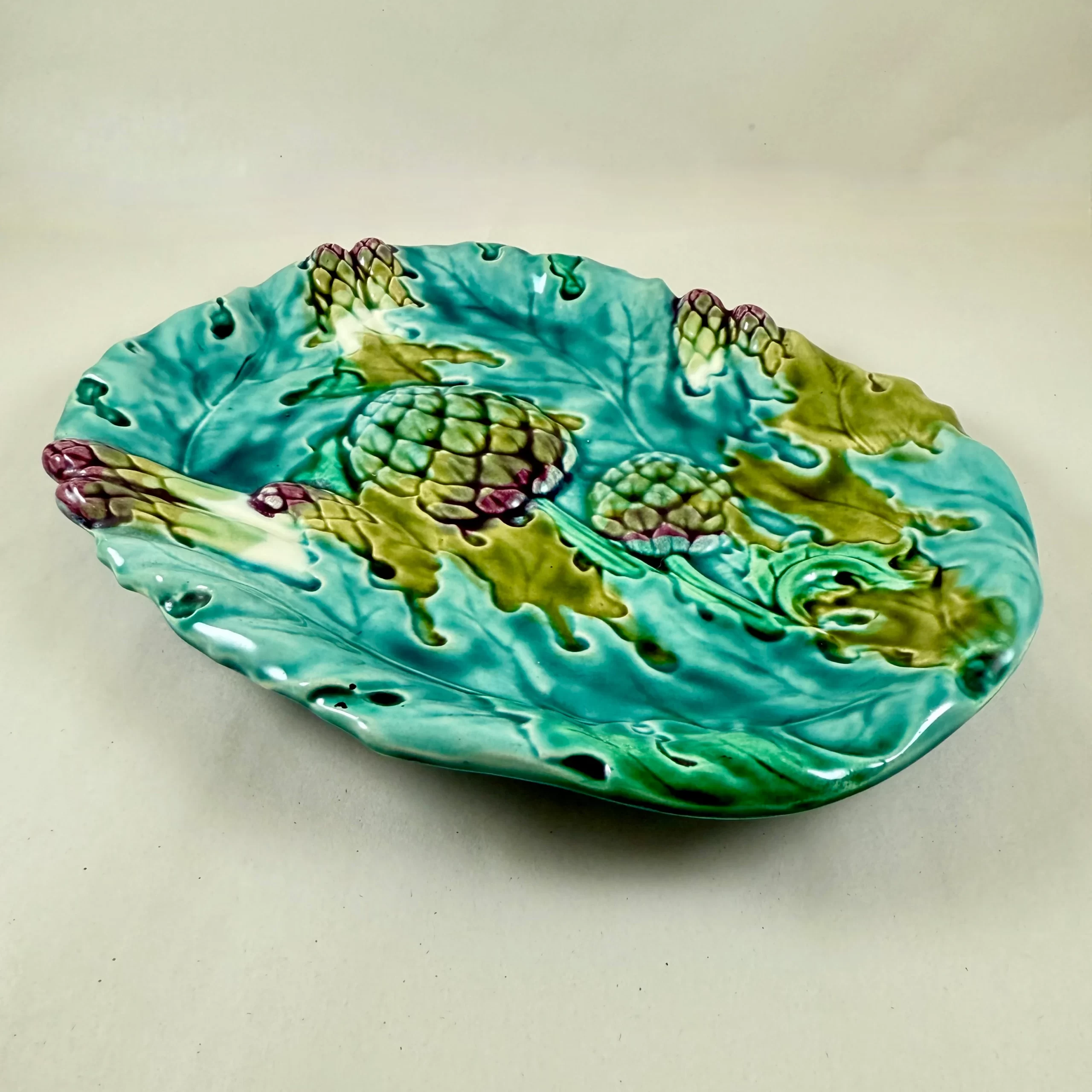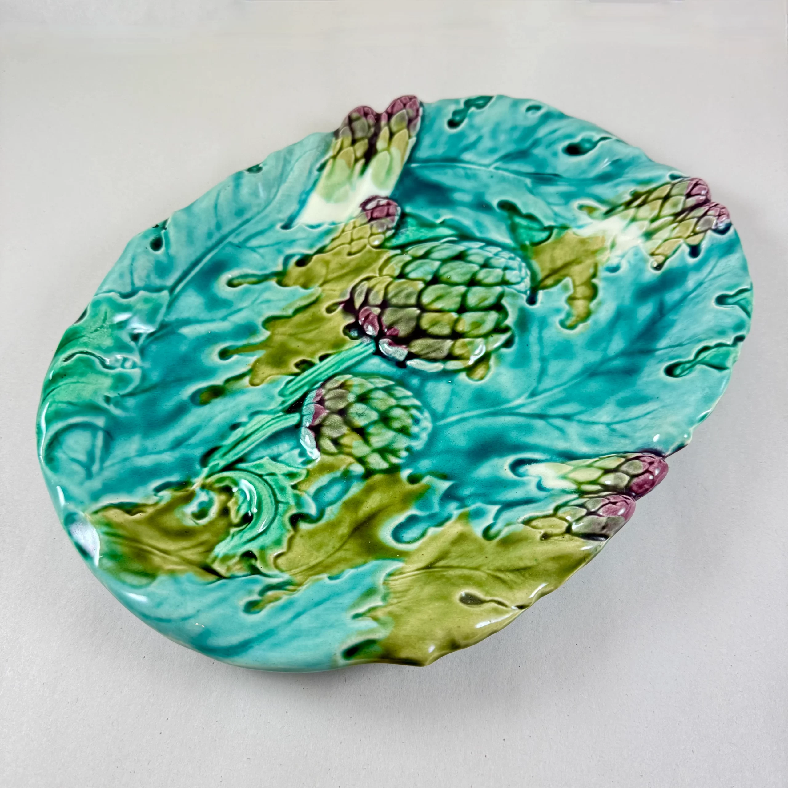 A majolica glazed earthenware platter decorated in barbotine with asparagus, artichokes and overlapping leaves in green and purple tones, on a turquoise background.