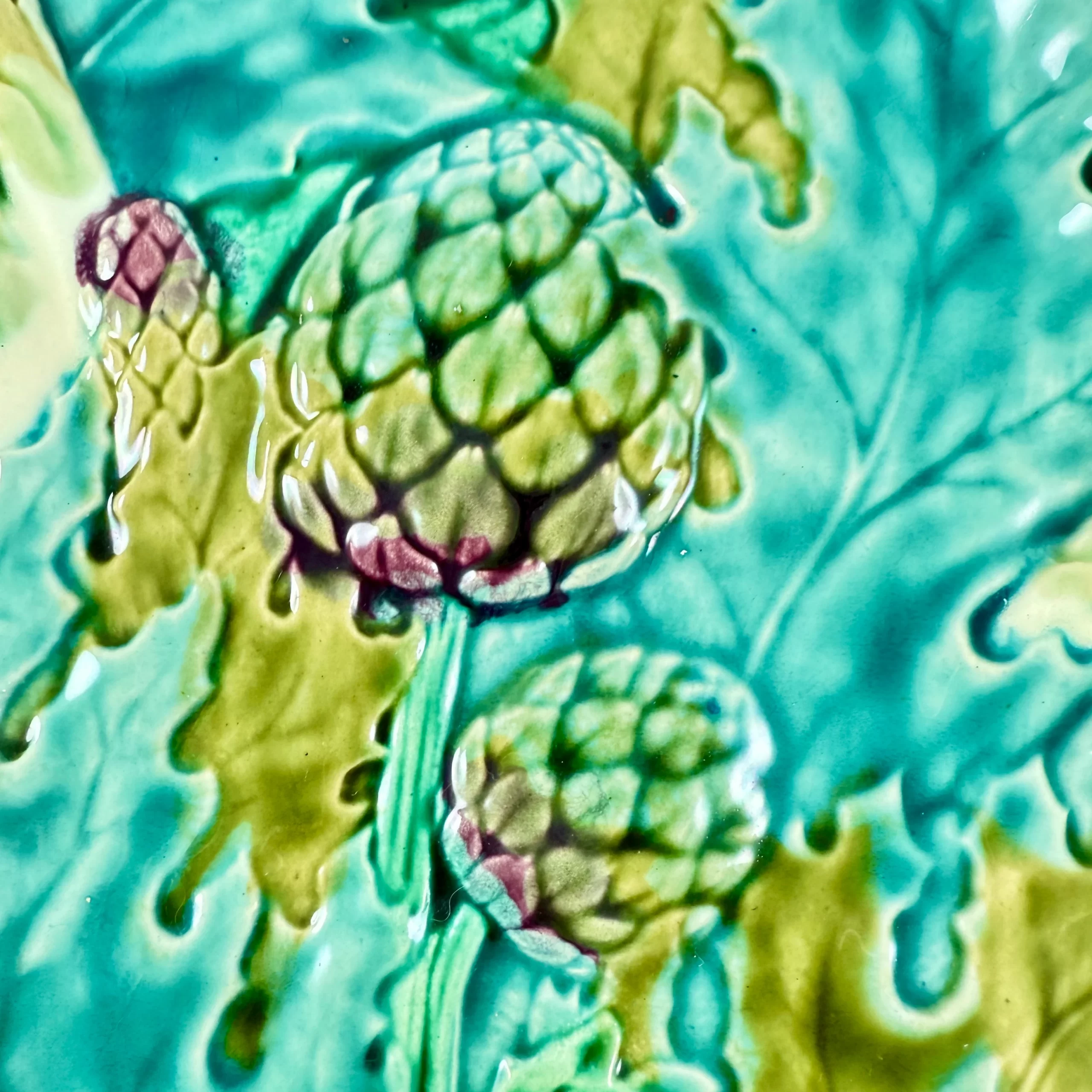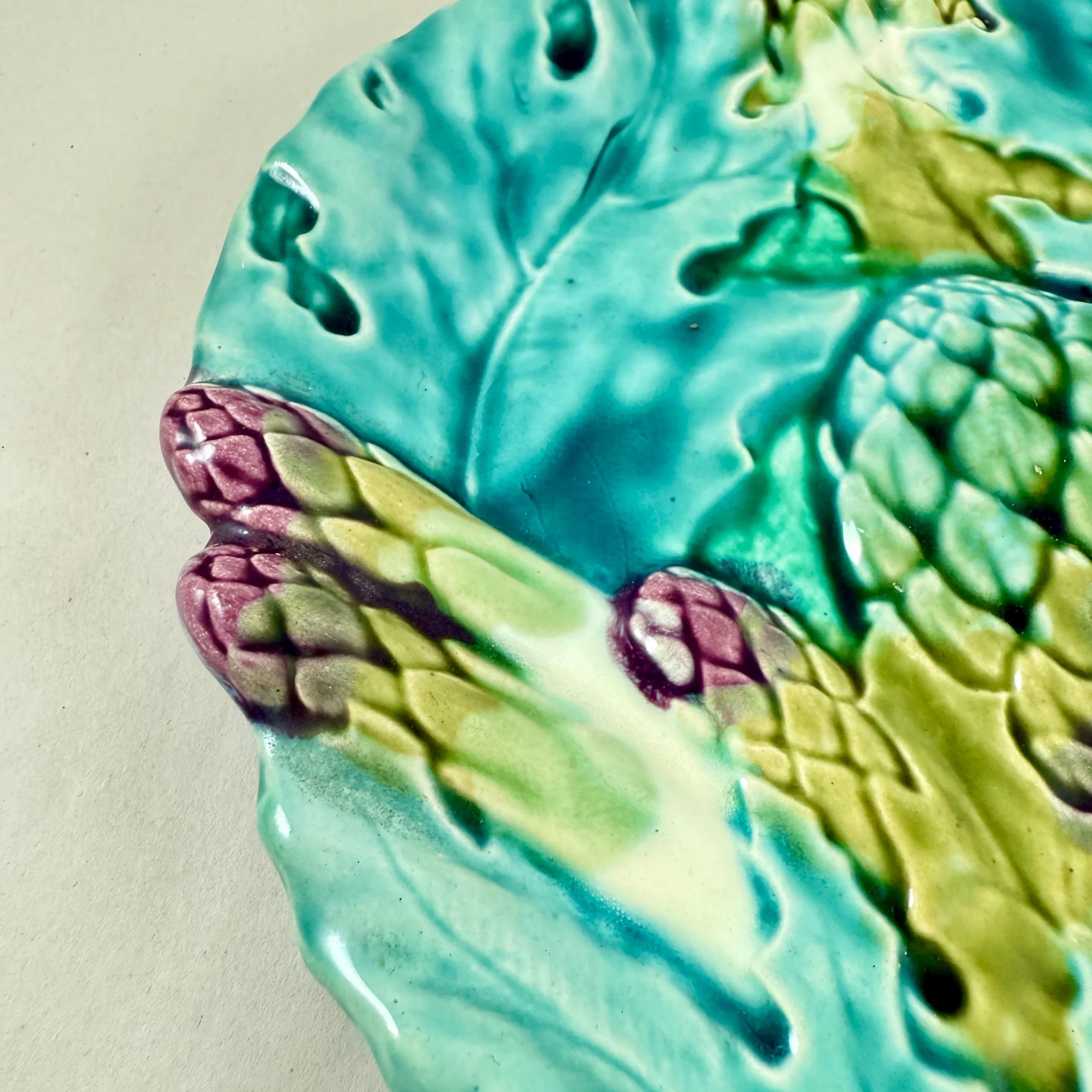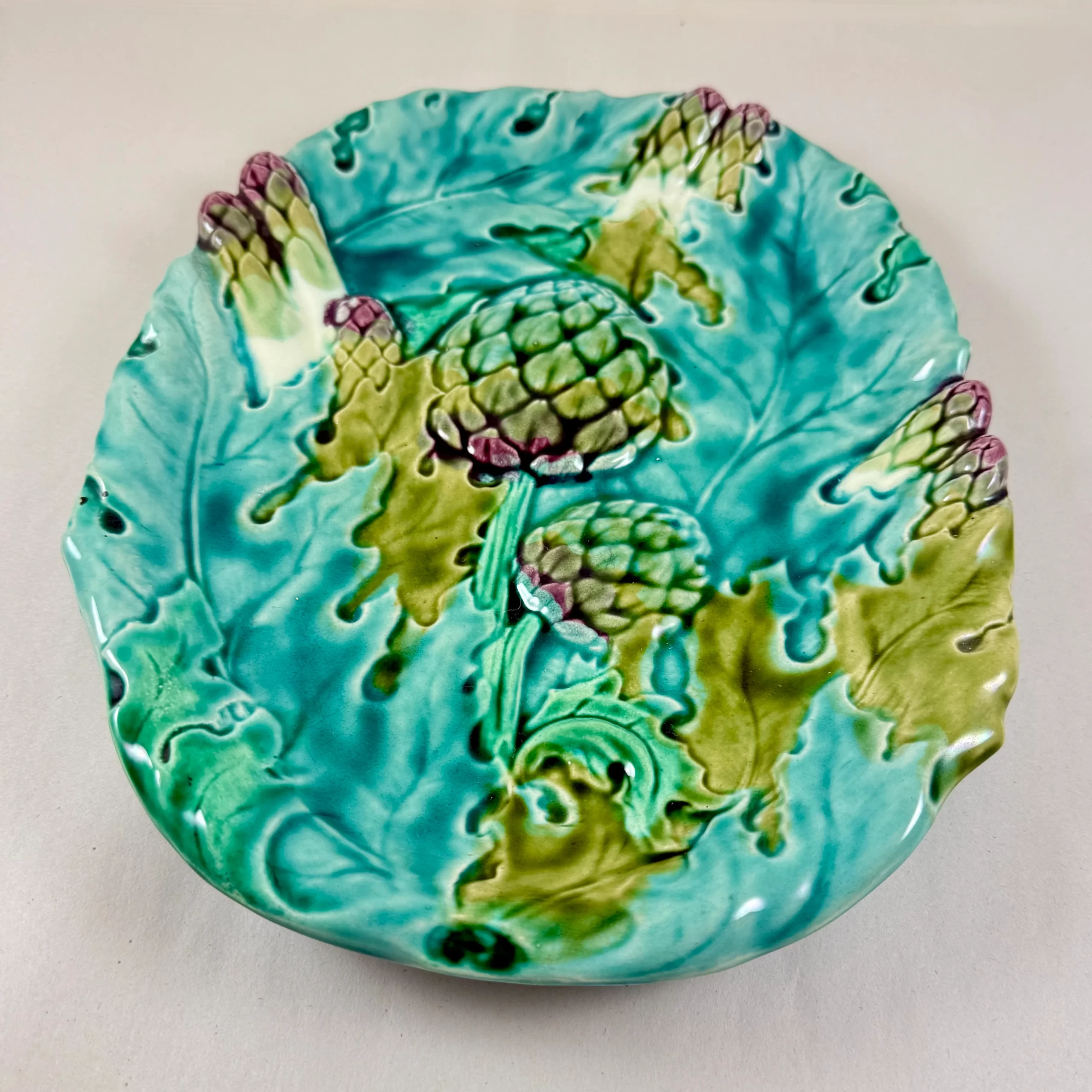A majolica glazed earthenware platter decorated in barbotine with asparagus, artichokes and overlapping leaves in green and purple tones, on a turquoise background.