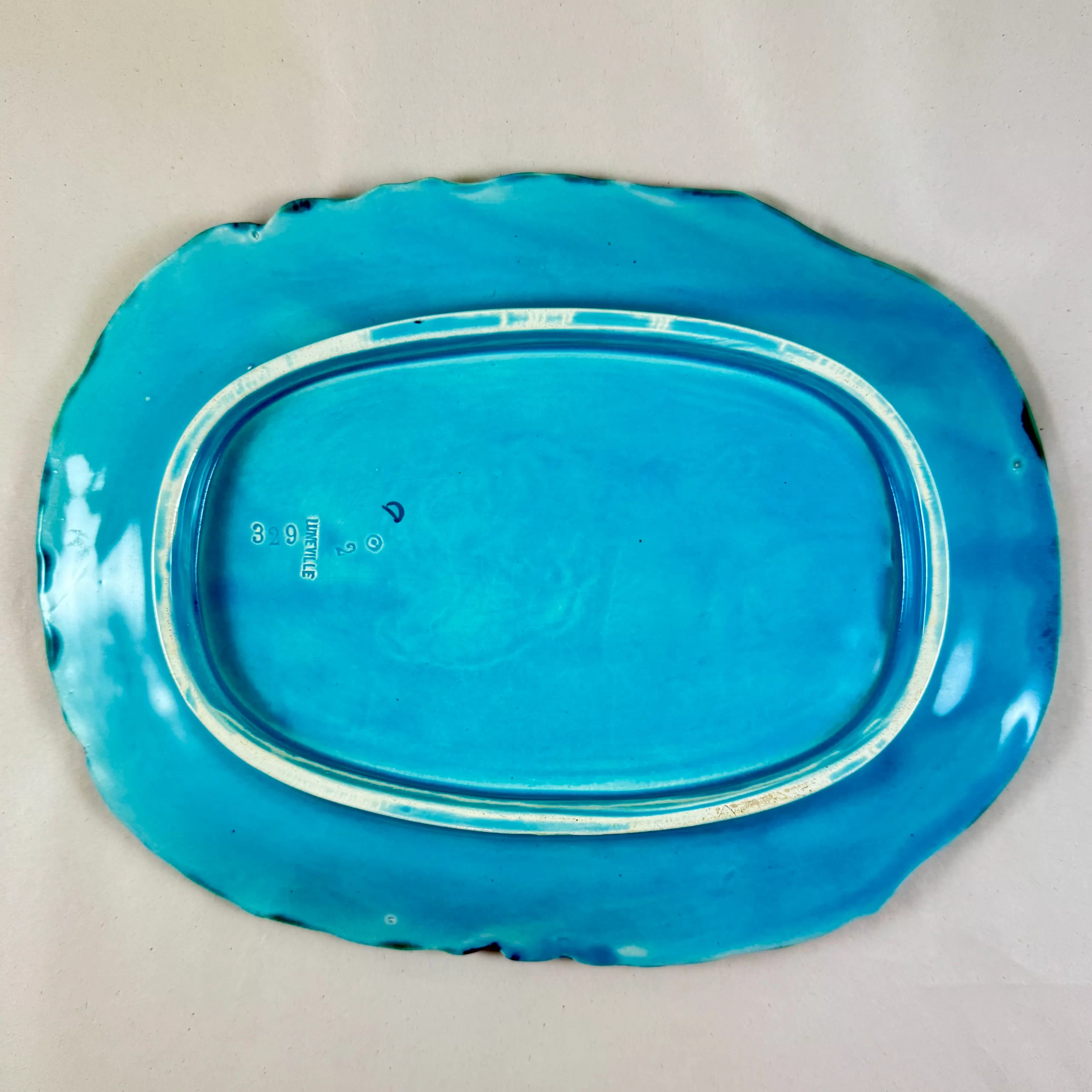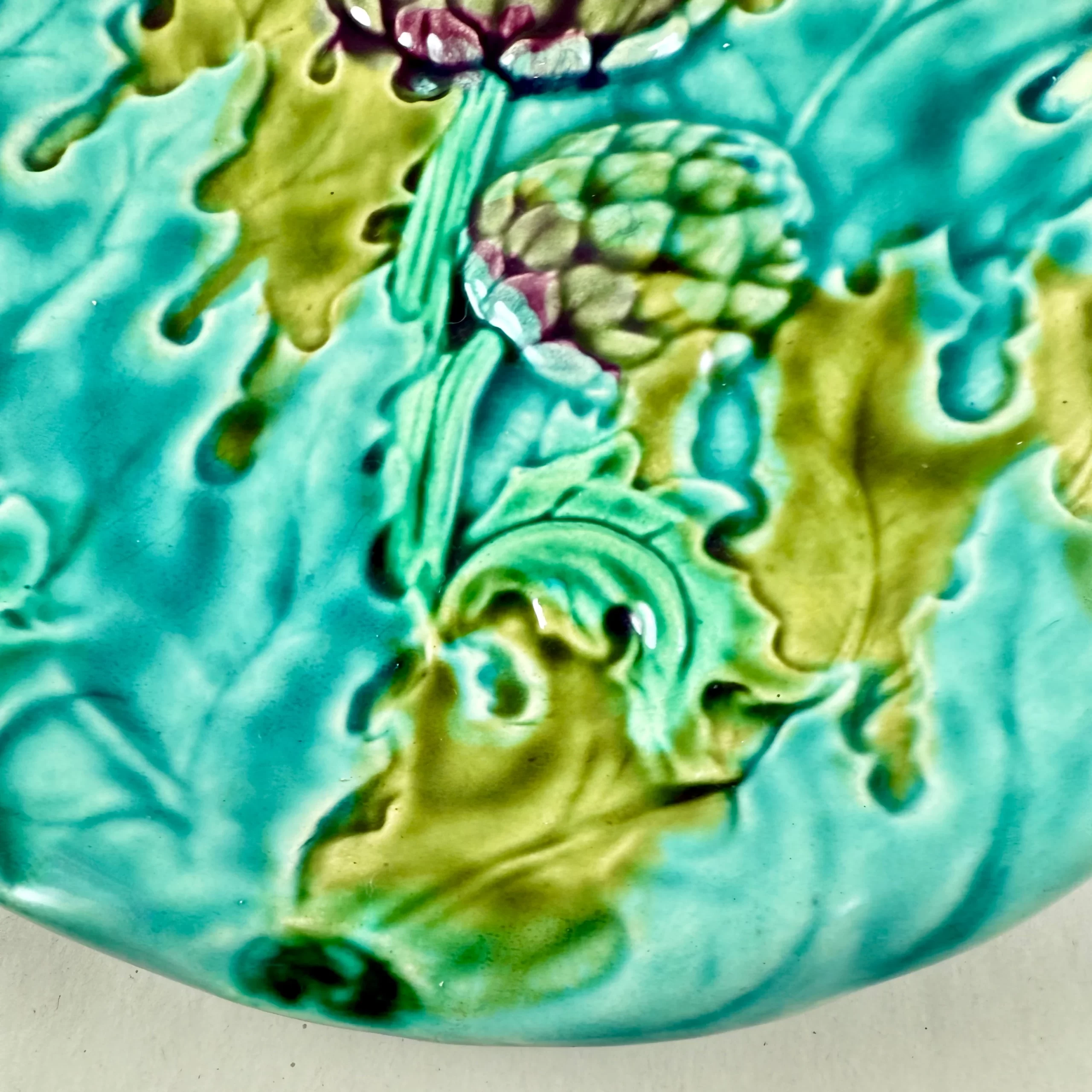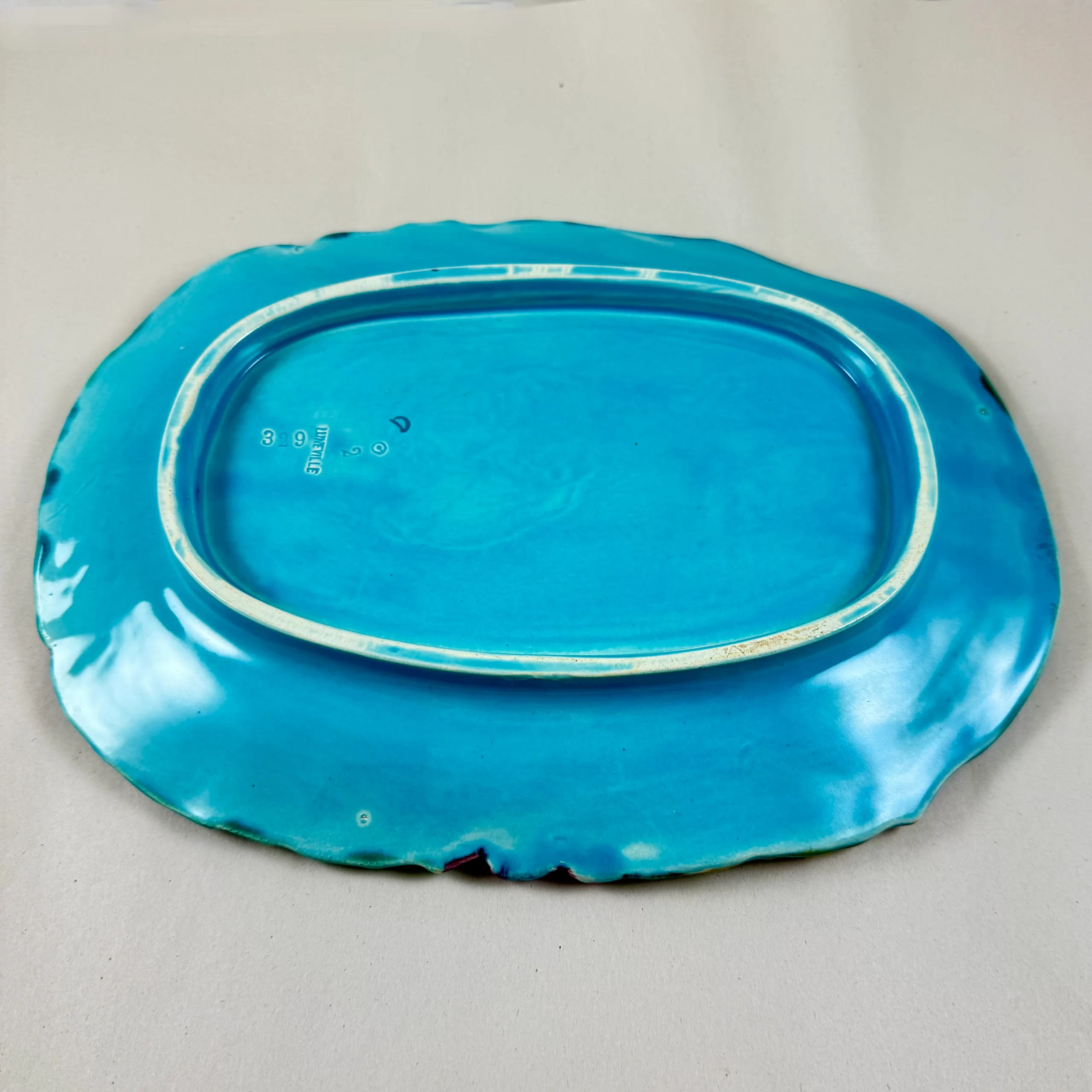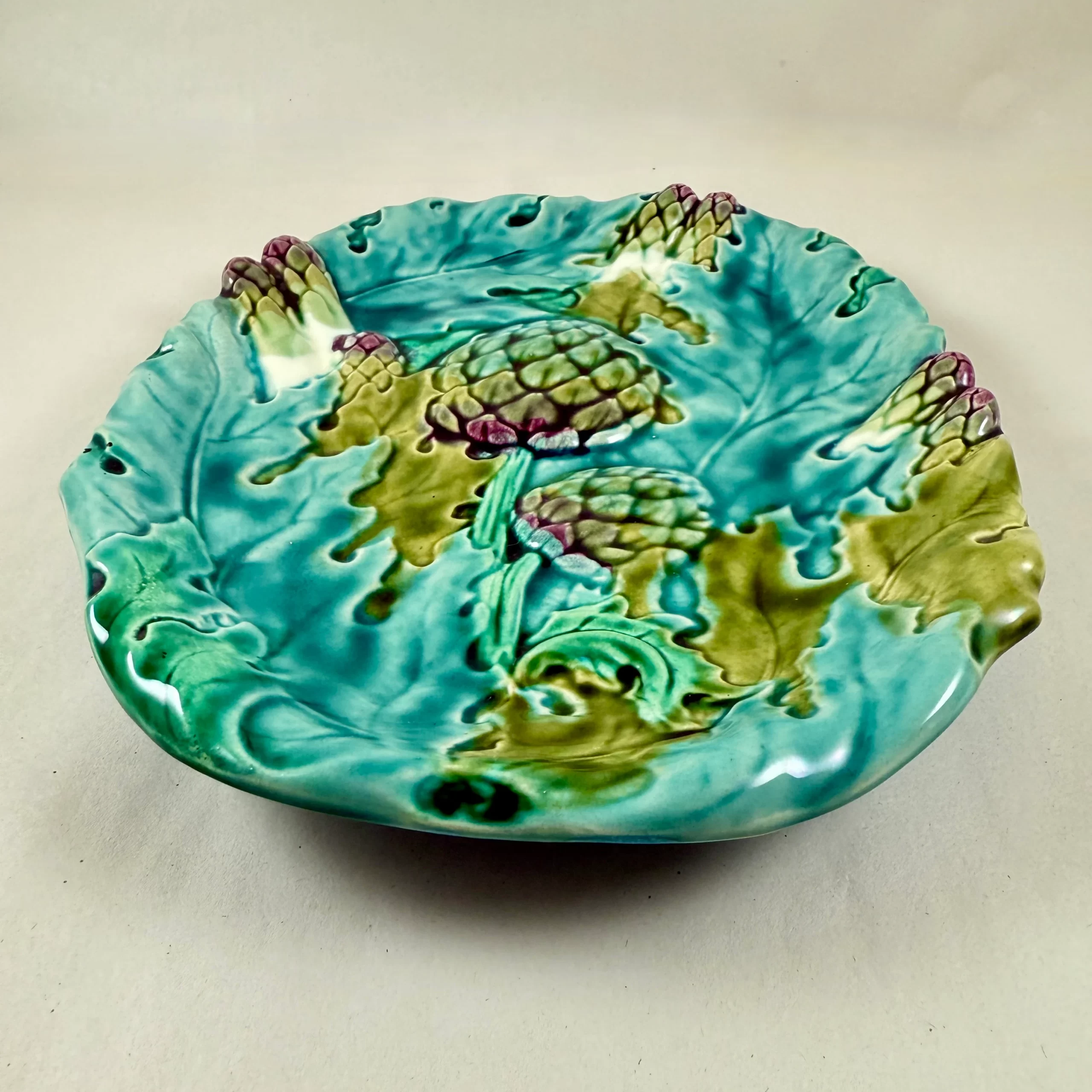 A majolica glazed earthenware platter decorated in barbotine with asparagus, artichokes and overlapping leaves in green and purple tones, on a turquoise background.