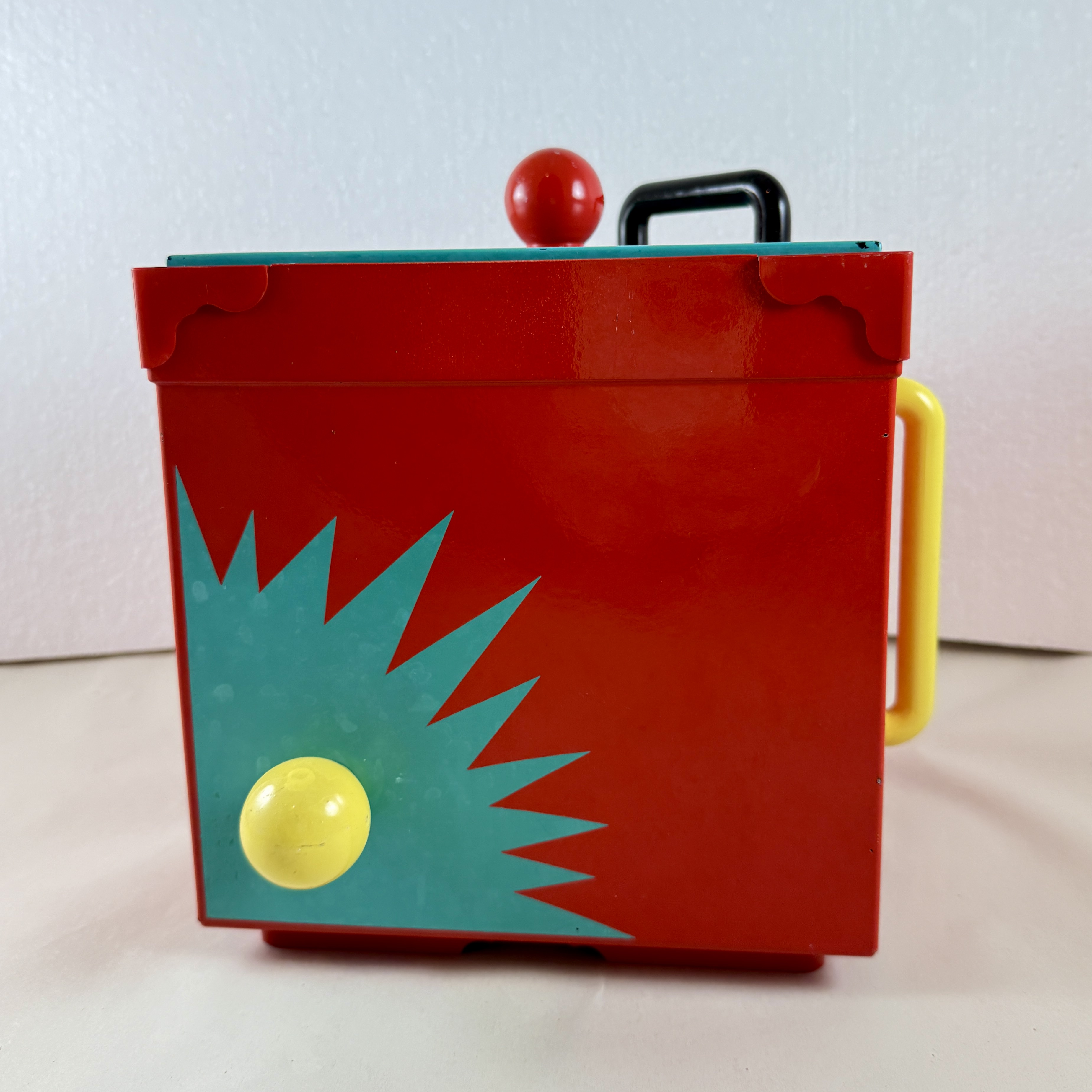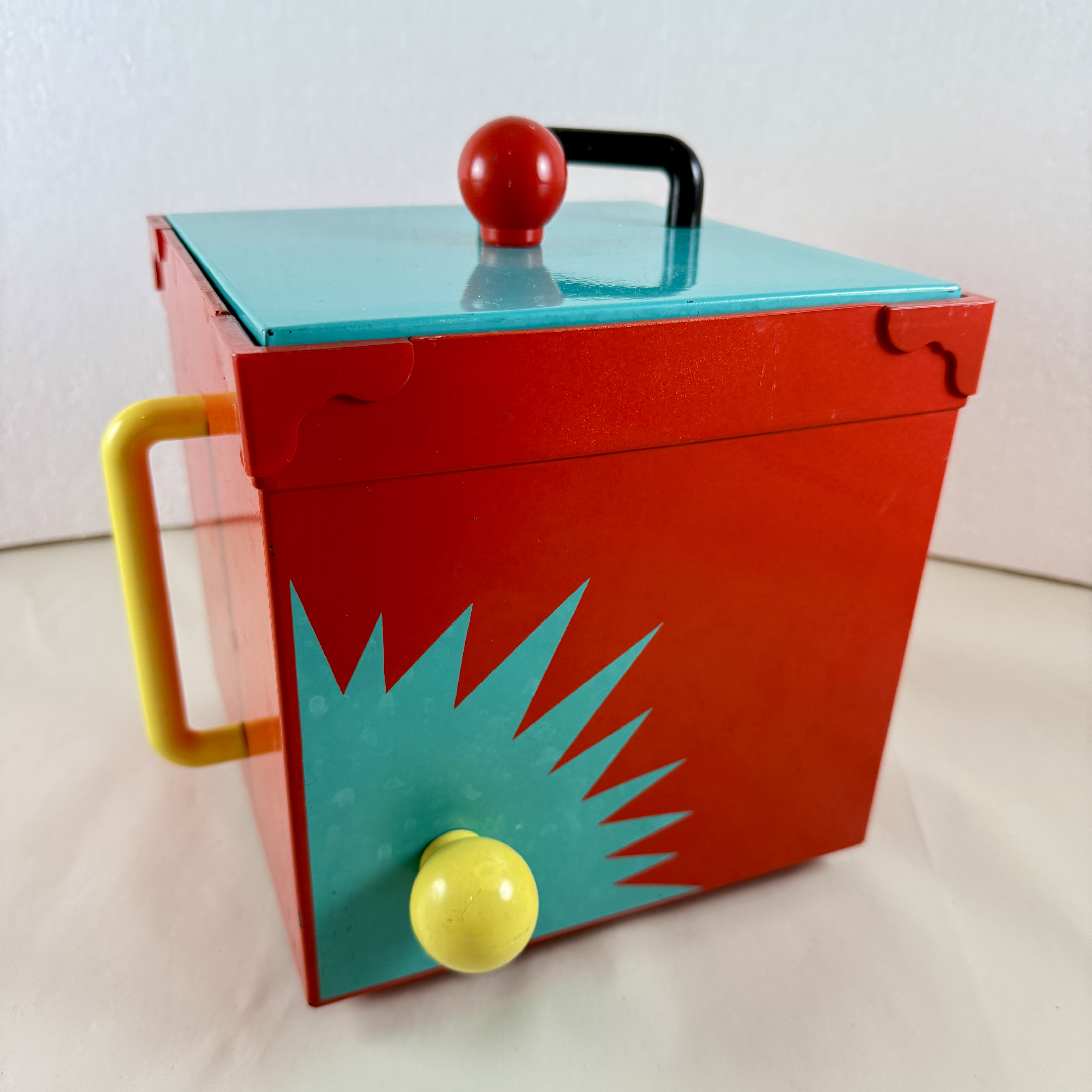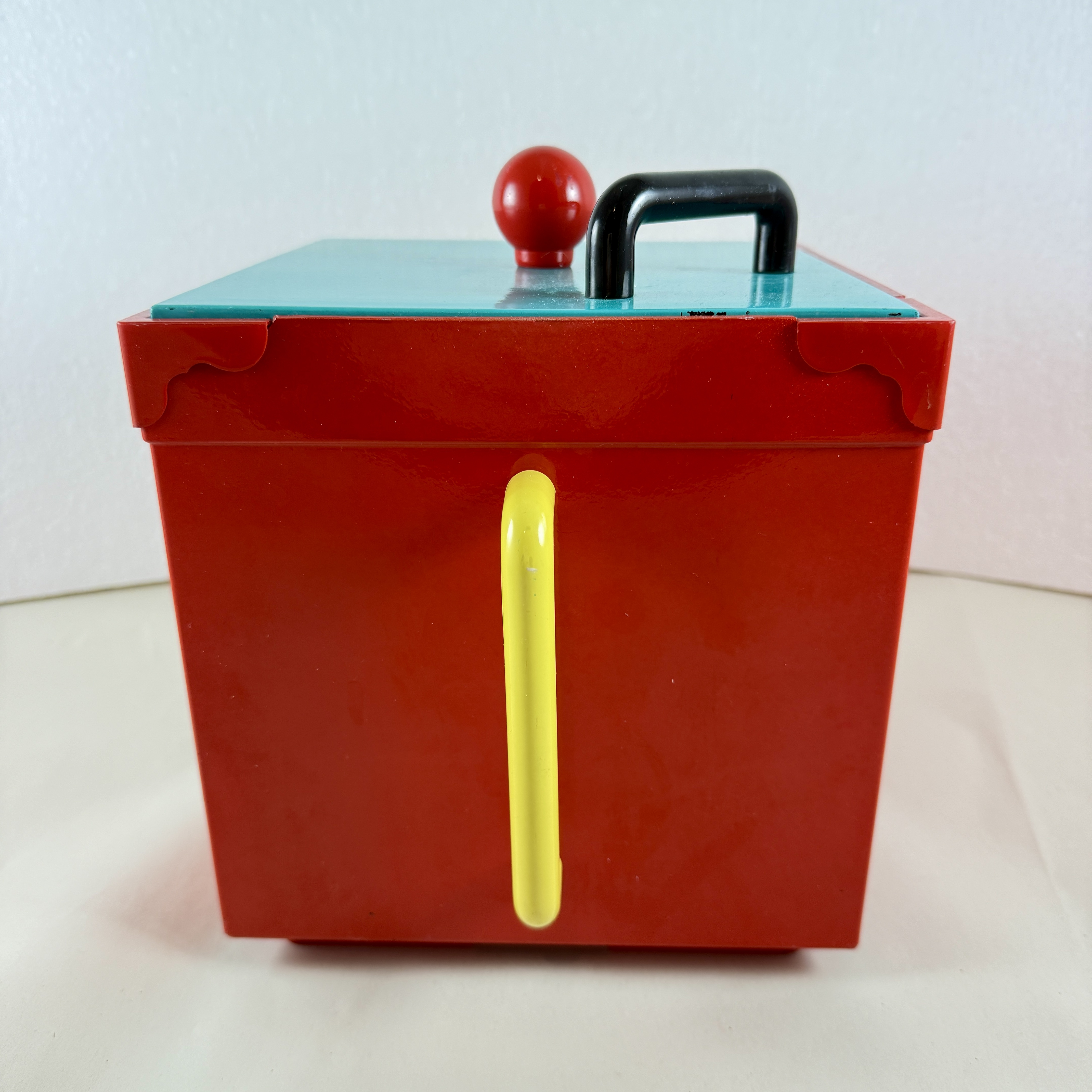 A bright red square shaped bucket with a turquoise lid is decorated with knobs and handles in yellow, red, and black.
