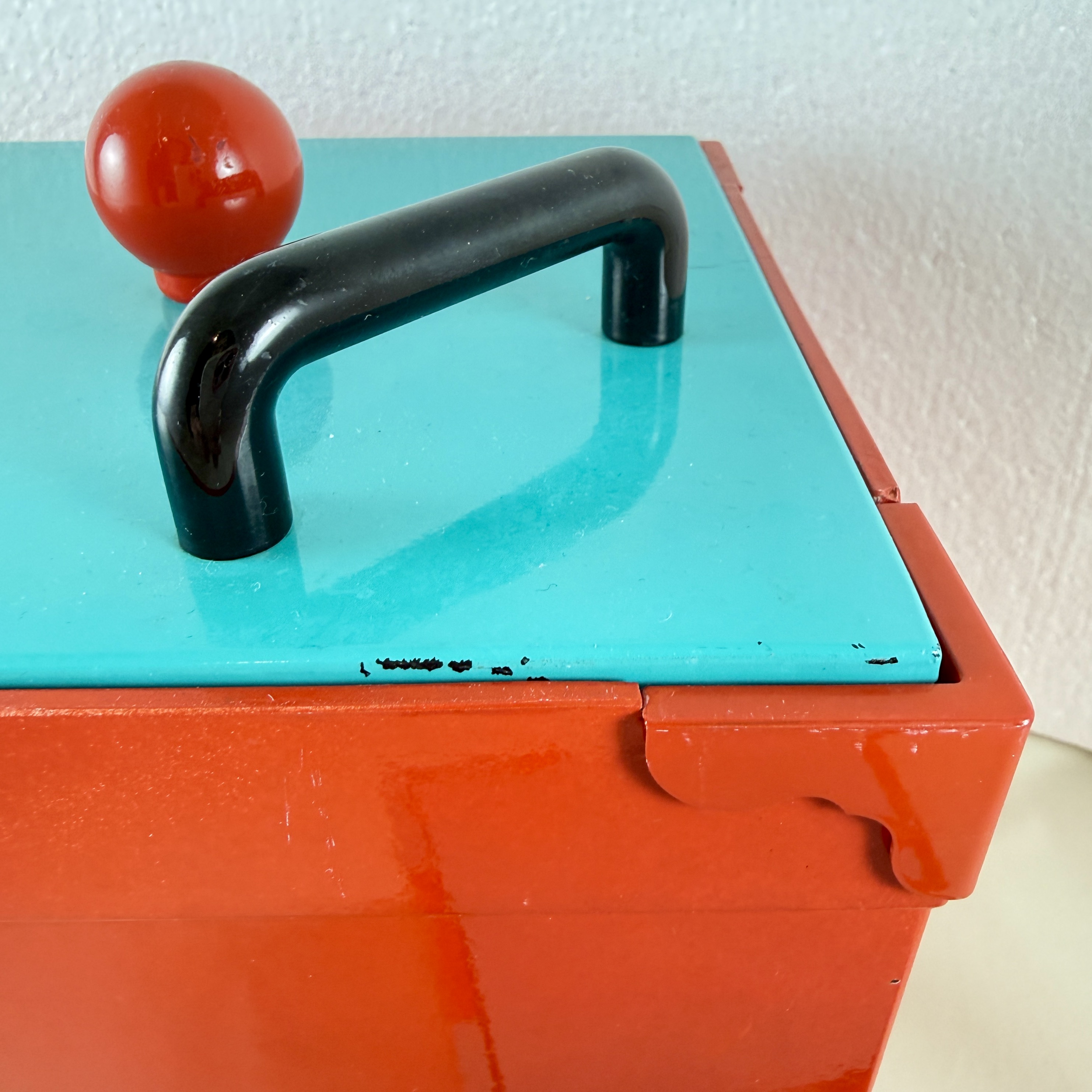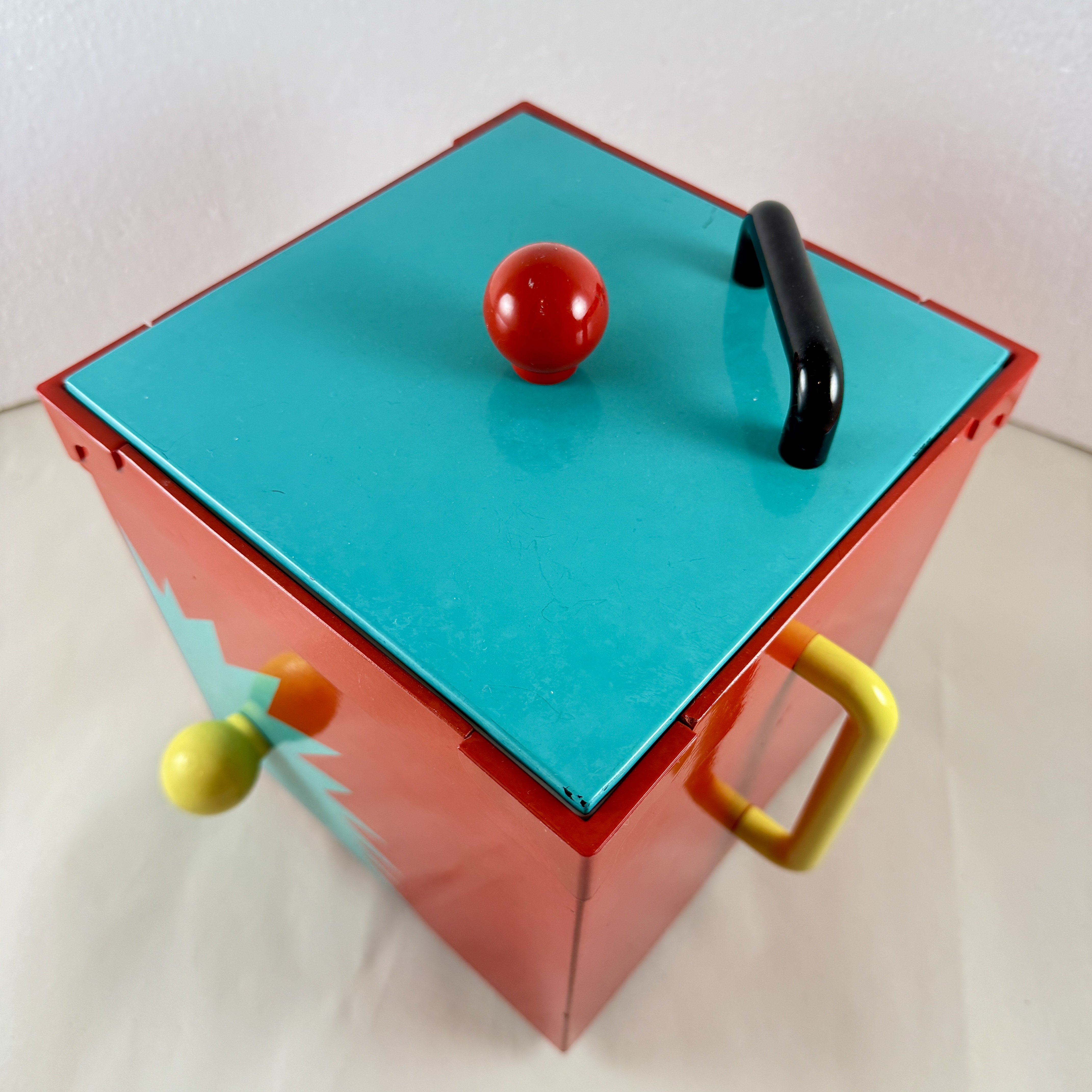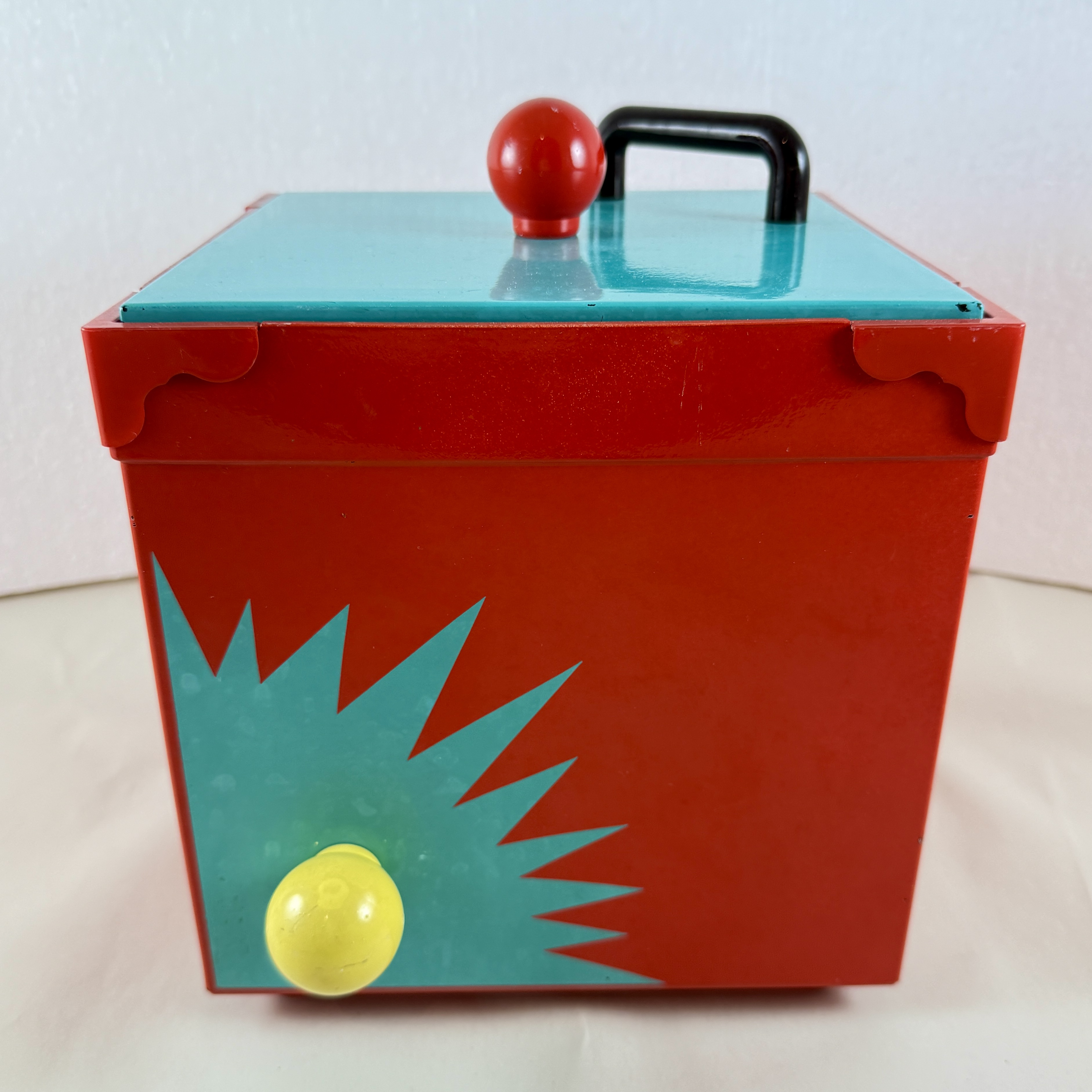 A bright red square shaped bucket with a turquoise lid is decorated with knobs and handles in yellow, red, and black.