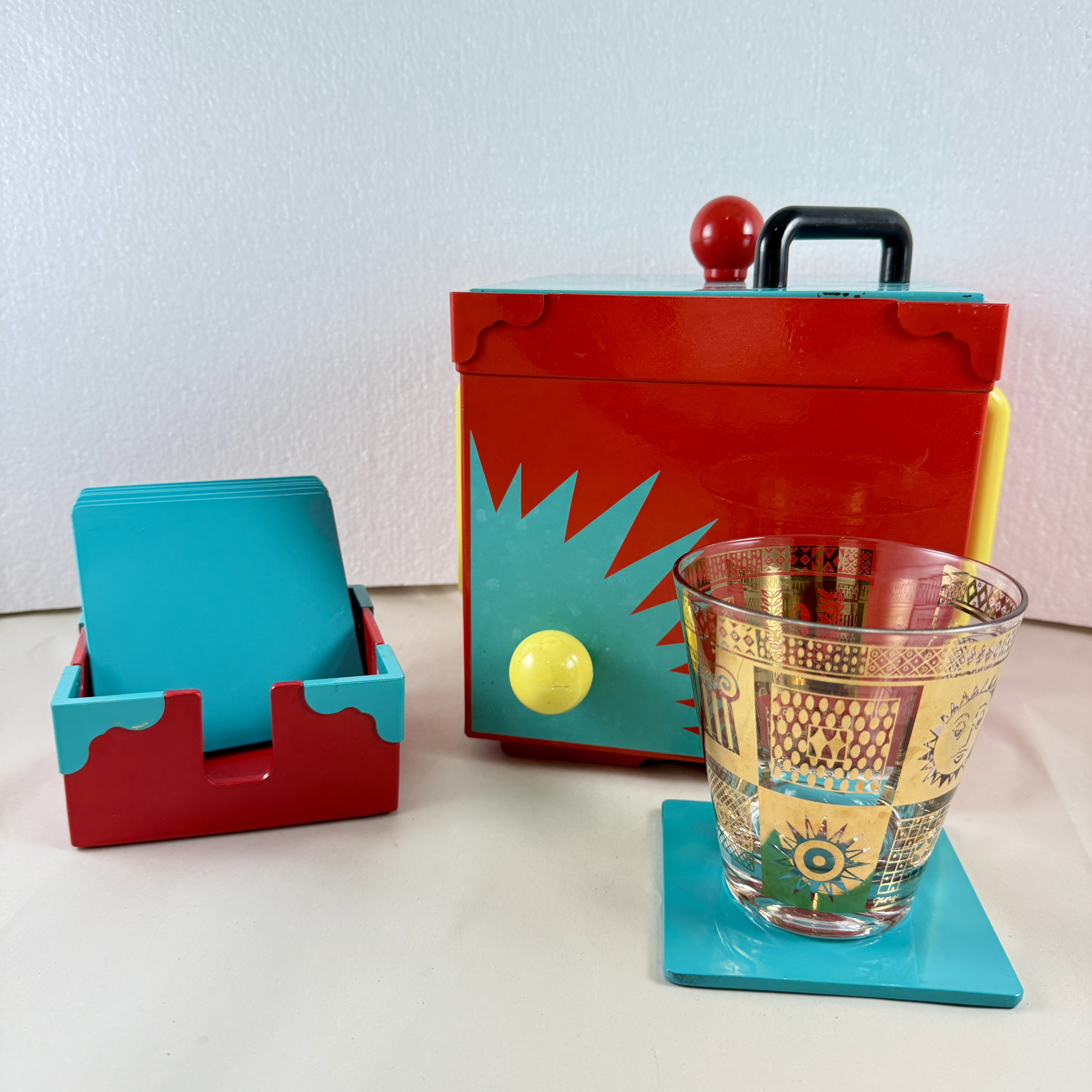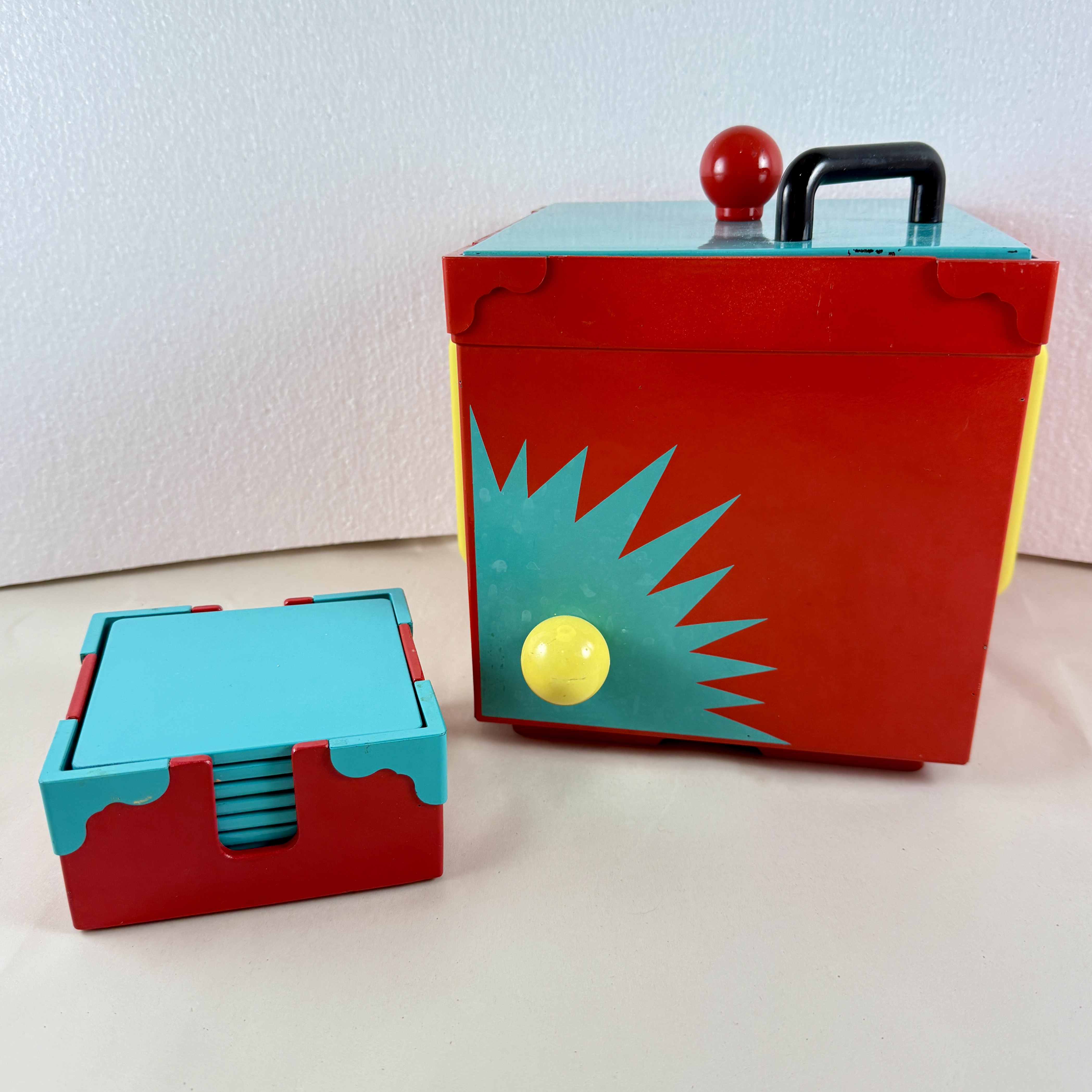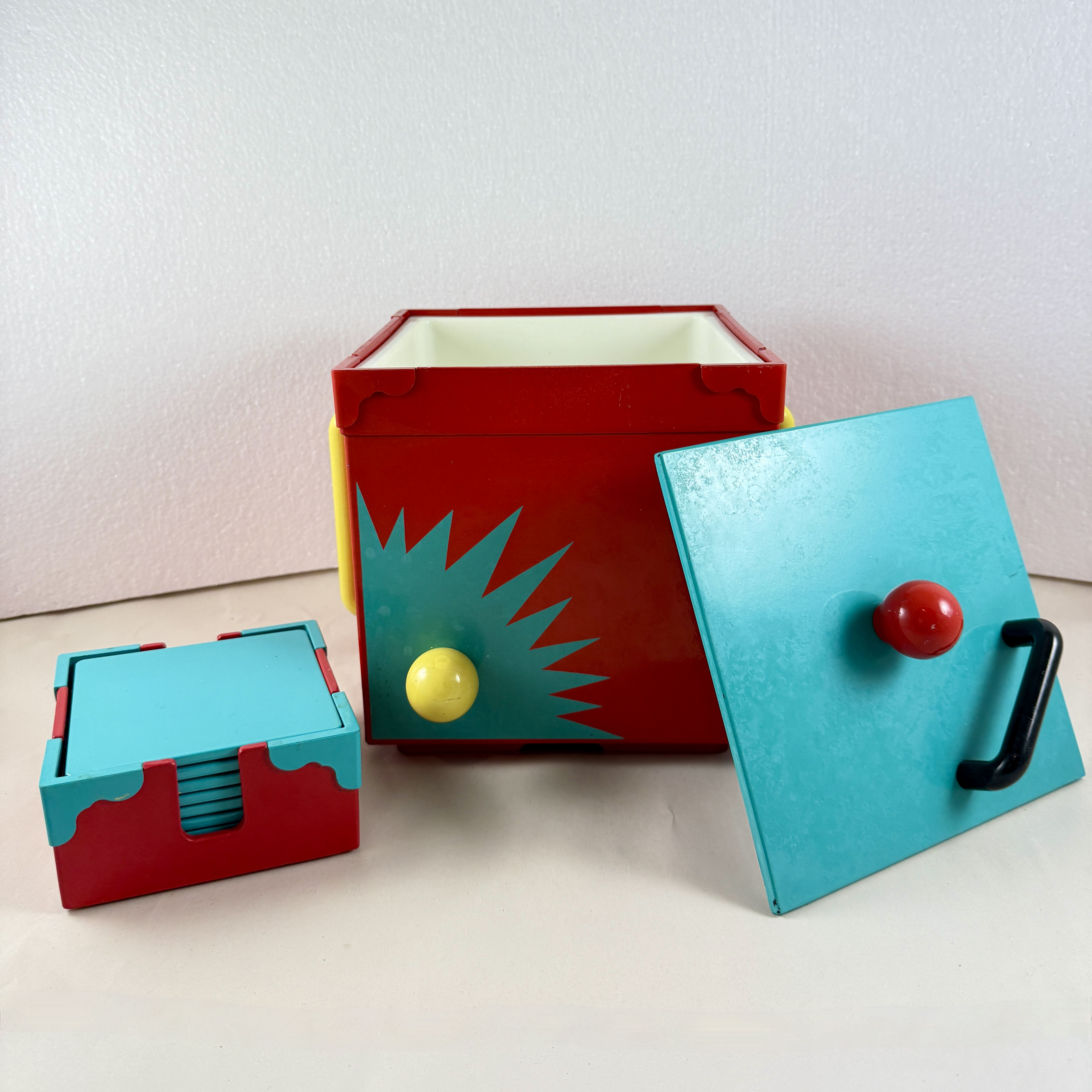 A Georges Briard Memphasis plastic-lacquer ice bucket in the Sunburst pattern, along with the corresponding coaster set, inspired by the Memphis Art Movement, produced in Japan, 1985.