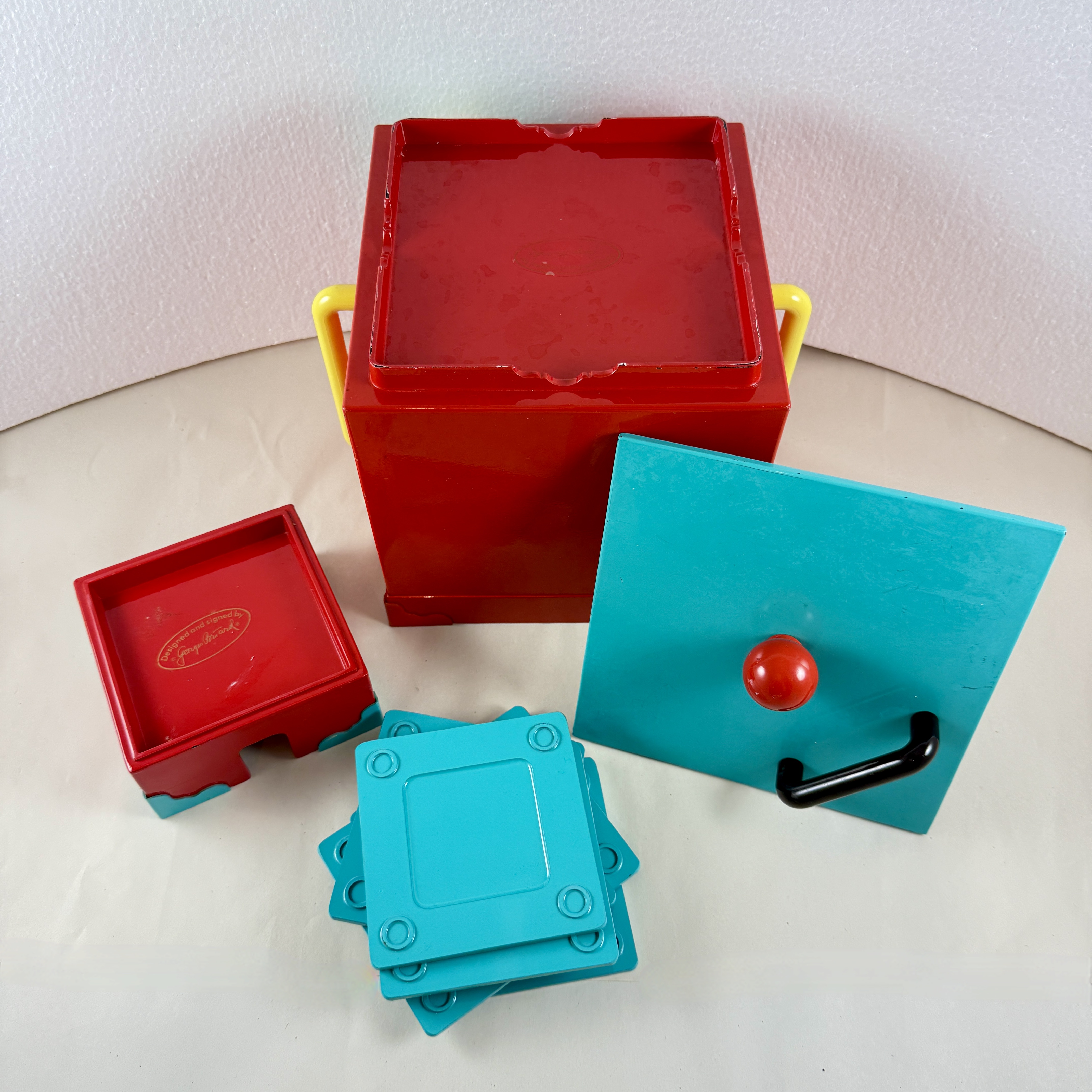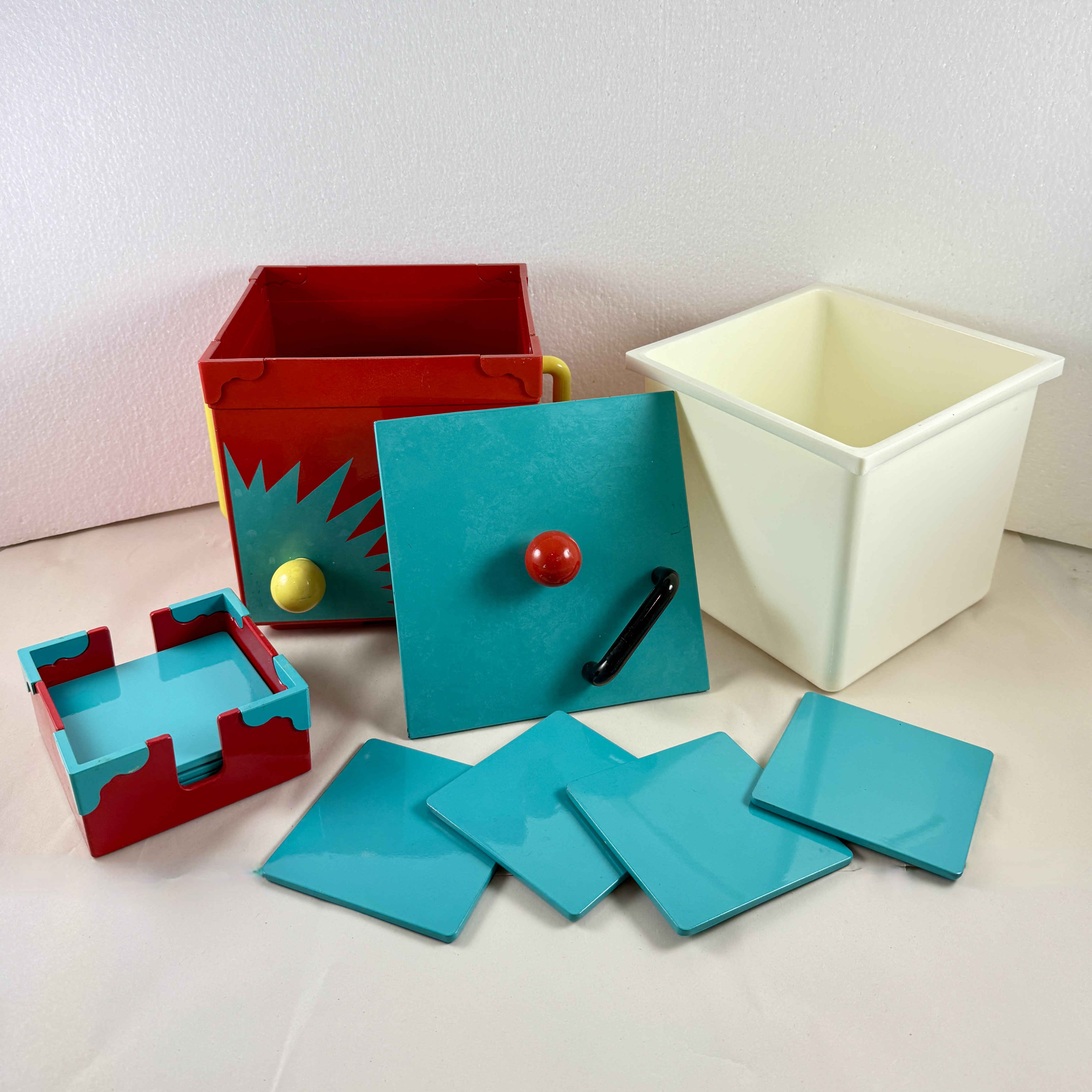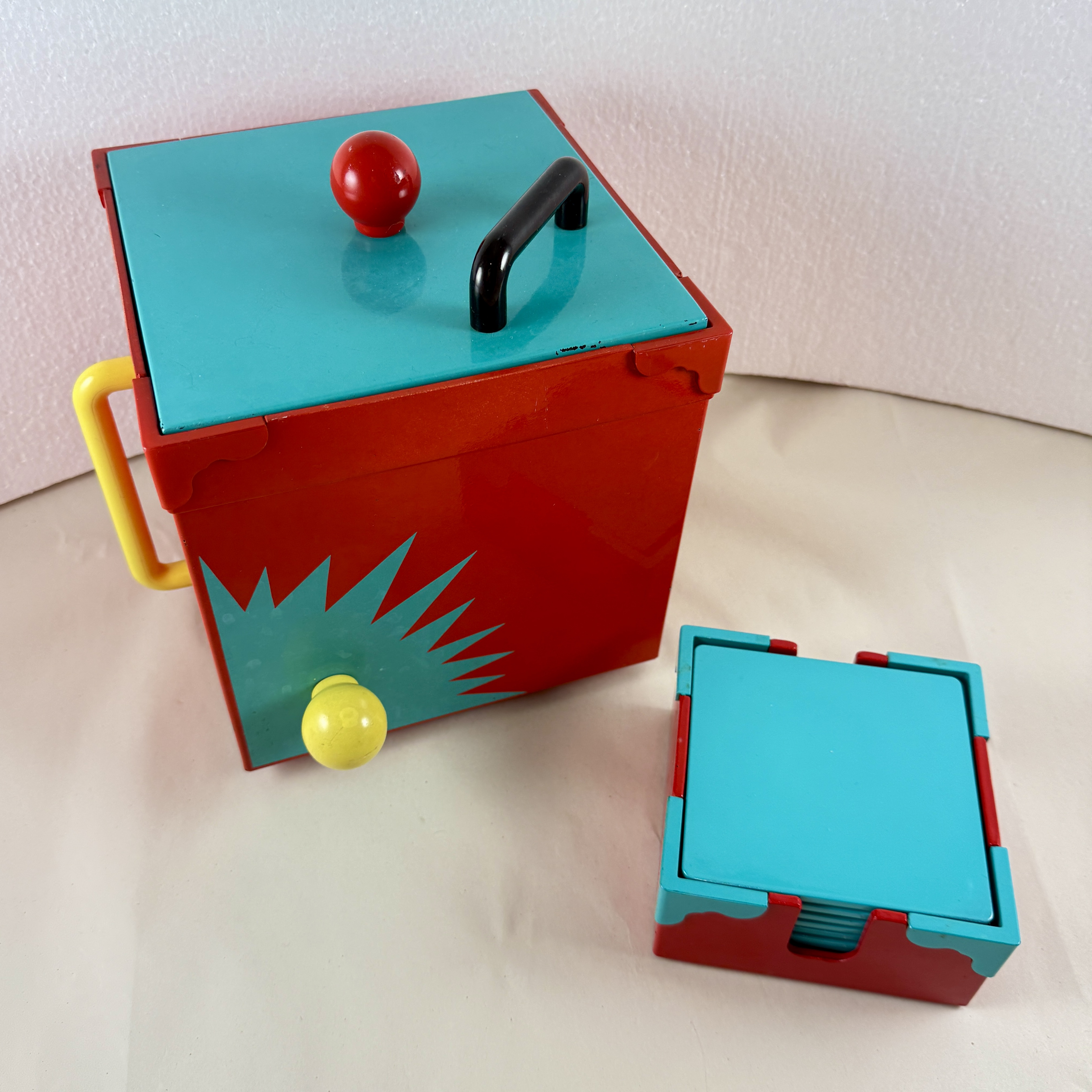 A Georges Briard Memphasis plastic-lacquer ice bucket in the Sunburst pattern, along with the corresponding coaster set, inspired by the Memphis Art Movement, produced in Japan, 1985.
