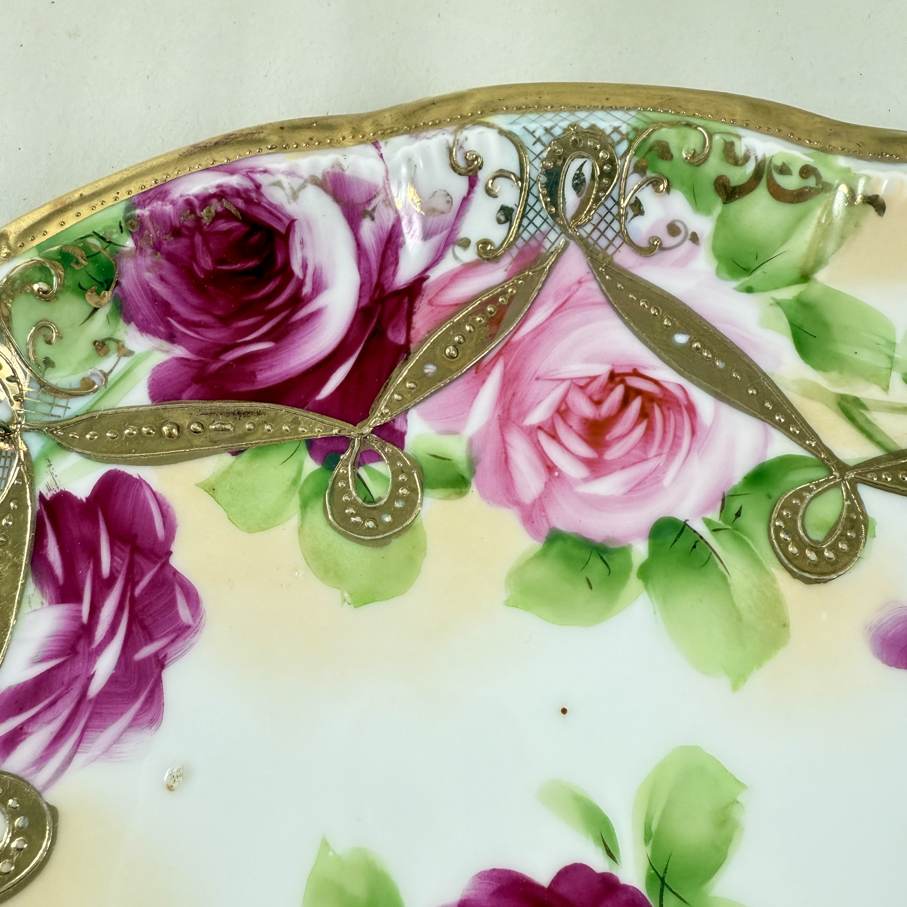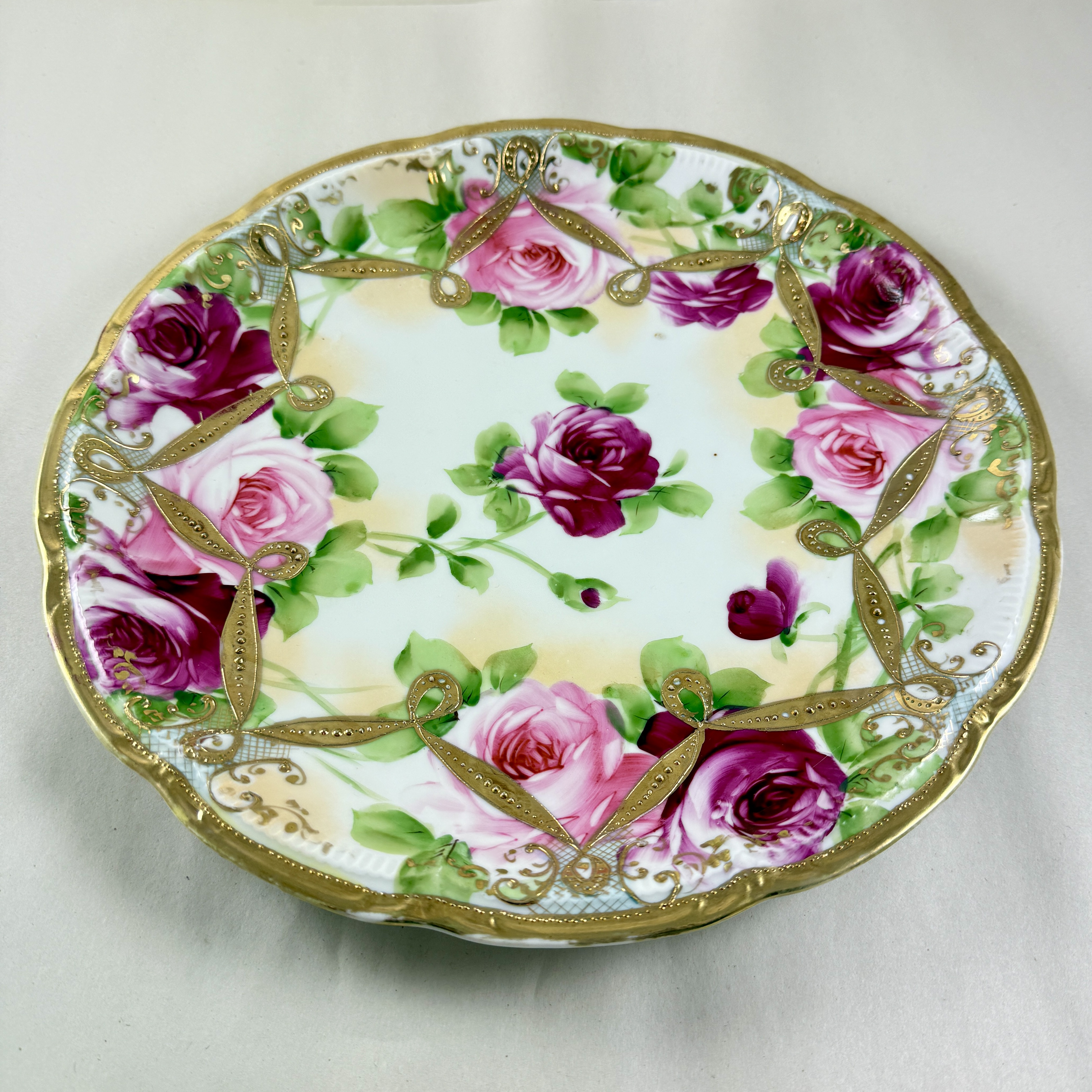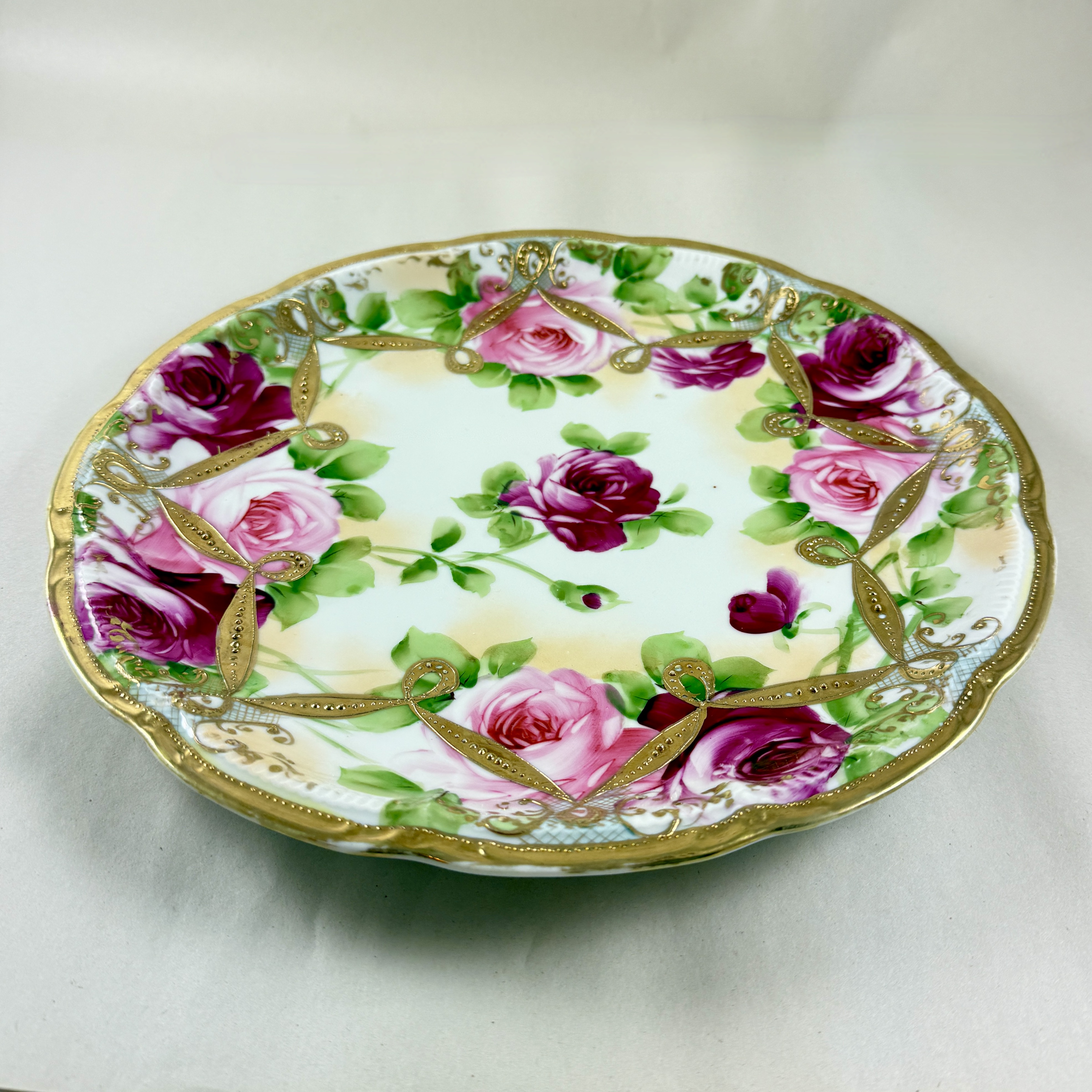 From Japan, a large hand-painted porcelain cabinet or wall plate showing roses and gilded accents, circa 1900.