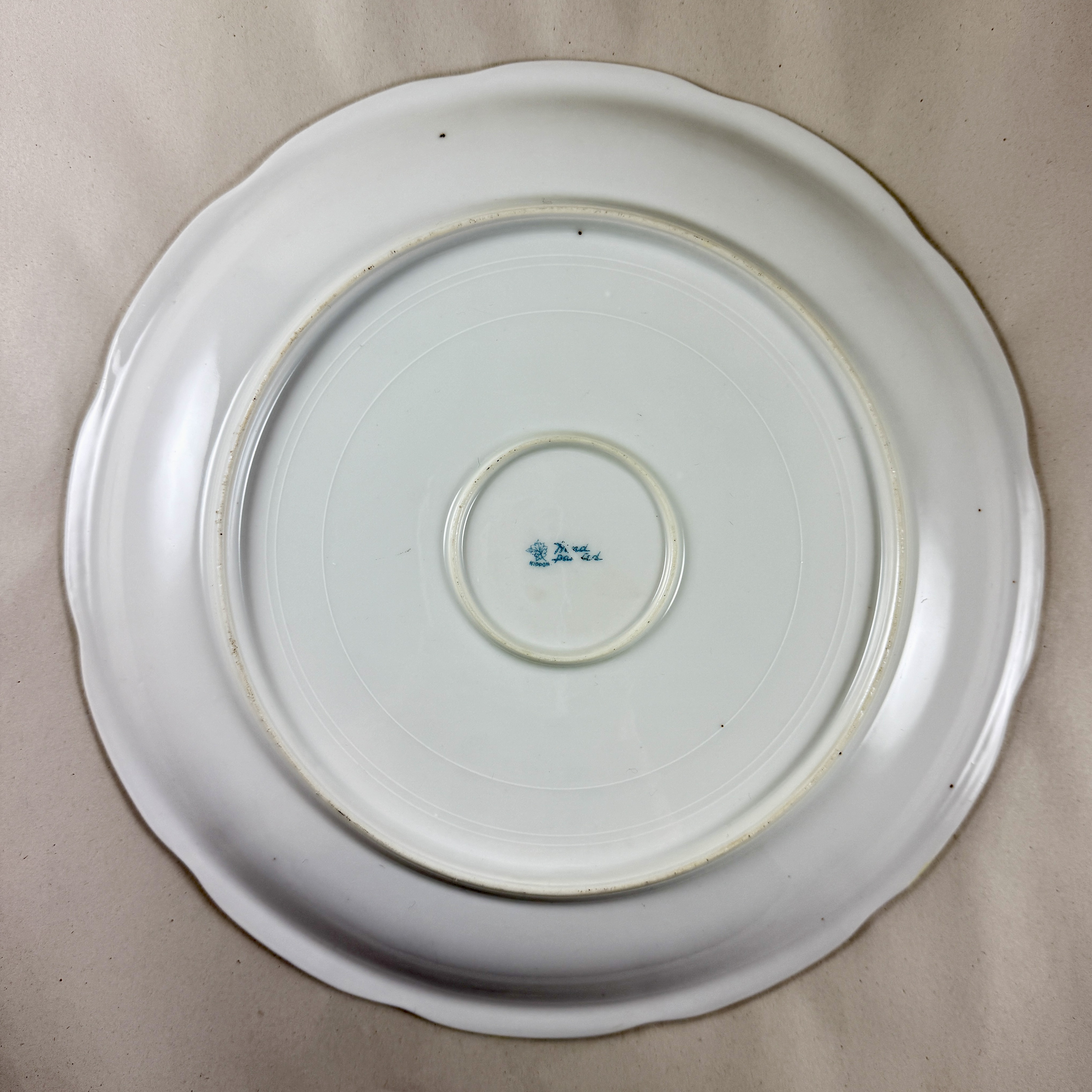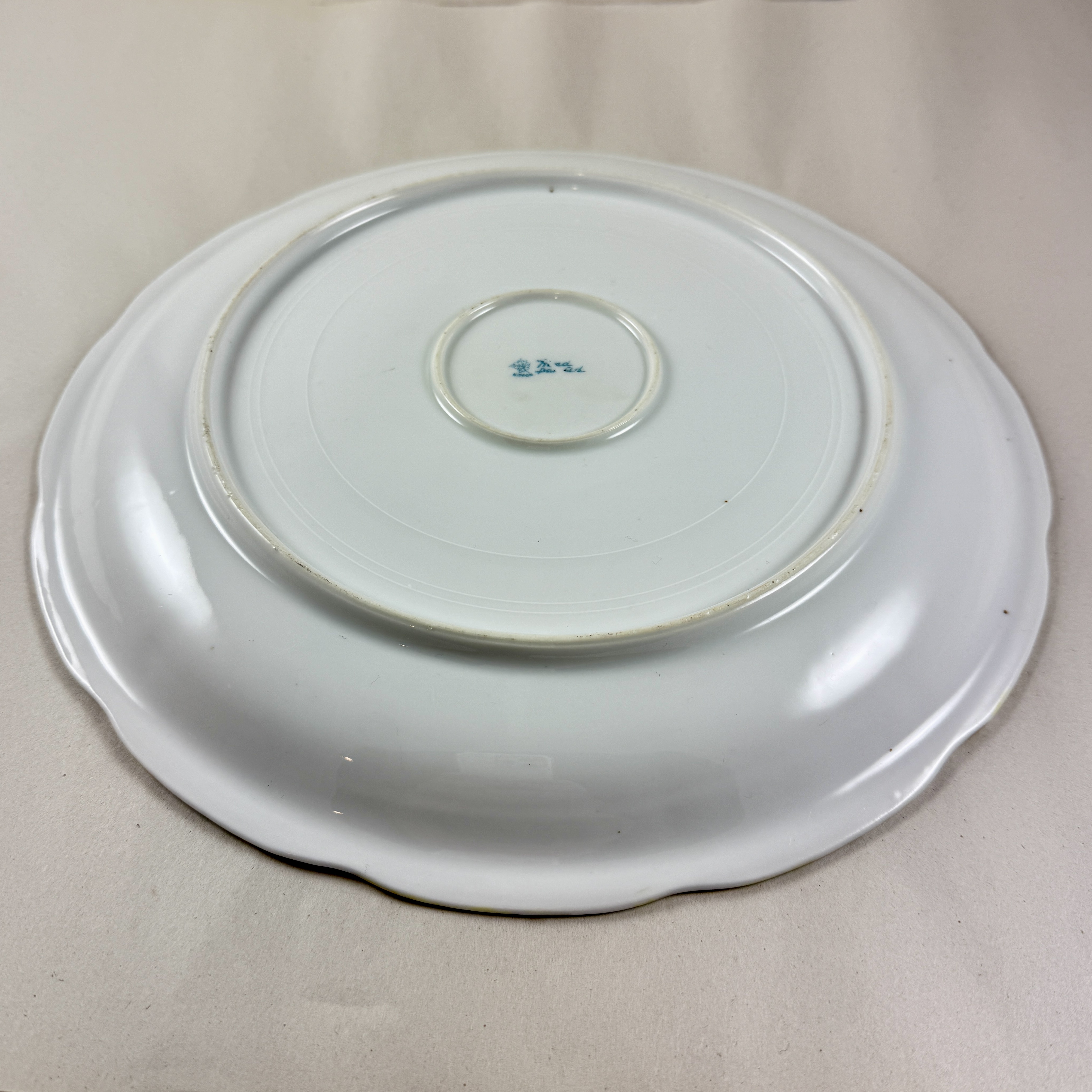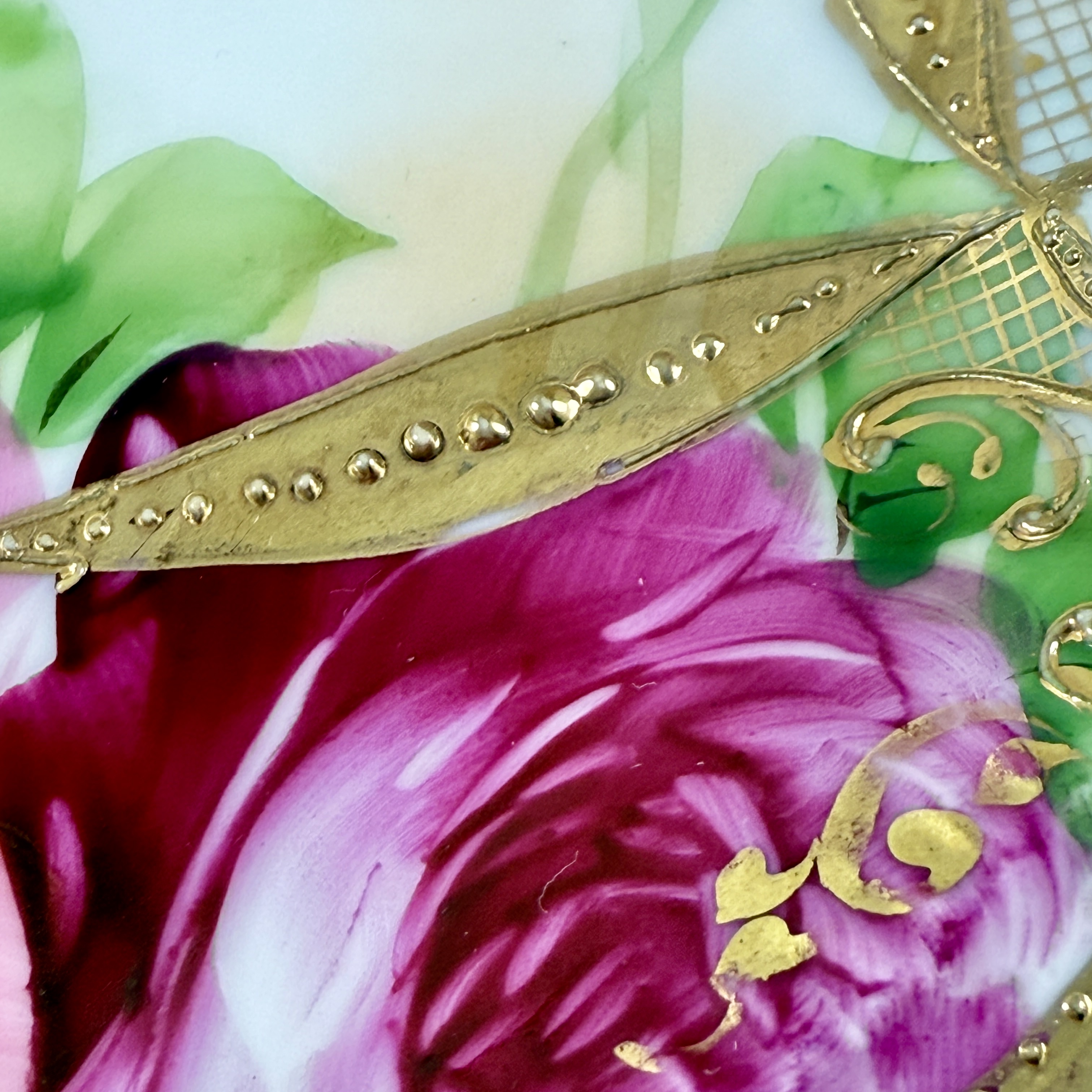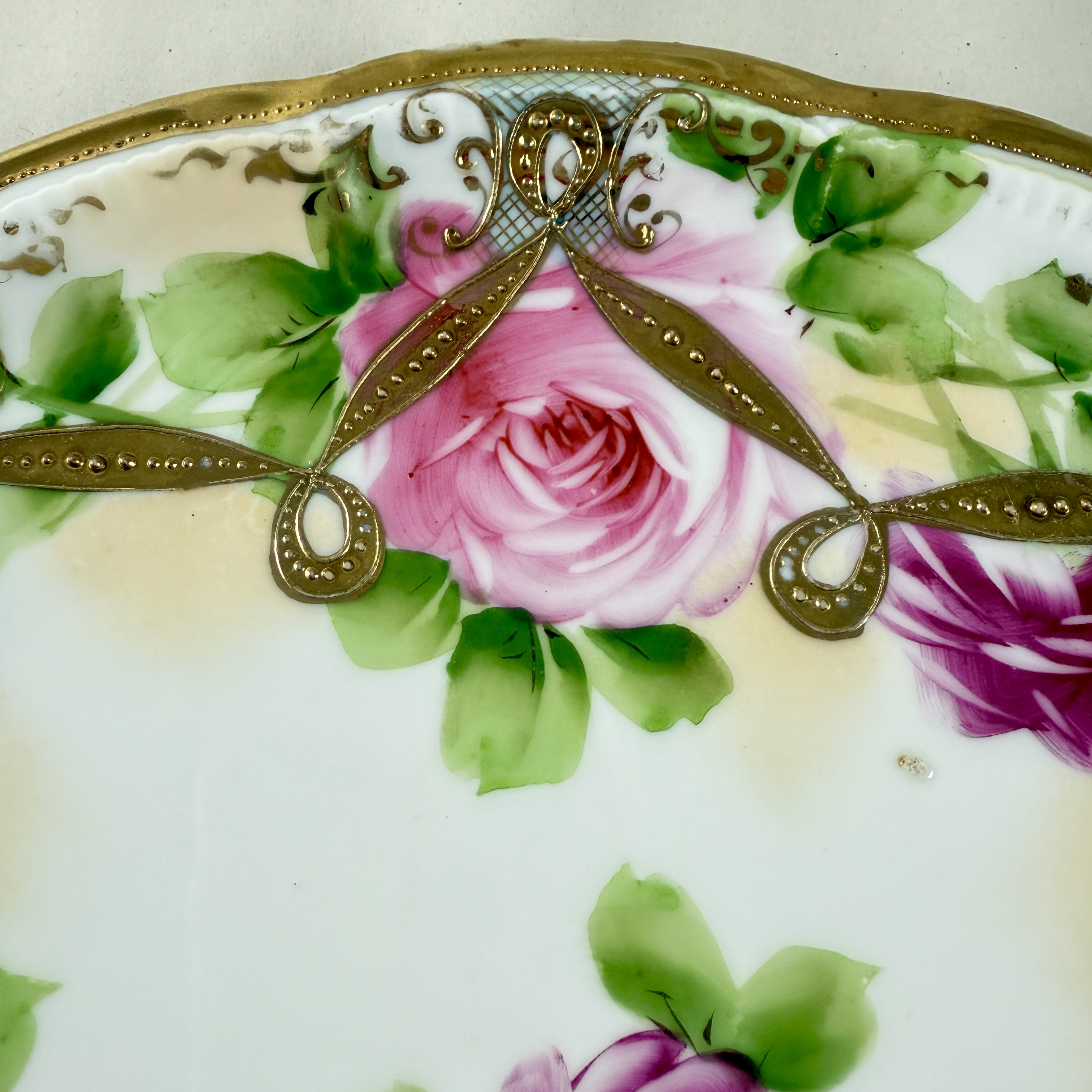From Japan, a large hand-painted porcelain cabinet or wall plate showing roses and gilded accents, circa 1900.