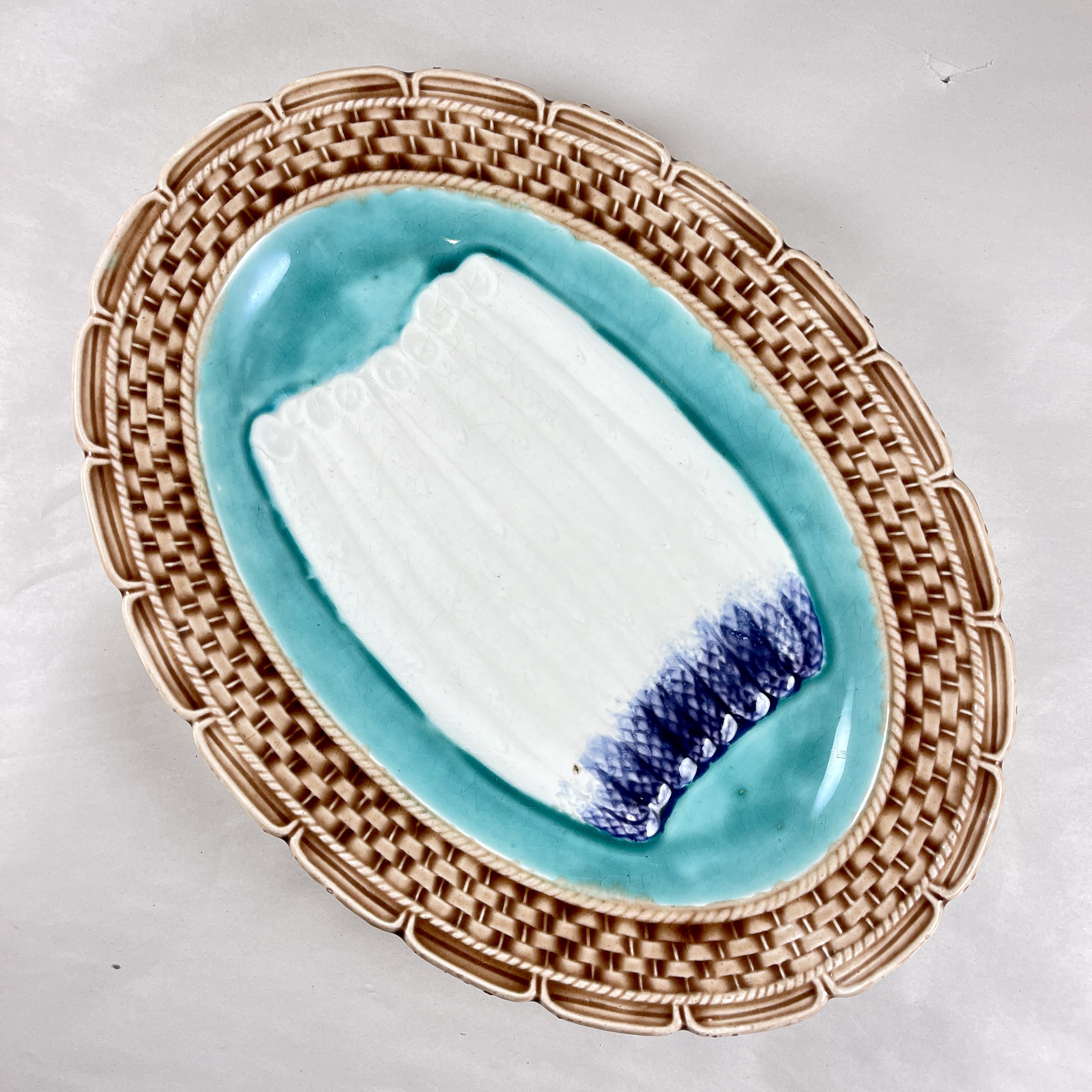 From the Orchies Faïencerie in Saint-Armand-Les-Eaux, Northern France, a majolica glazed oval asparagus server, circa early 1900s.