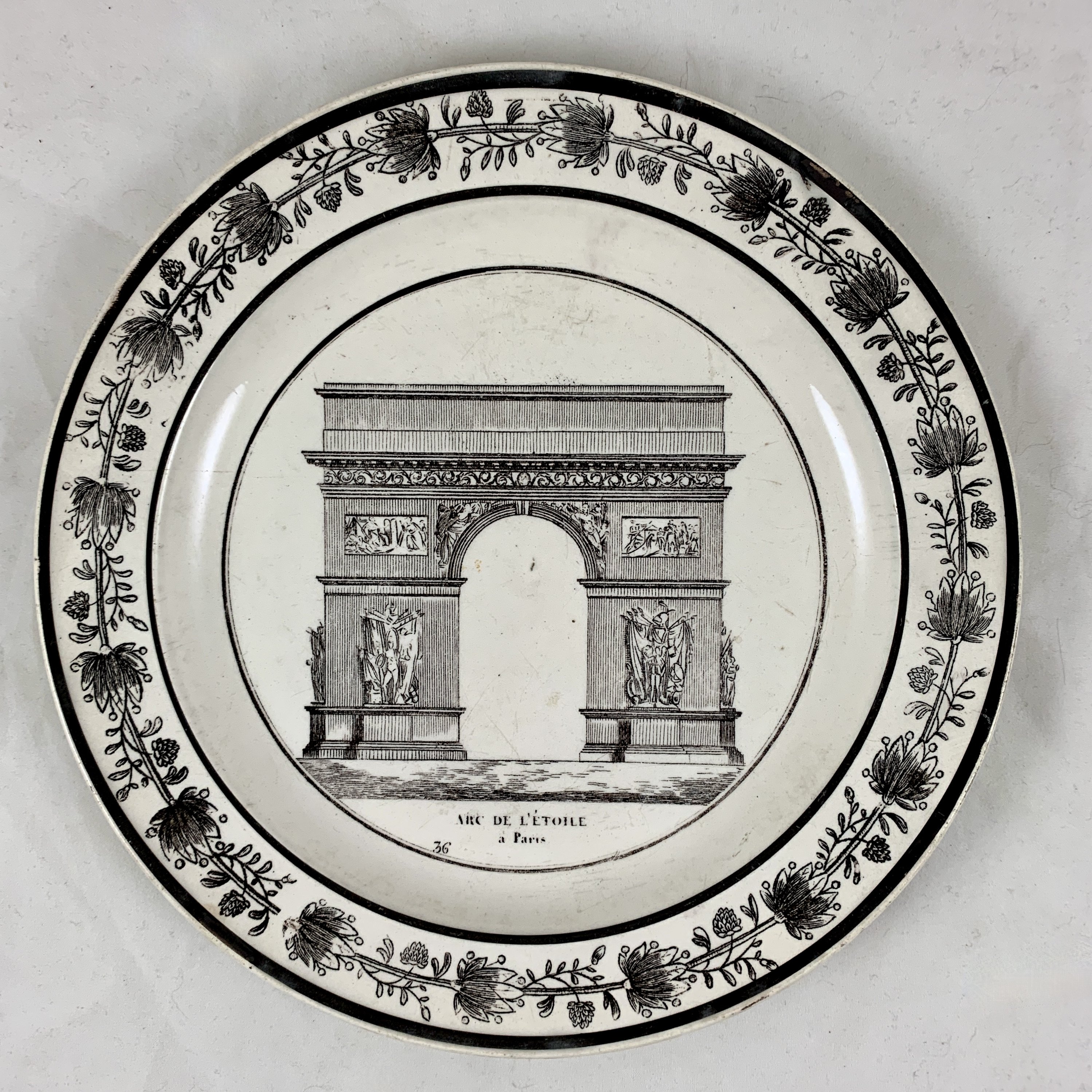 A black transfer of an architectural image on a creamware body, depicting the Arc de l’ Étoile à Paris. The Arc is prominent, with the title printed below. A floral border follows the rim.
