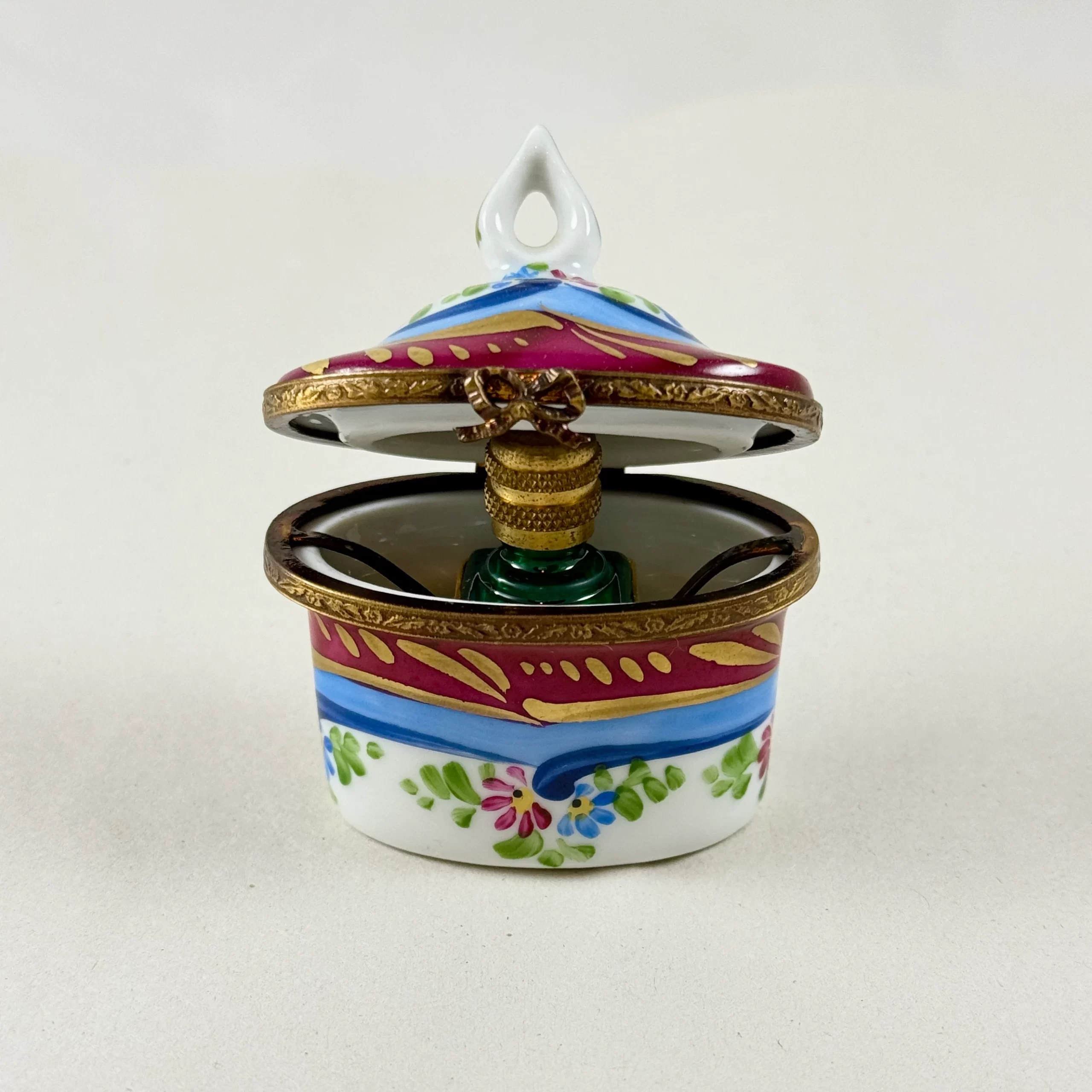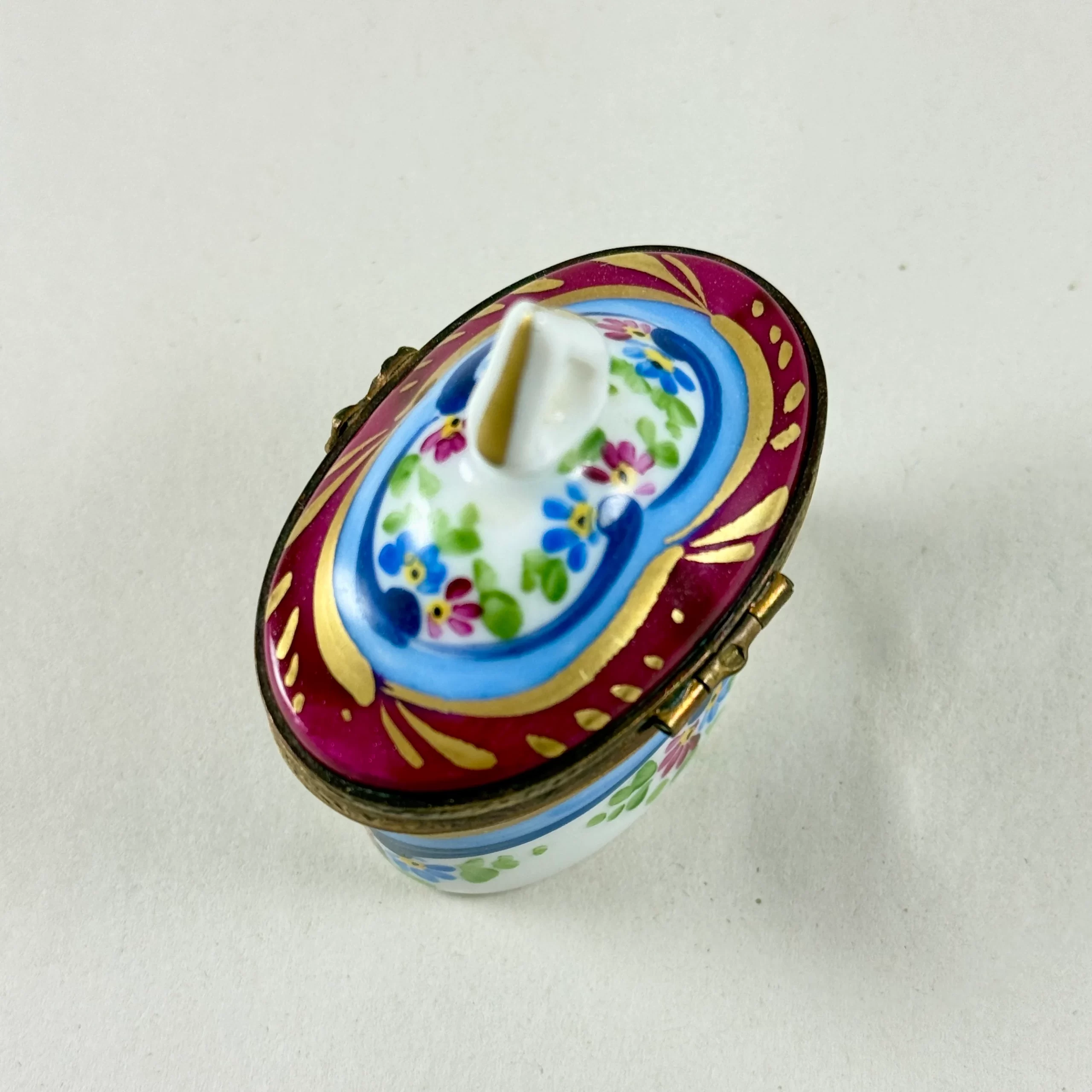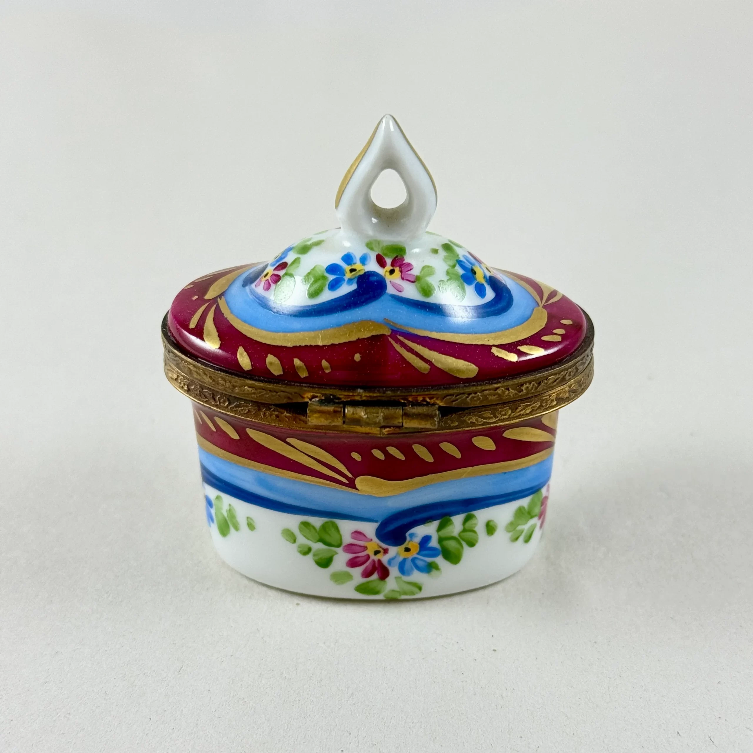 The oval metal braced box has a domed lid with a tear-drop handle, and is painted in a floral design with burgundy and gilded detailing.