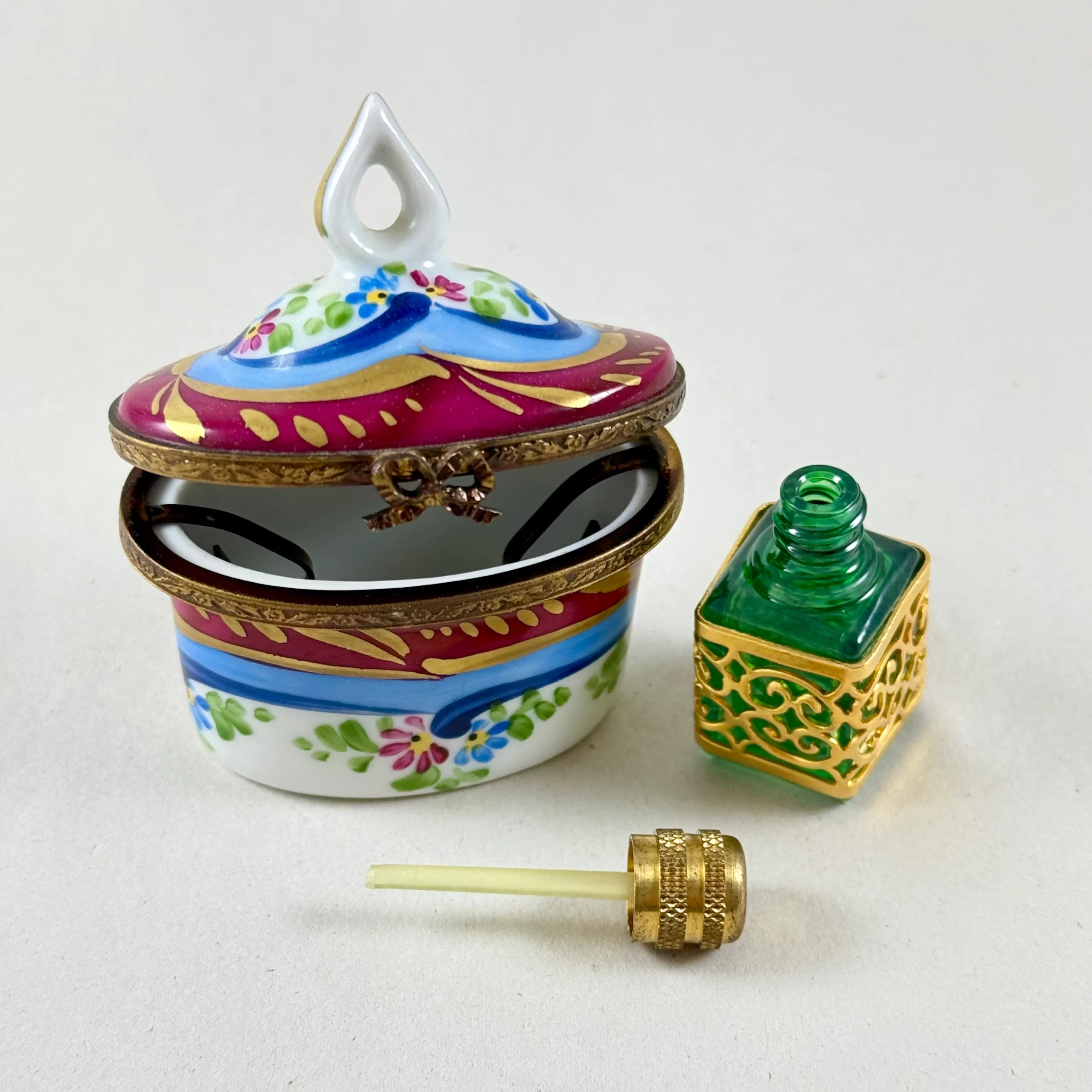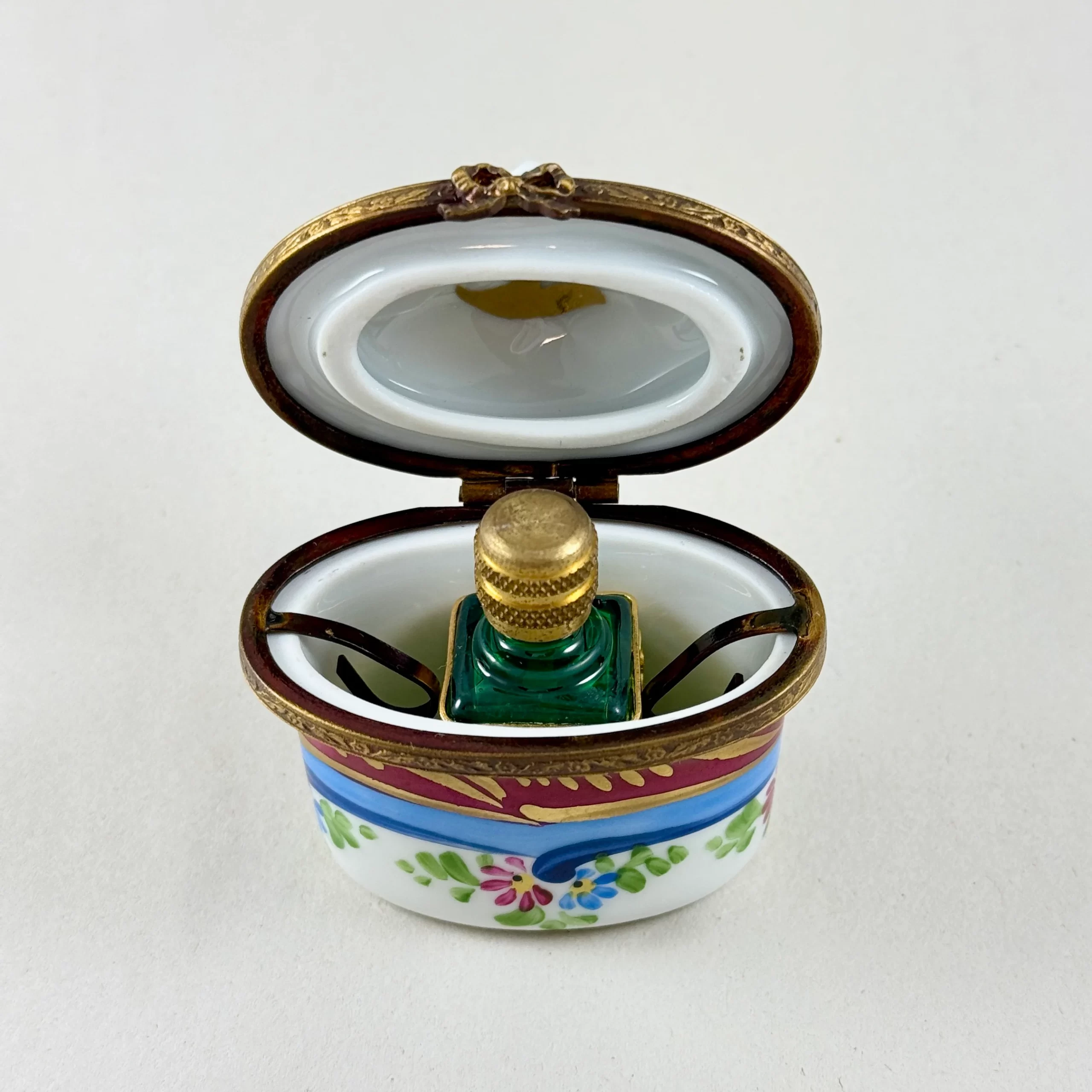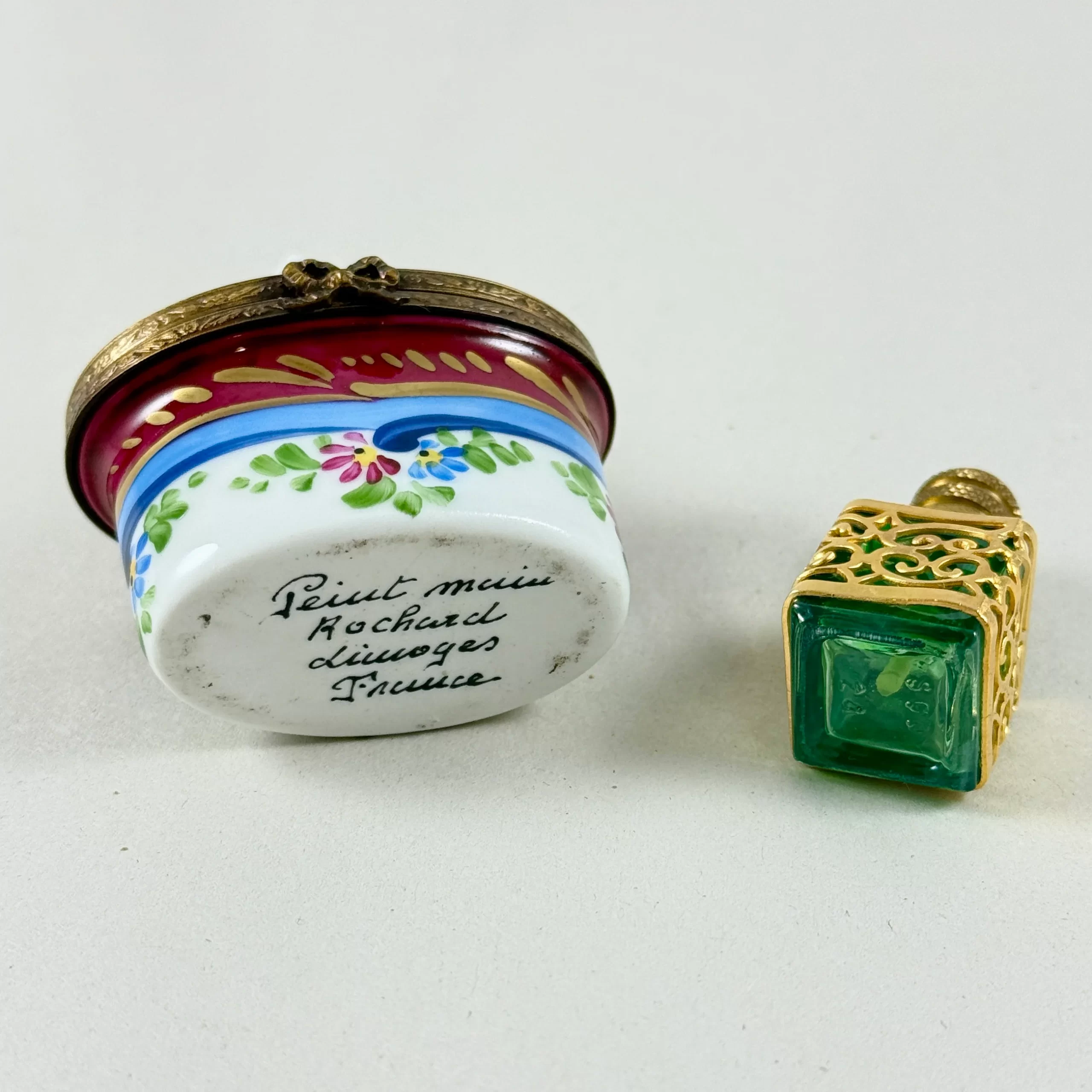 From Rochard, Limoges Paris, a hand enameled trinket box, a scent chest with a metal caged glass bottle, circa 1970-1980s.