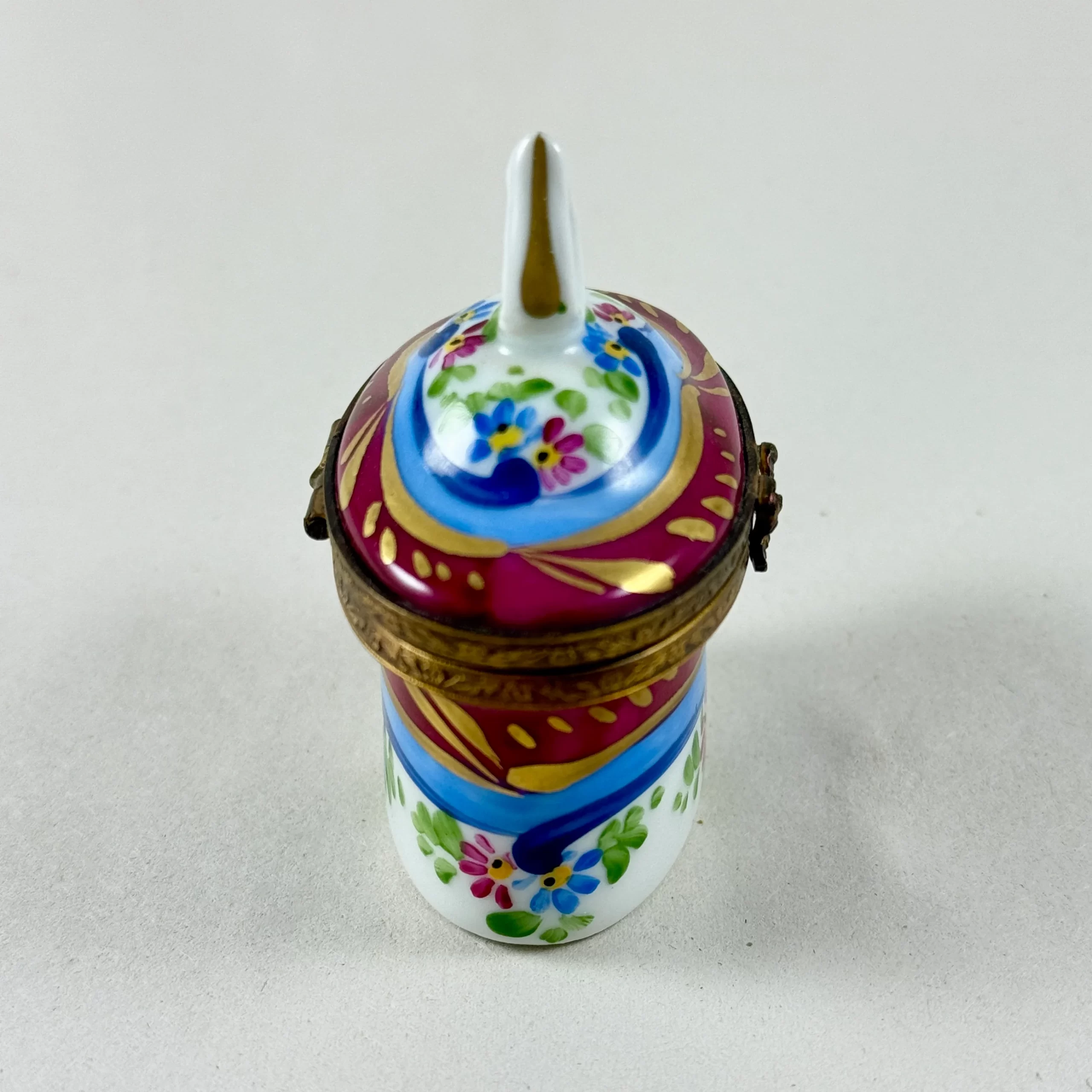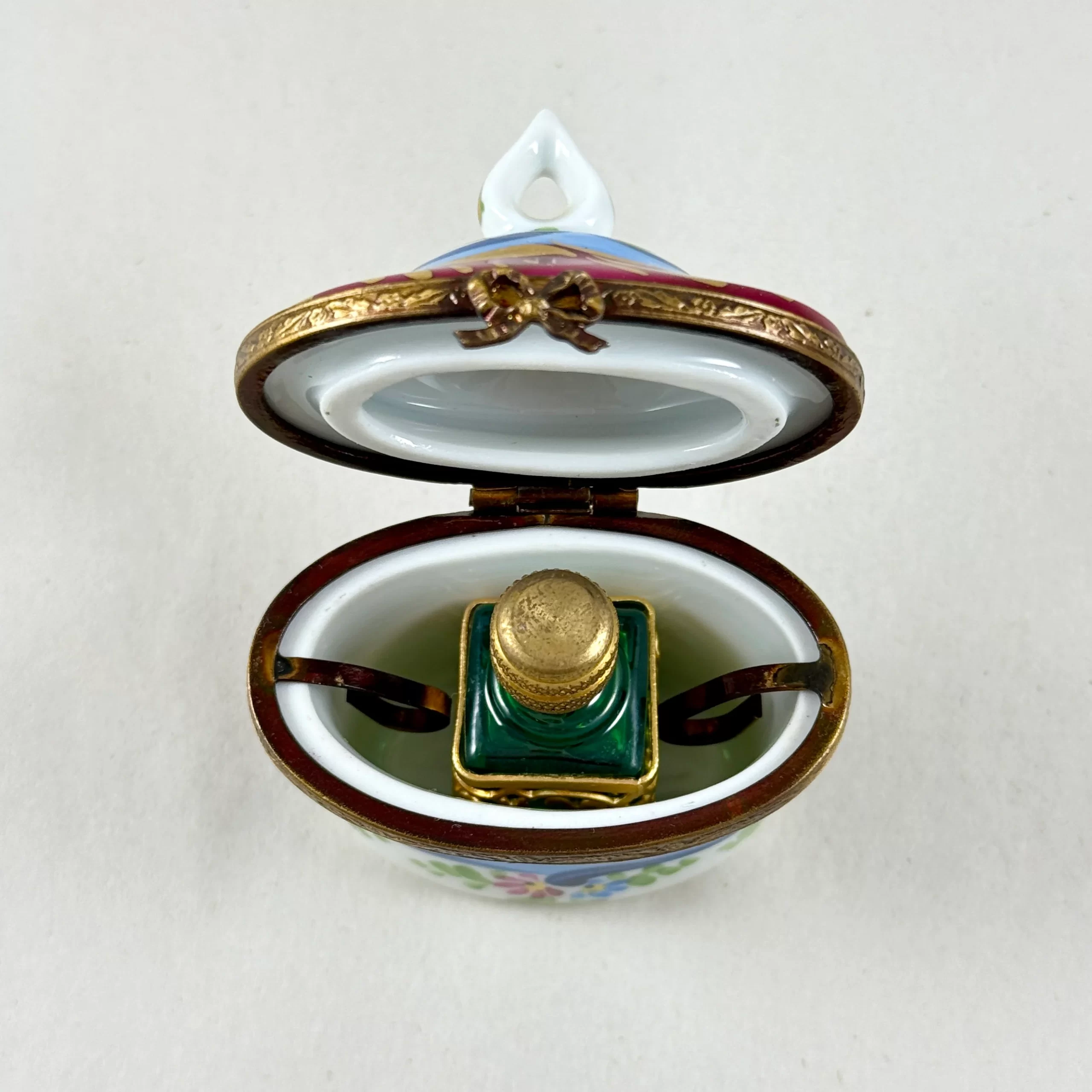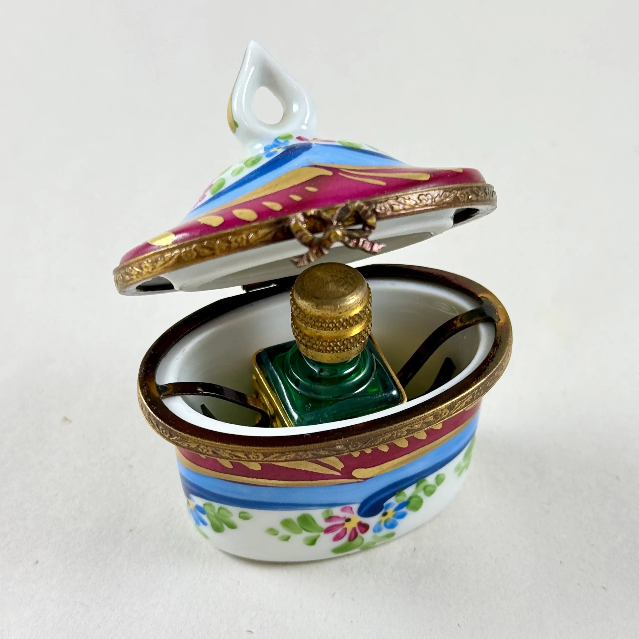 From Rochard, Limoges Paris, a hand enameled trinket box, a scent chest with a metal caged glass bottle, circa 1970-1980s.