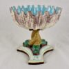 A dimensional upturned, open shell form bowl is beautifully glazed in cream with pale brown detailing and a bright turquoise interior. The shell shows a delicate serrate rim and is supported on a pedestal base of three entwined dolphins on a triangular base. The bowl sits on the tails of the dolphins, which are glazed in a golden yellow with green heads. The brown triangular footing shows a running border of sea plant leaves in cream on a pale turquoise ground.