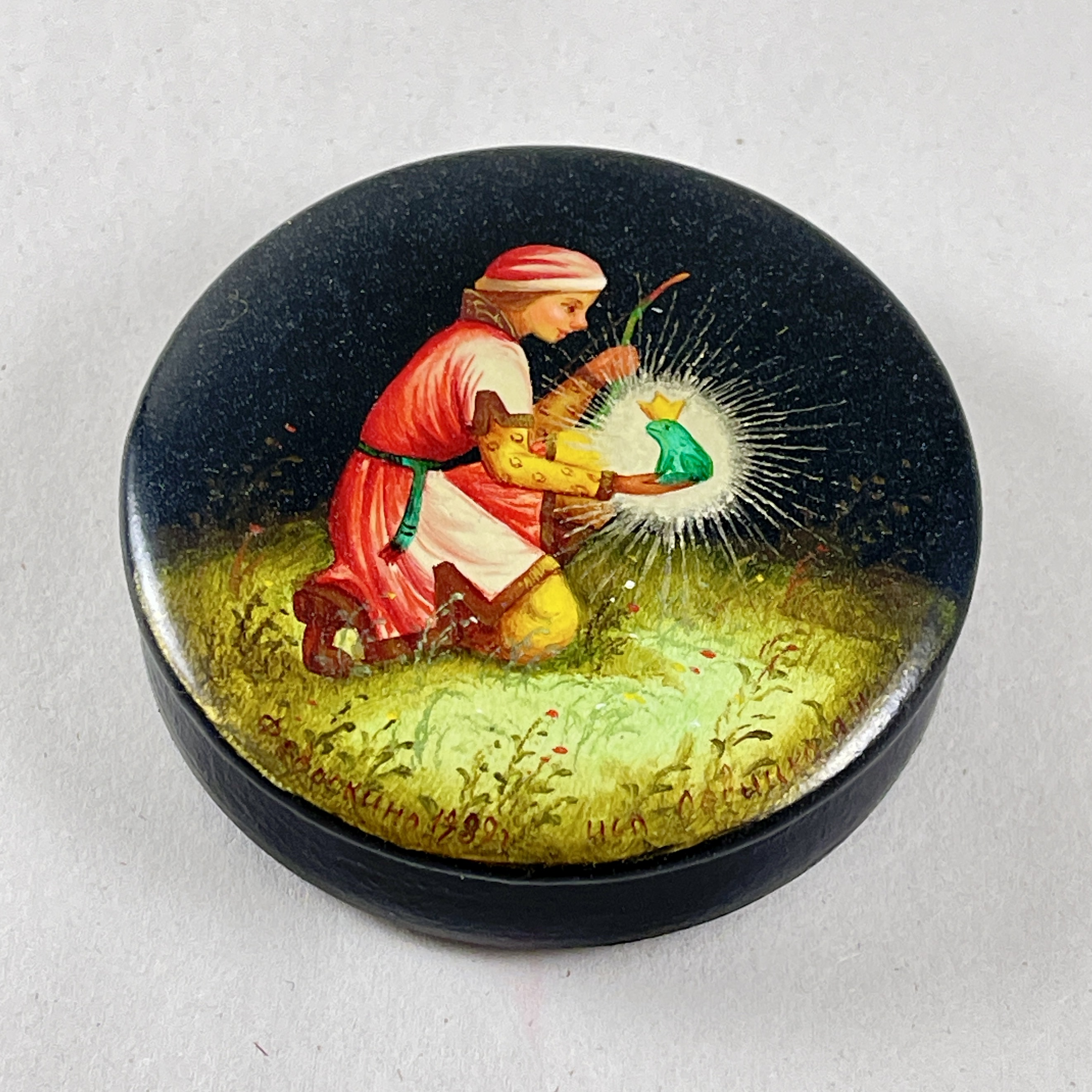 A vintage hand-painted lacquer papier-mâché box depicting Prince Ivan and the Frog Princess, USSR Era Russia, circa 1990-2000.