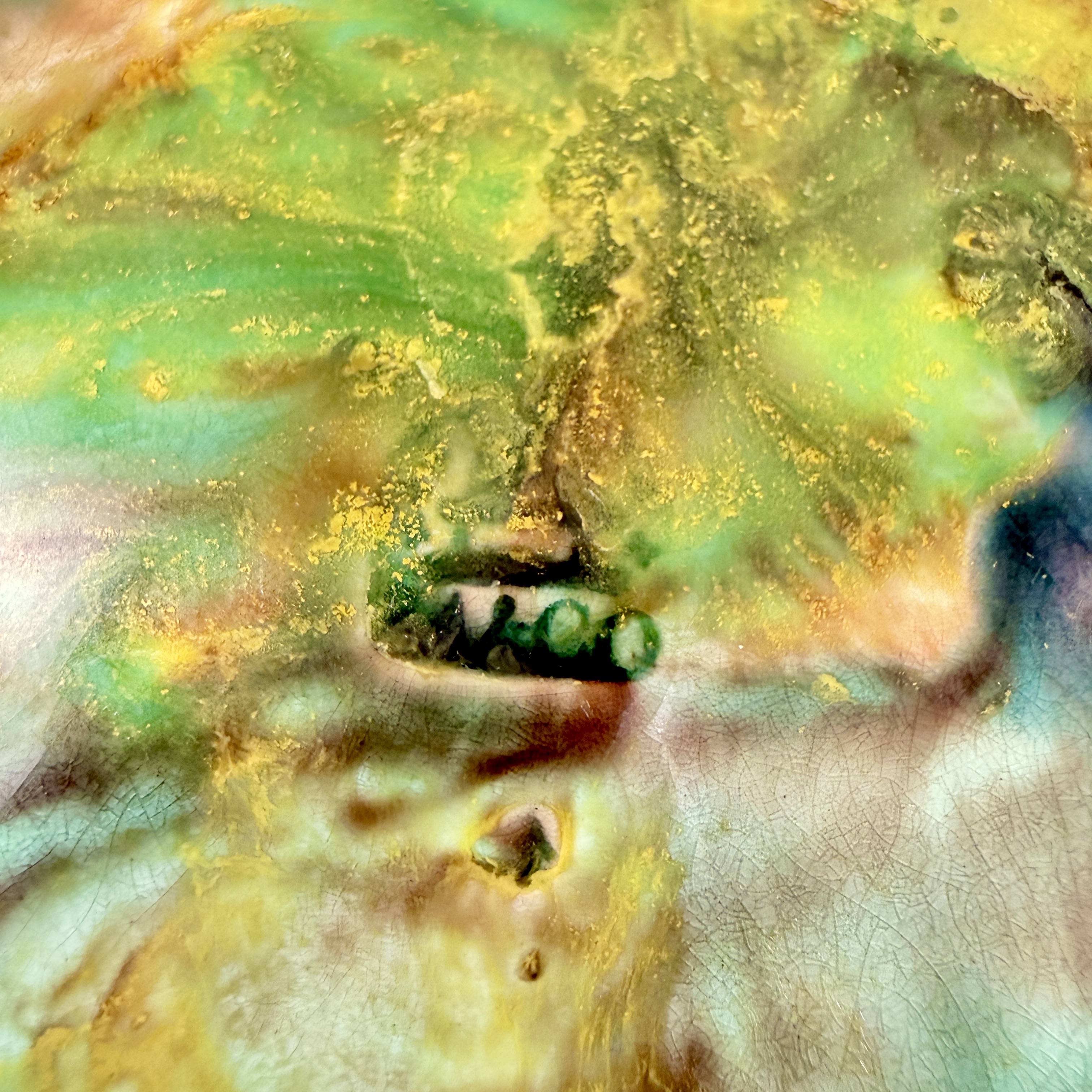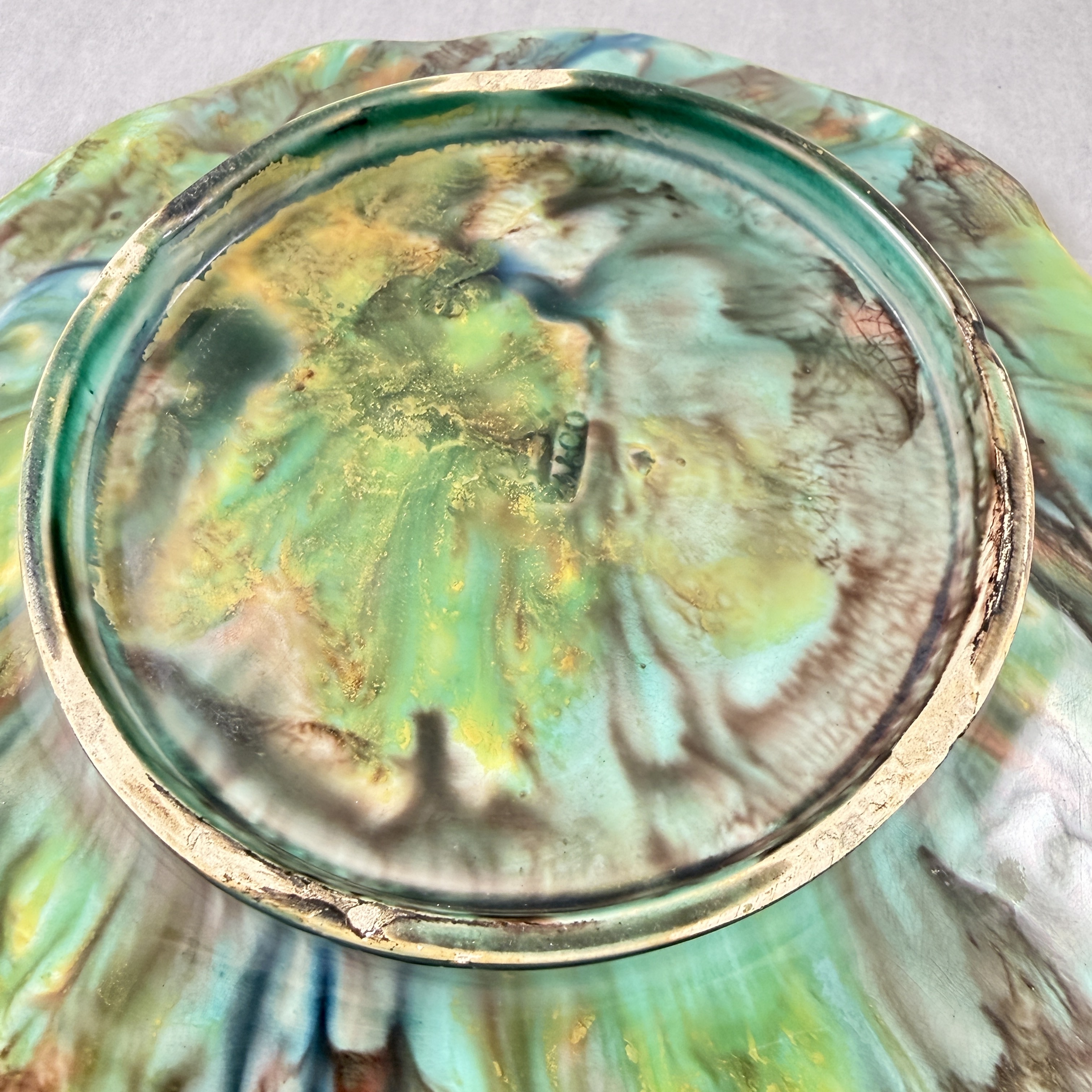 The mottled blue, green and brown glazing to the verso is also a hallmark of Alcock.