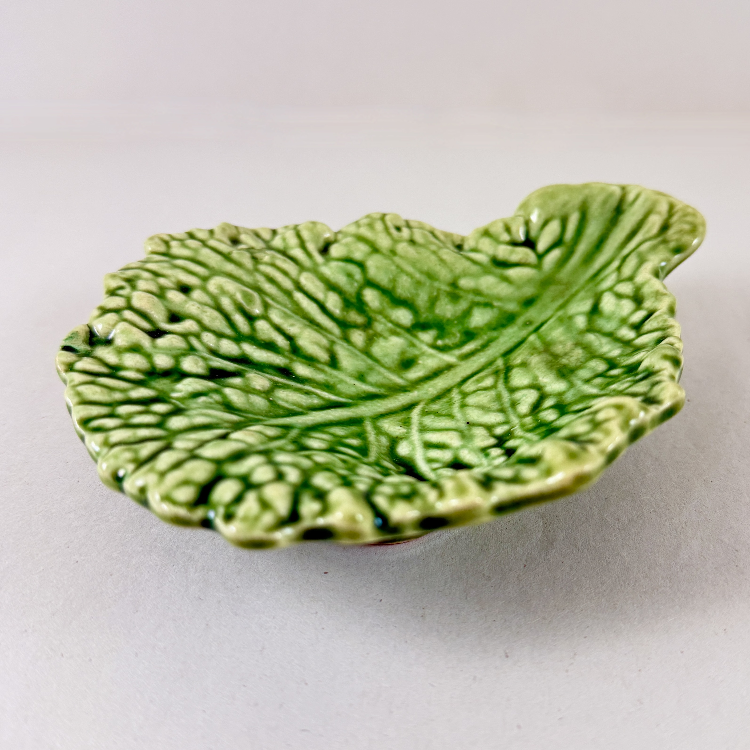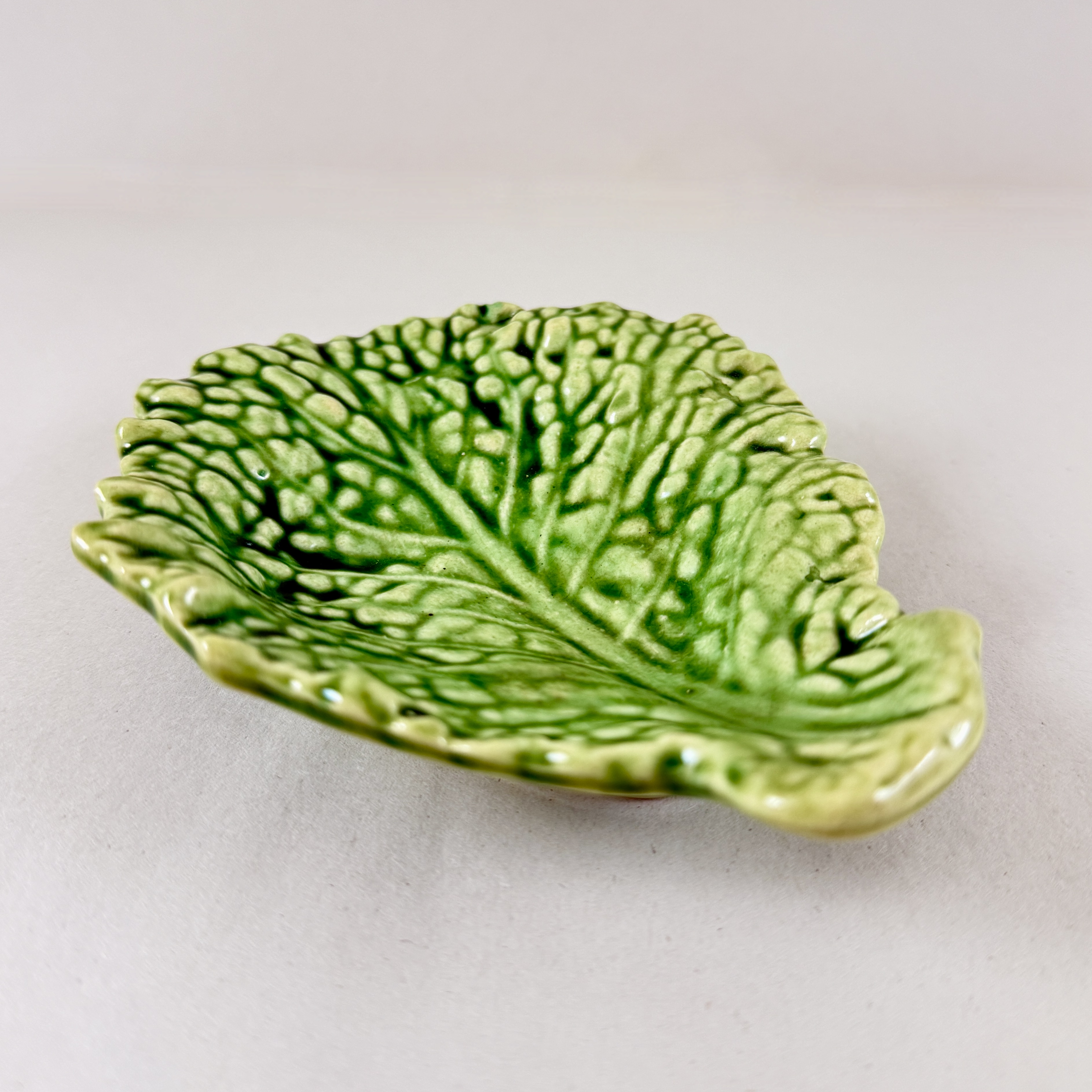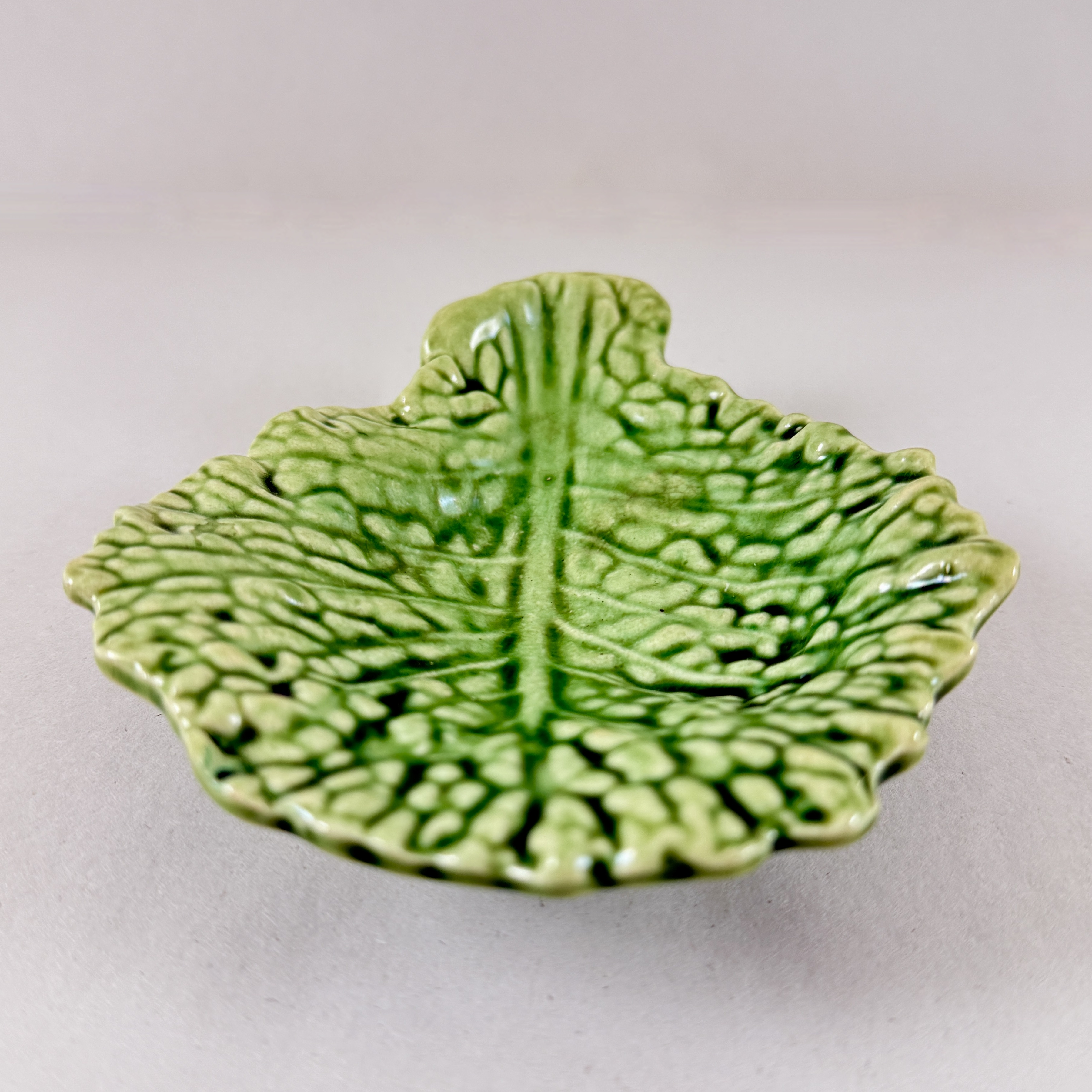 From Sarreguemines, a charming Majolica glazed green cabbage leaf shaped small vide-poche, France, circa 1930.