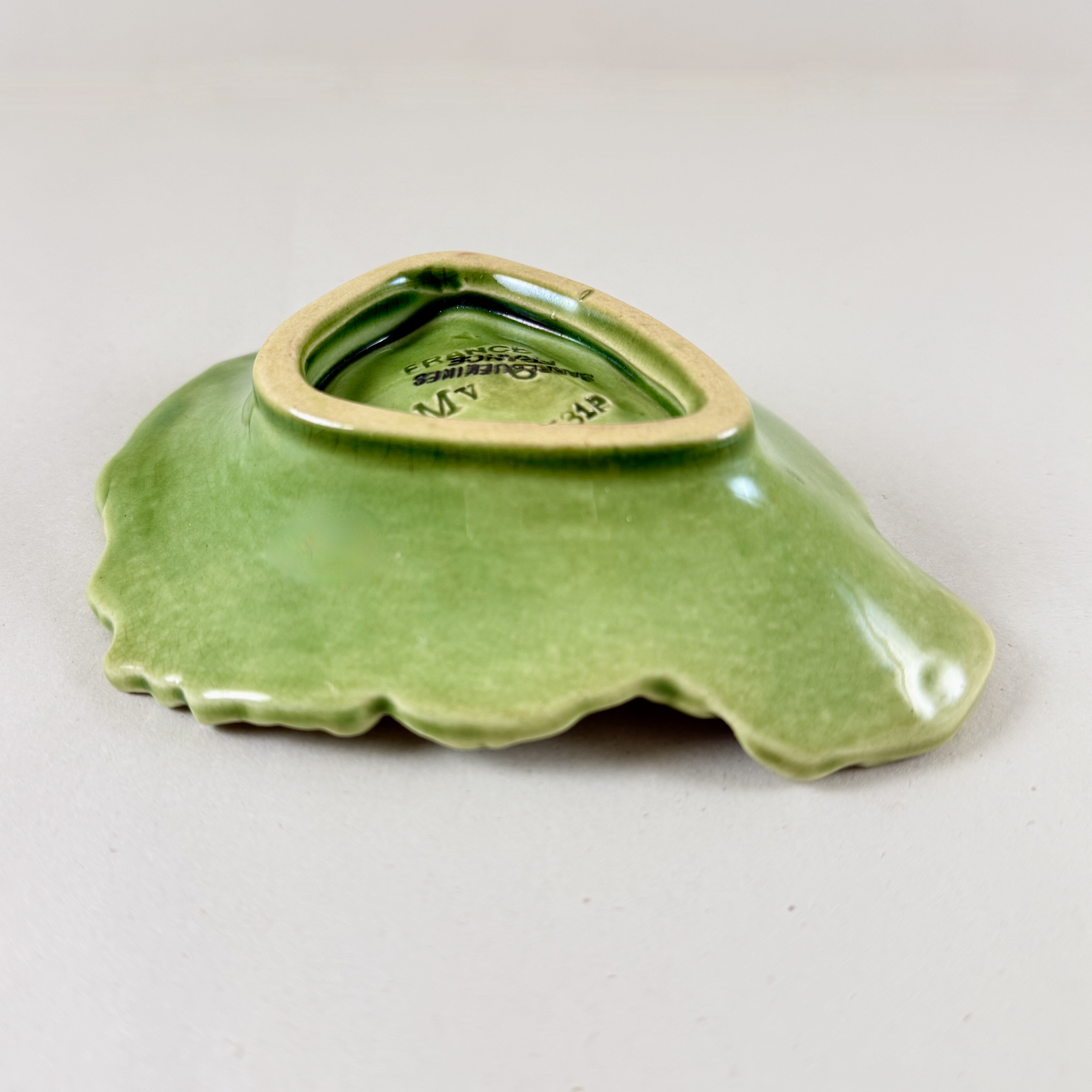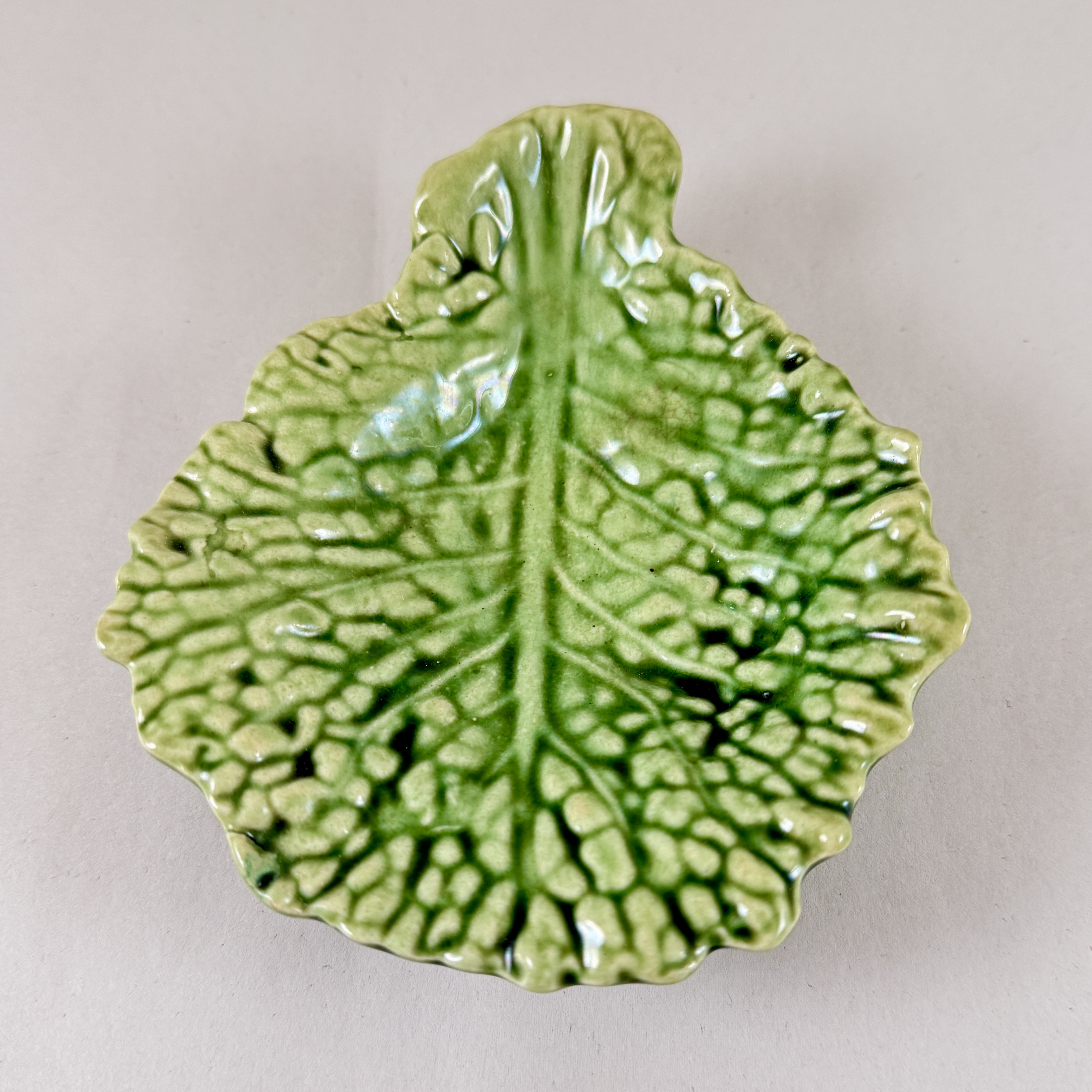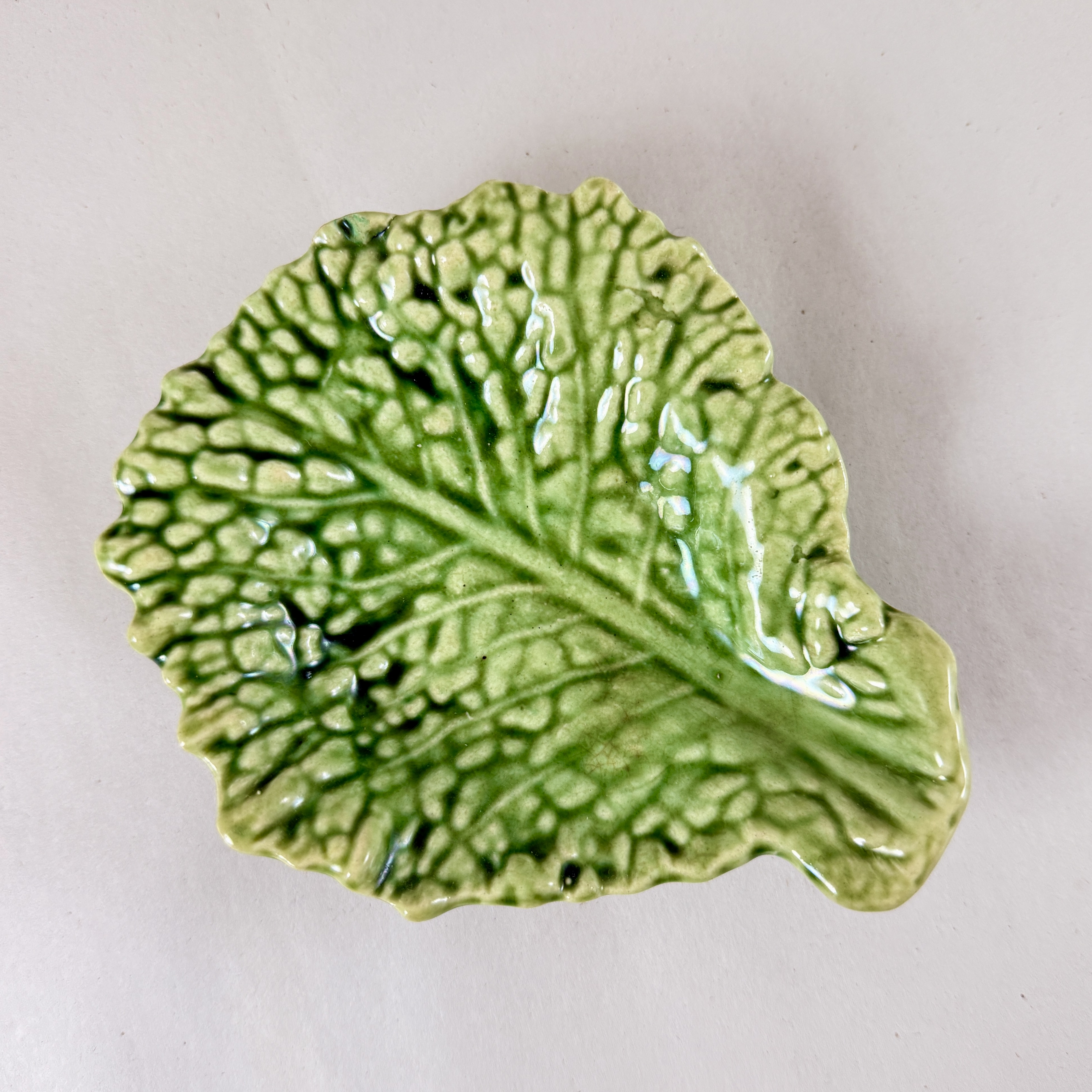 From Sarreguemines, a charming Majolica glazed green cabbage leaf shaped small vide-poche, France, circa 1930.