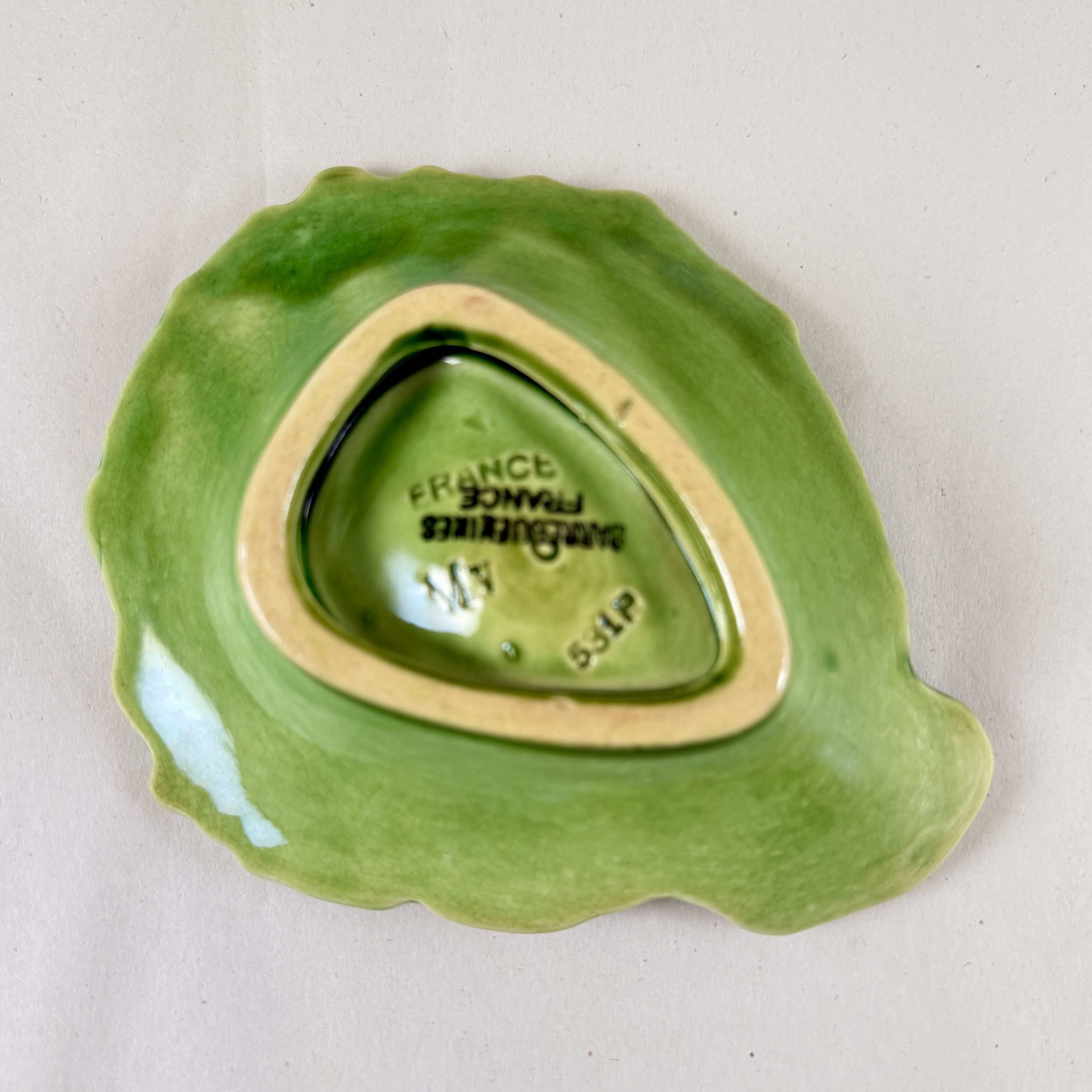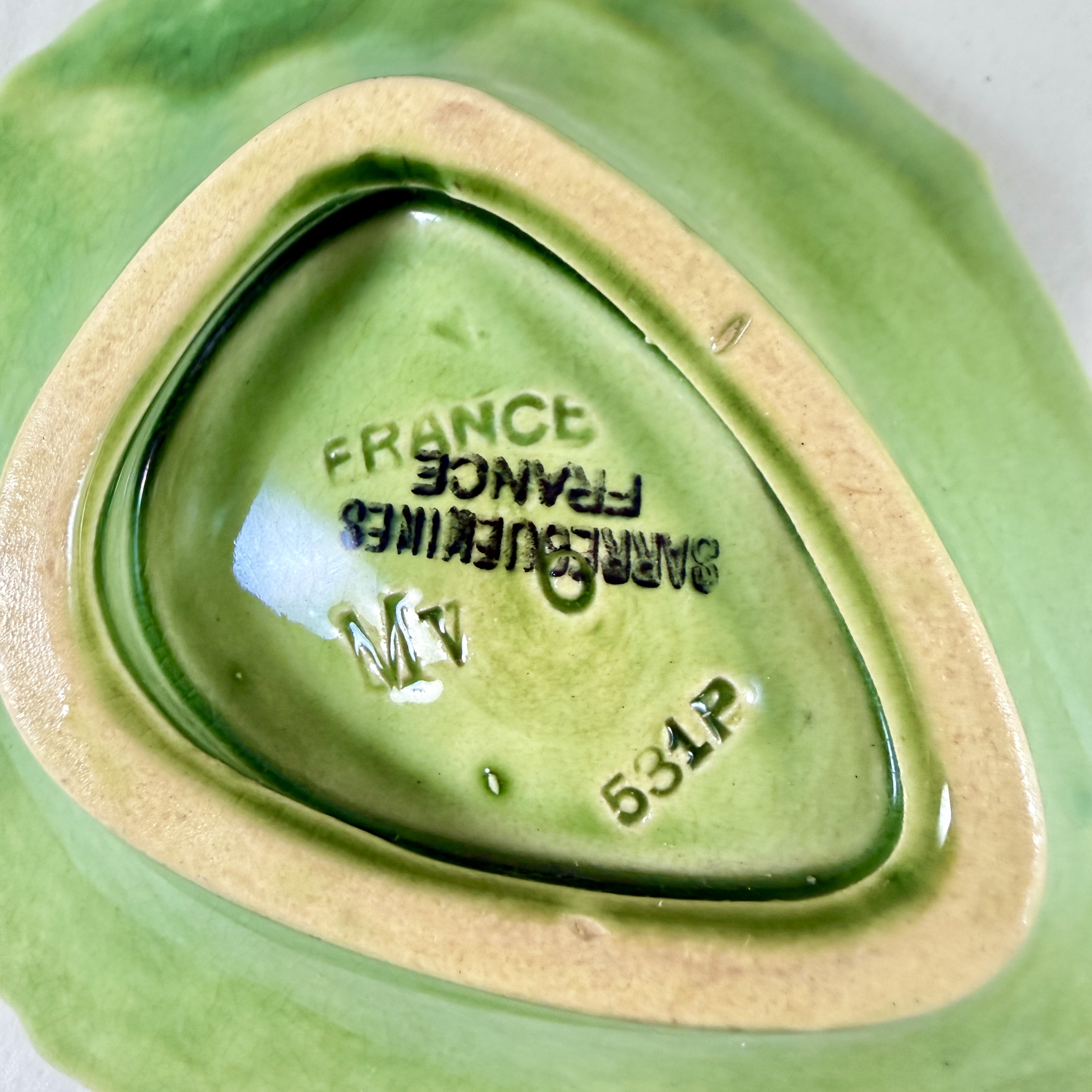 Marked: Sarreguemines France, with the mold number 531P, and the letter M, signifying a majolica glaze.