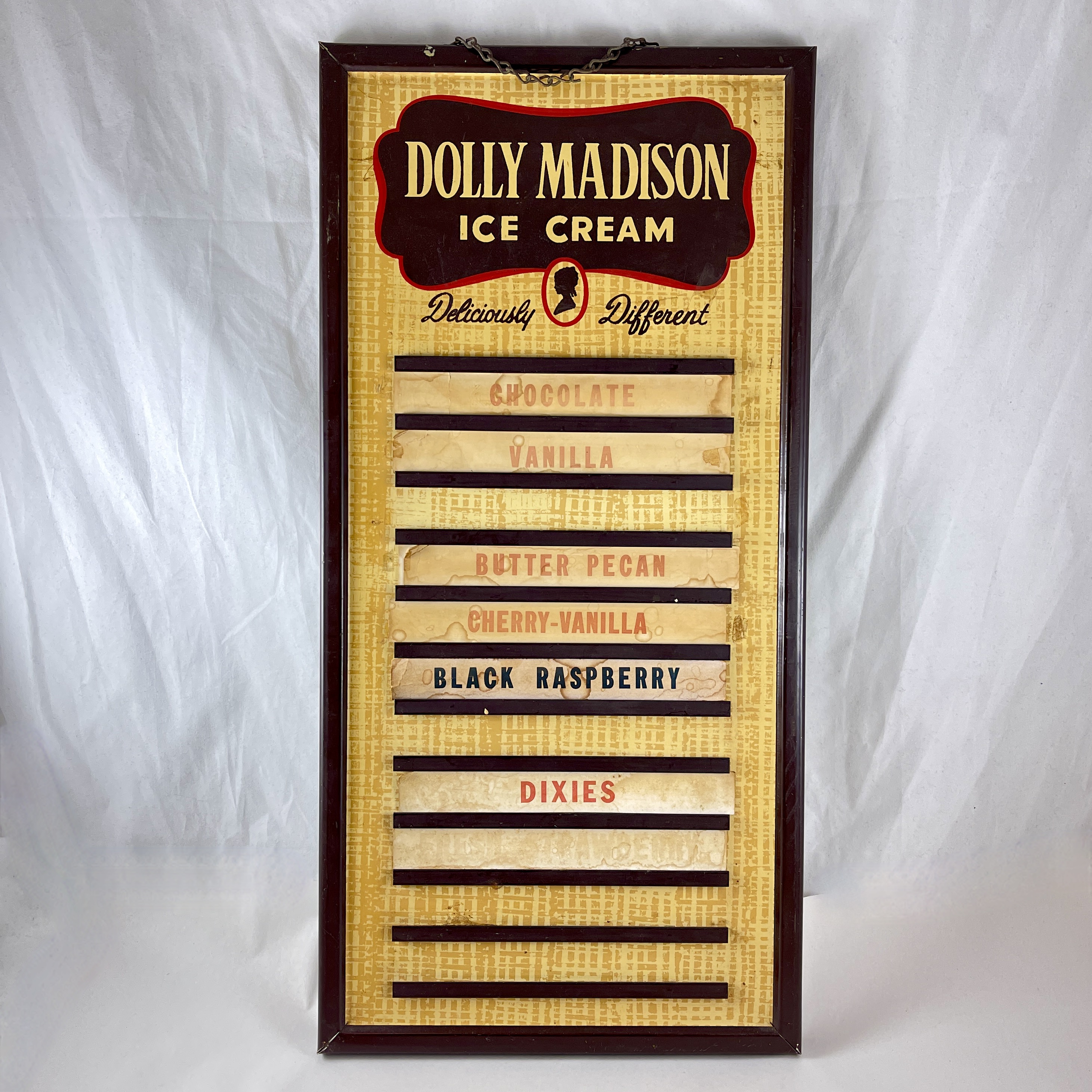 With the original hanging chain, the printed metal flavor board shows the Dolly Madison logo at the top, with eleven slots for holding the flavor cards printed on cardboard.