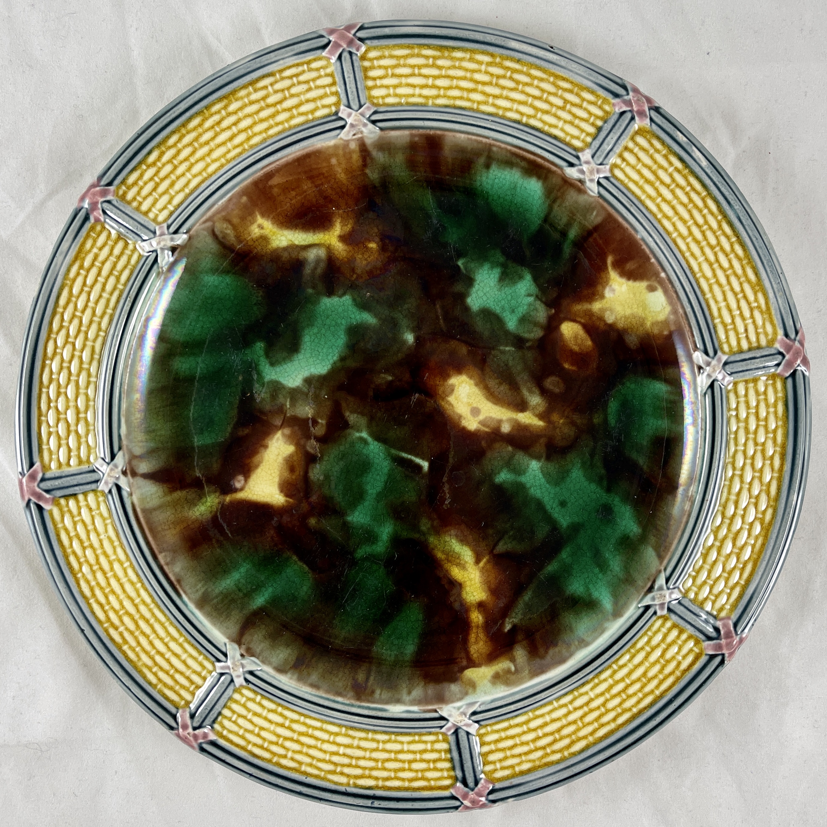 From Wedgwood, an earthenware majolica glazed plate, signed and date marked 1874.