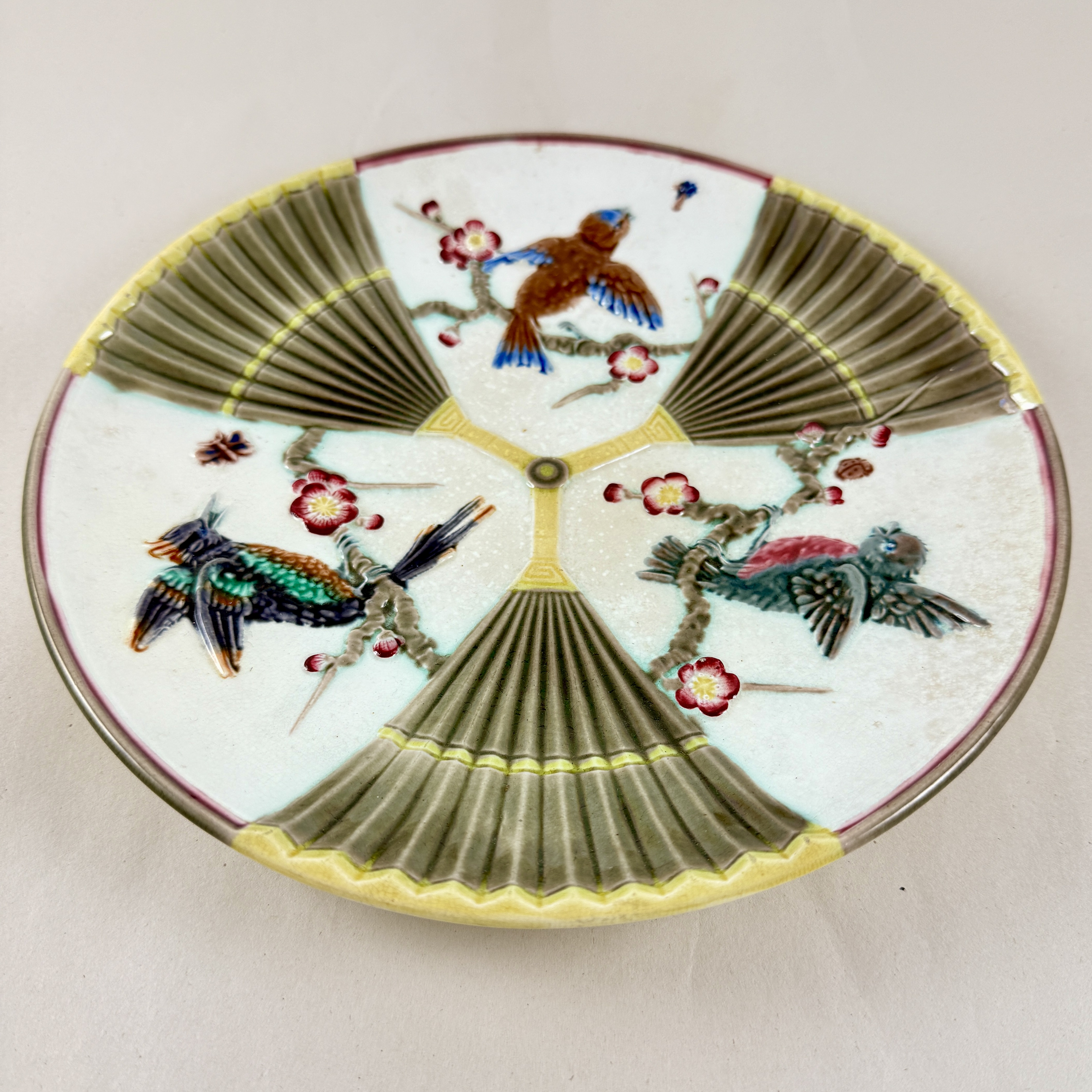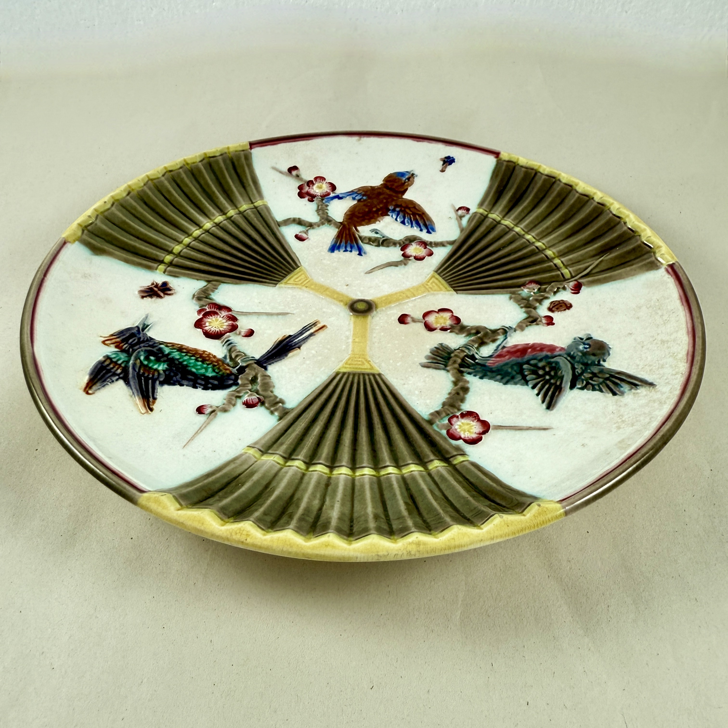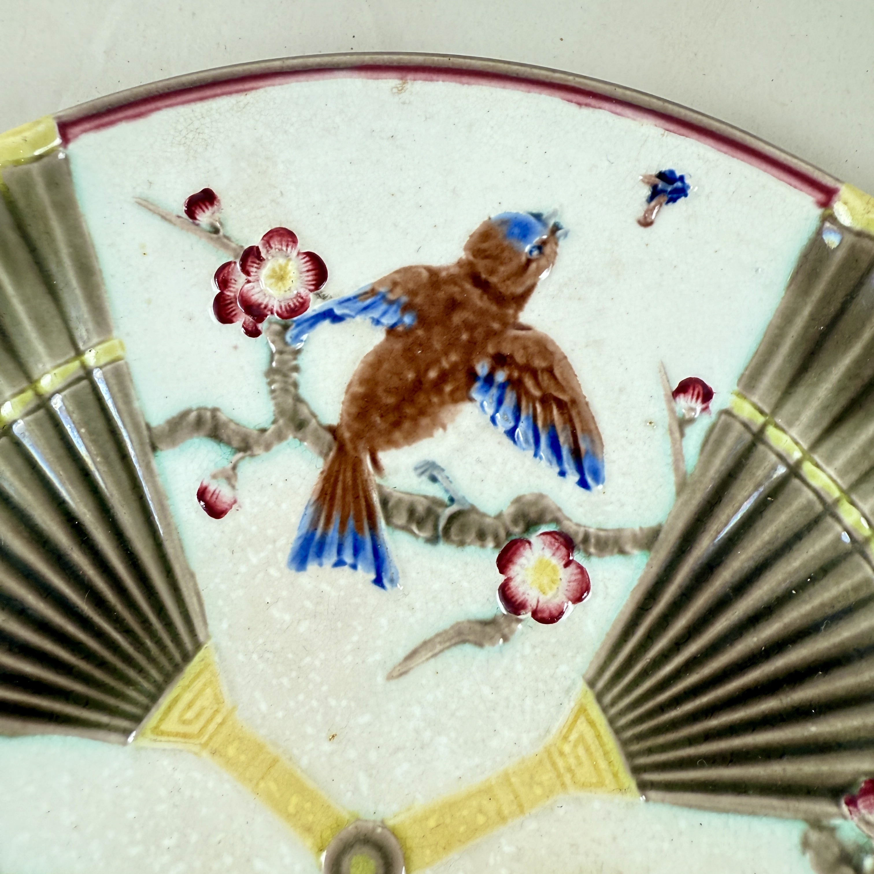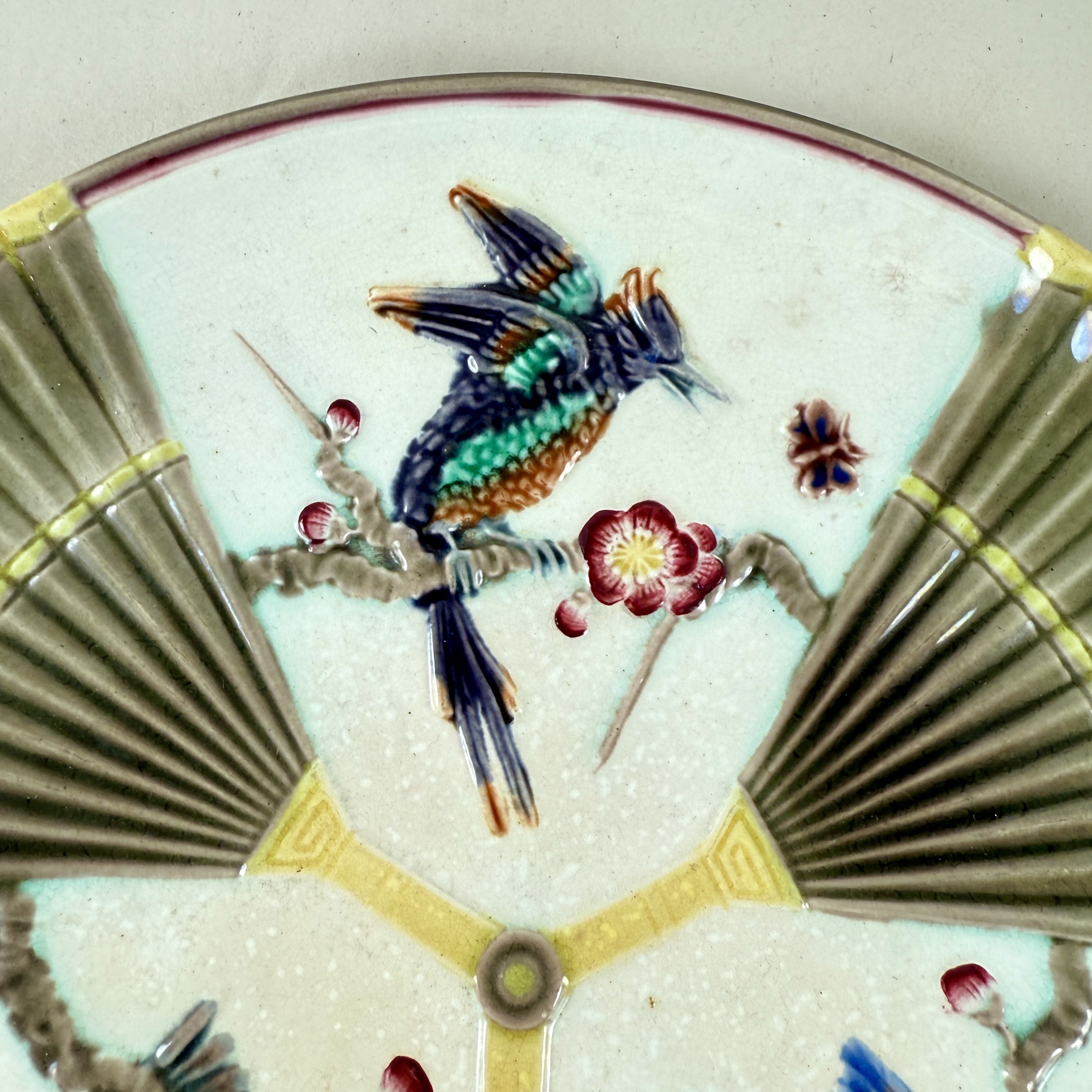 From Wedgwood, a Bird and Fan pattern plate in the Aesthetic taste, England, date marked 1878.
