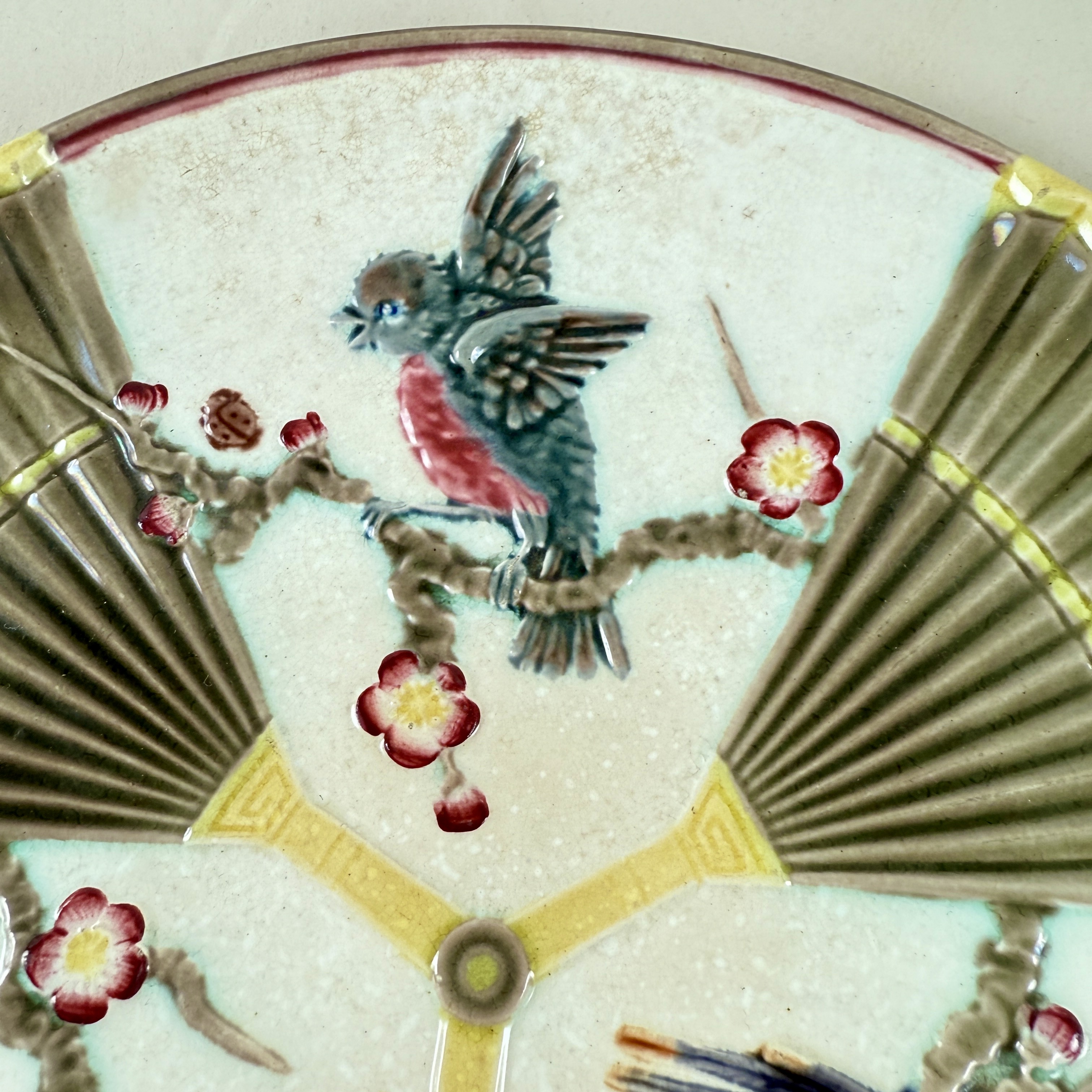 In the larger dinner plate size, a bird and fan motif with Dogwood tree branches and blossoms, on the off-white ground called Argenta Ware, and in the Japonisme style popular during the later 19th Century.