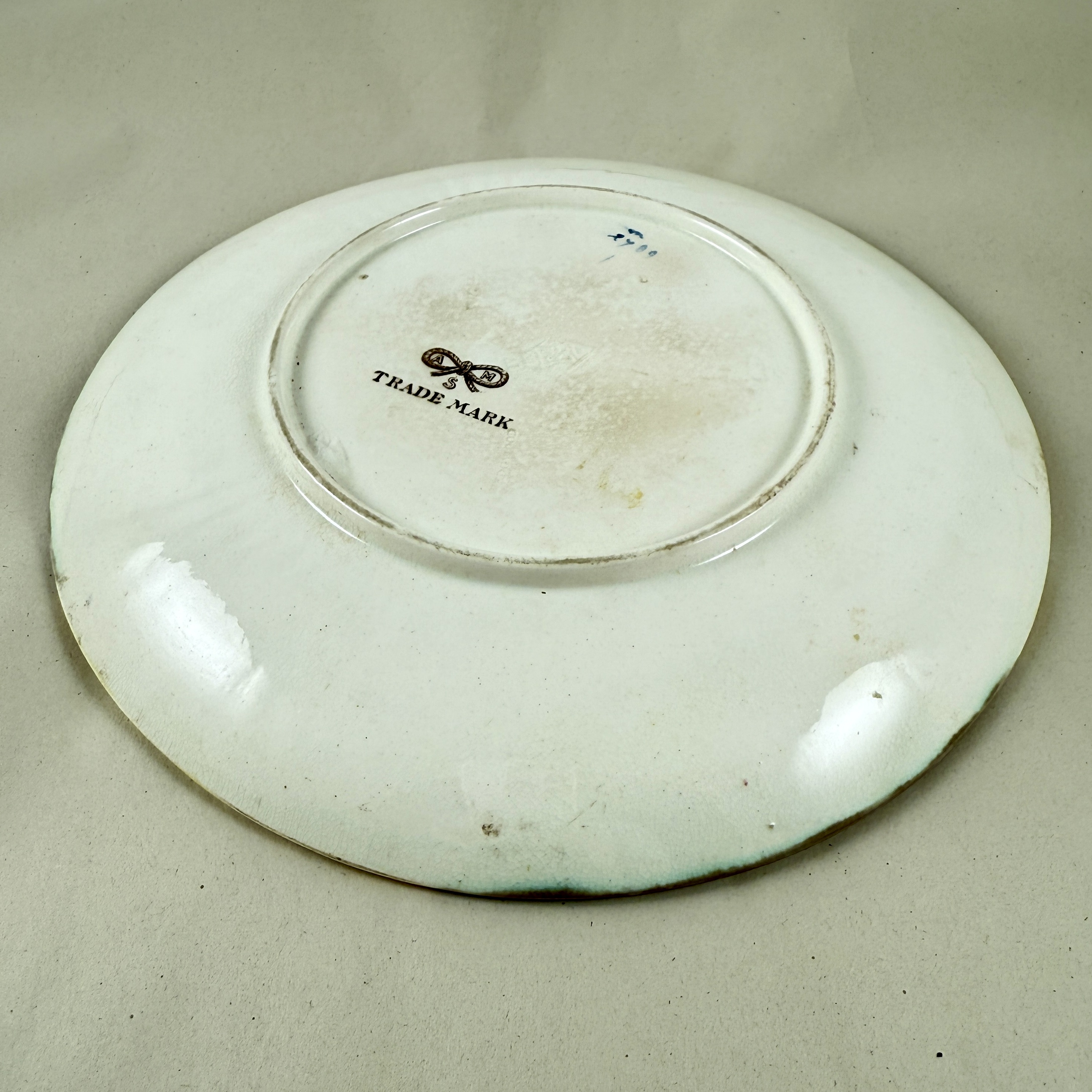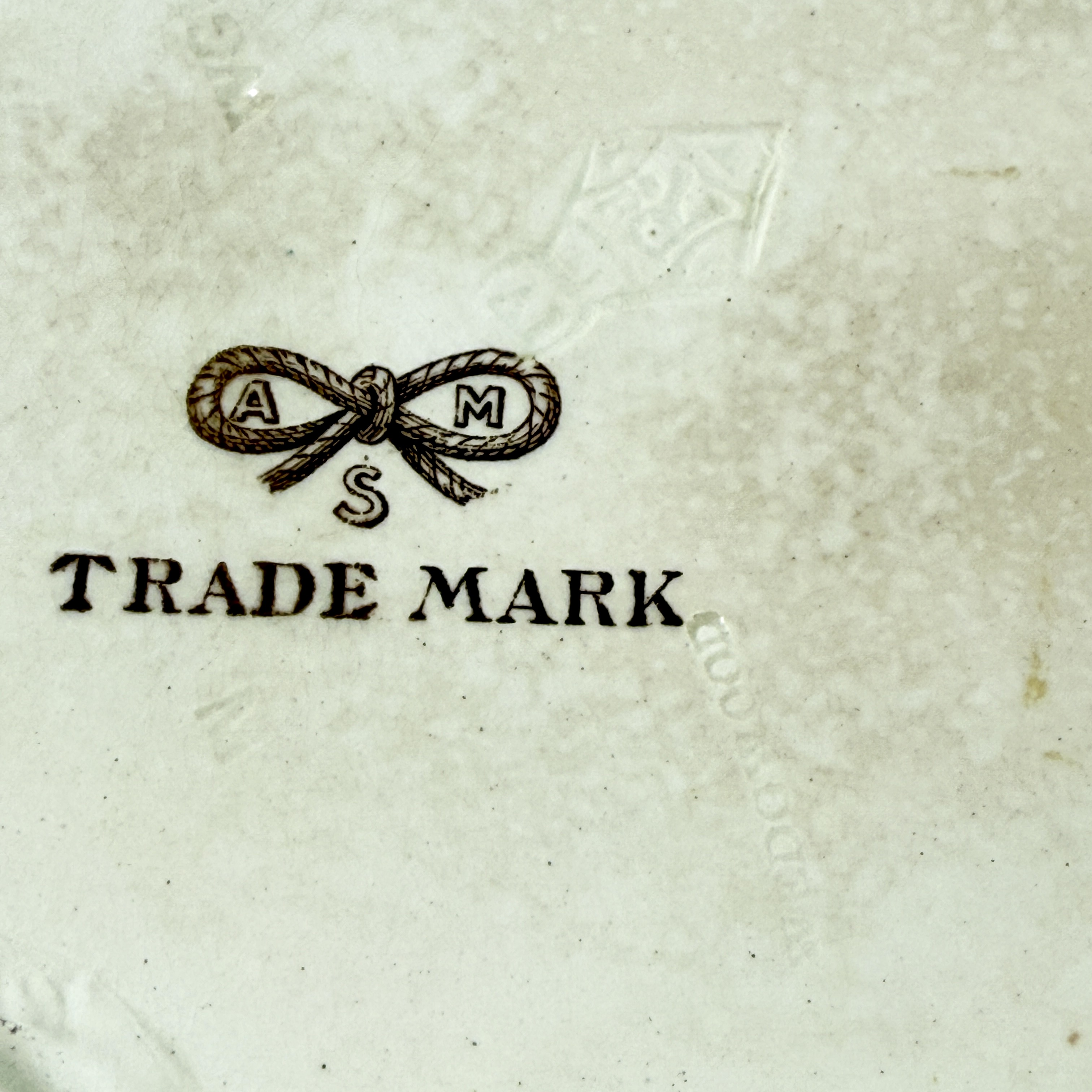 Also seen is a printed mark showing the Staffordshire Knot with the letters AMS, most likely the trademark of a retailer.