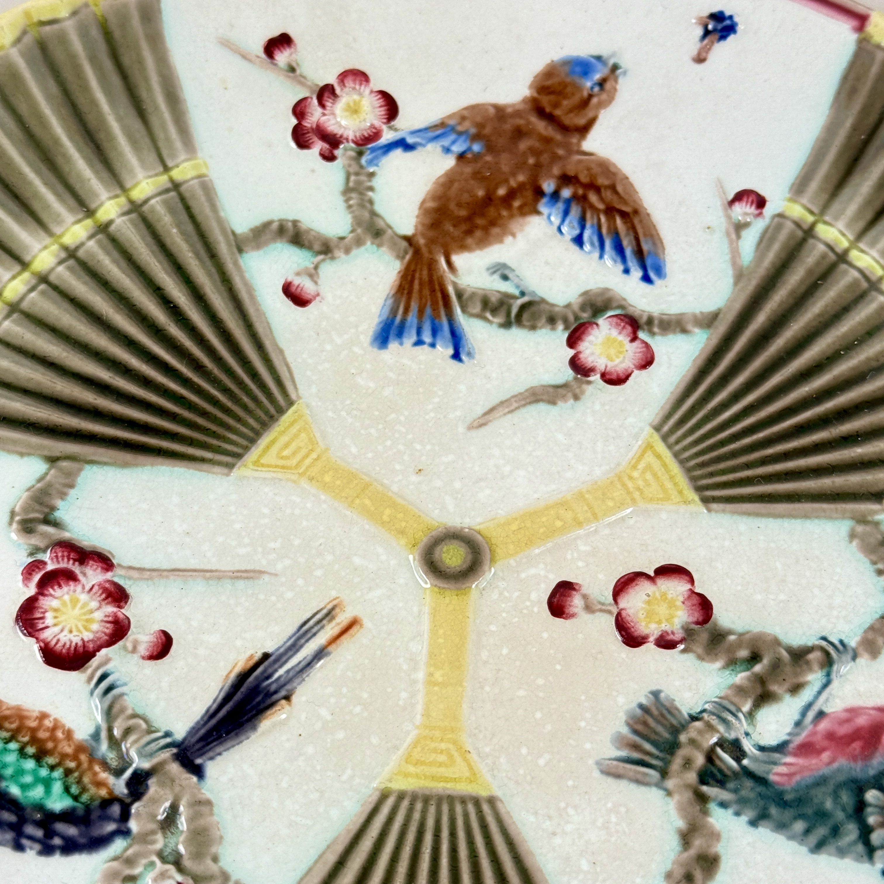 Three different birds in flight are divided into panels by gray and yellow glazed pleated fans that meet in the center.