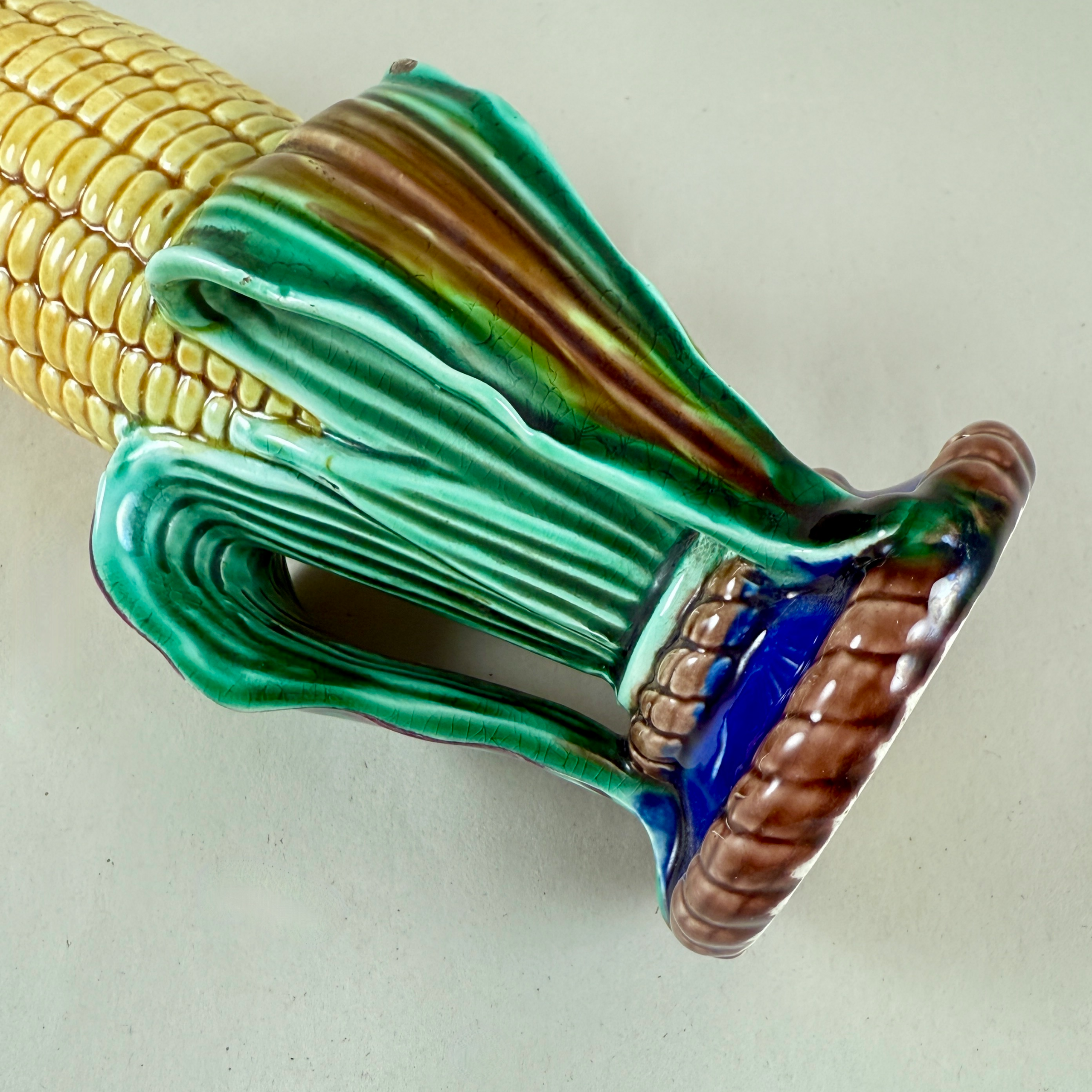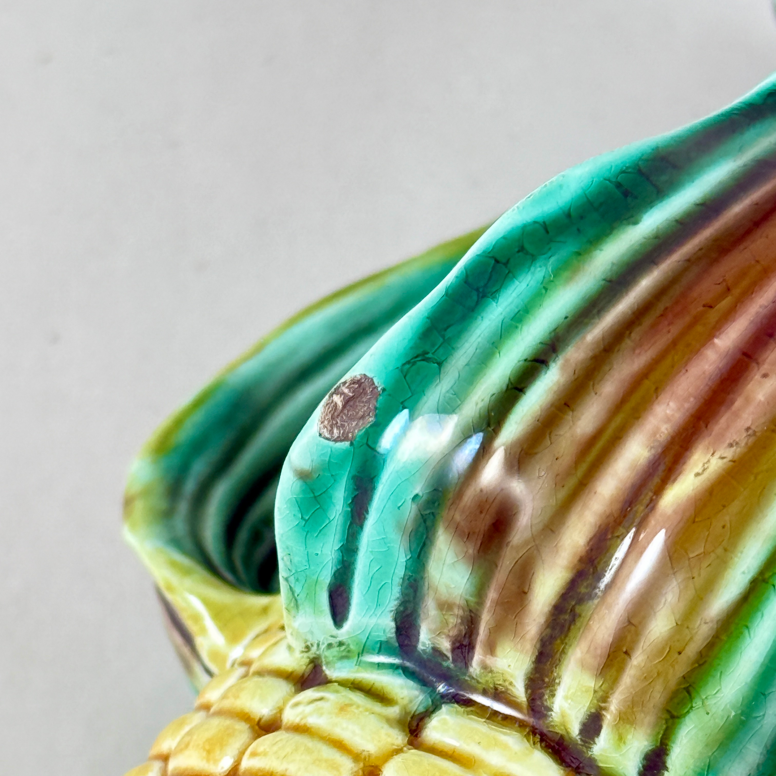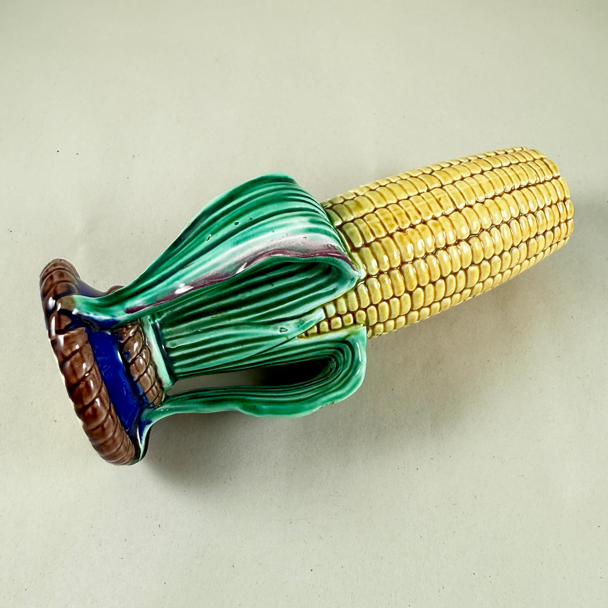 A charming piece with gorgeous mold work and glazing, showing a cob of kerneled yellow corn with bent back husks colored in greens and brown.