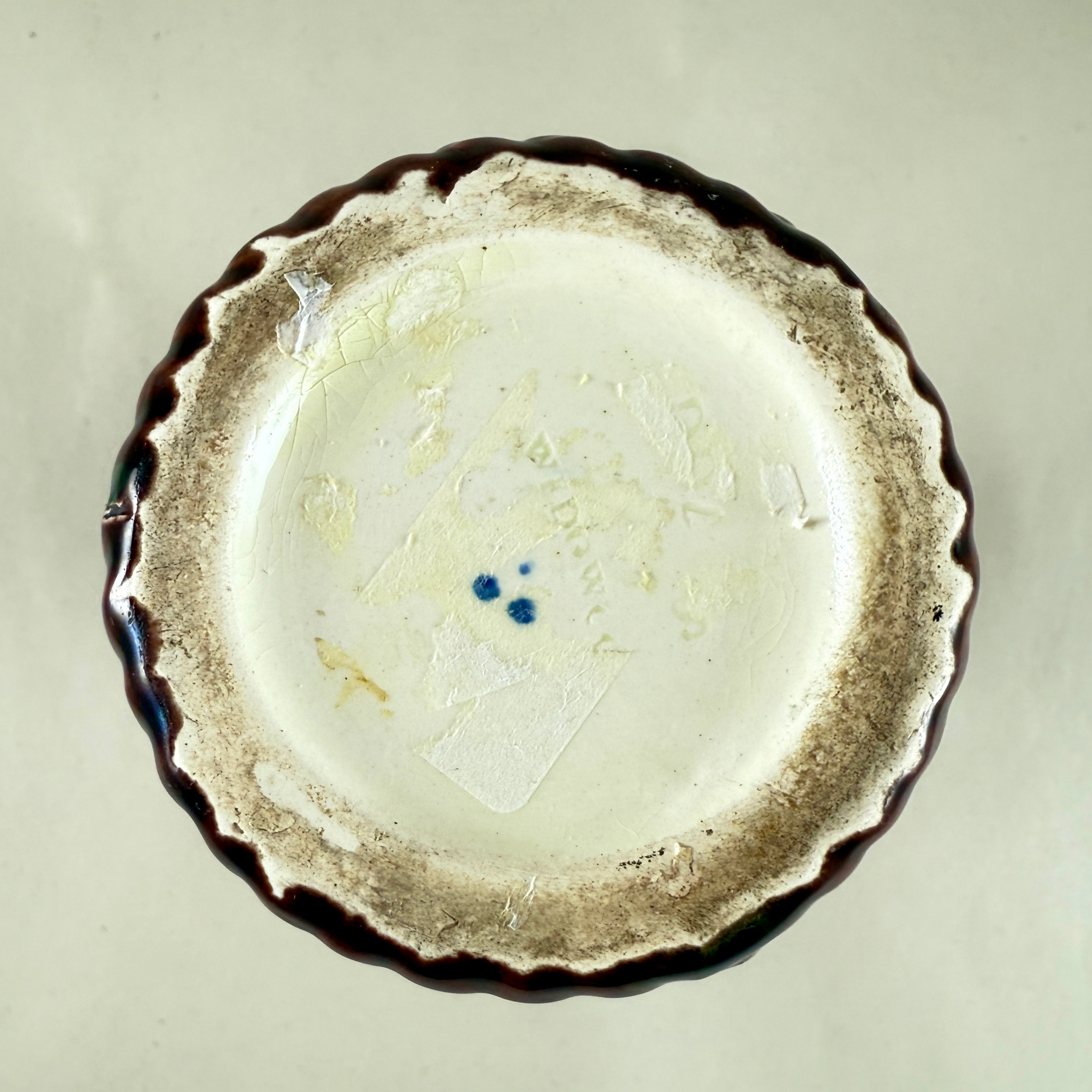 In remarkable condition, an older tiny glaze slip on one husk, the expected light lining to the interior from use.