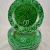 A classic mold showing a single large cabbage leaf against a basket-weave patterned rim. The deep green glaze pools beautifully into the dimensional mold work. Multiple plates are available showing various date codes.