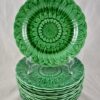 A majolica green glazed plate, from the English firm of Wedgwood. A classic mold showing a Sunflower head against a basket-weave shaped rim. The deep green glaze pools beautifully into the dimensional mold work.