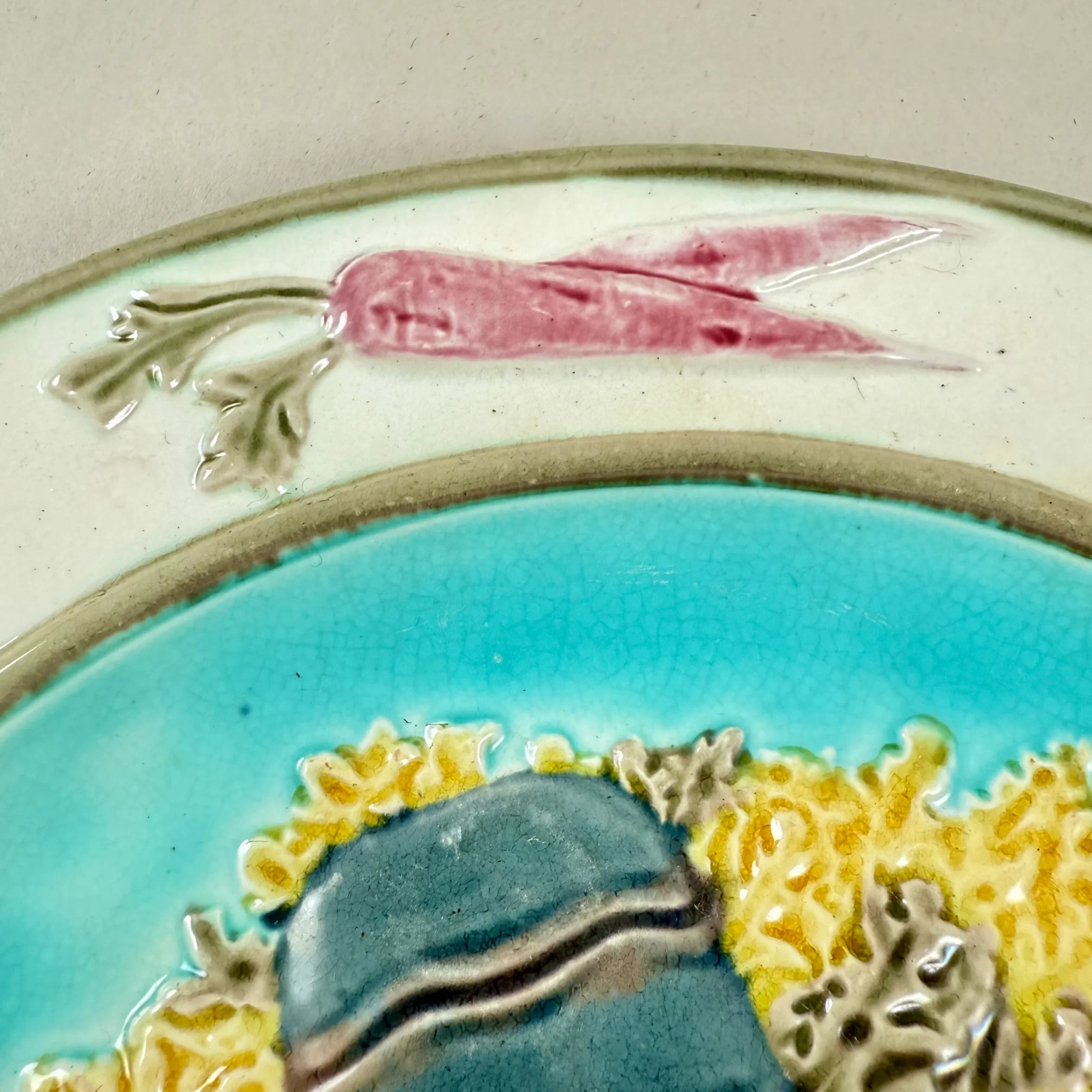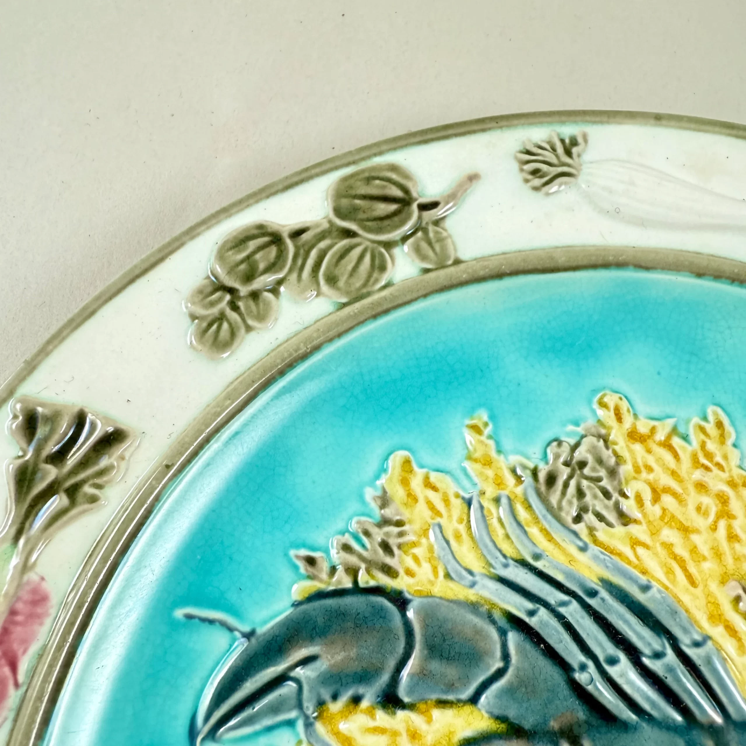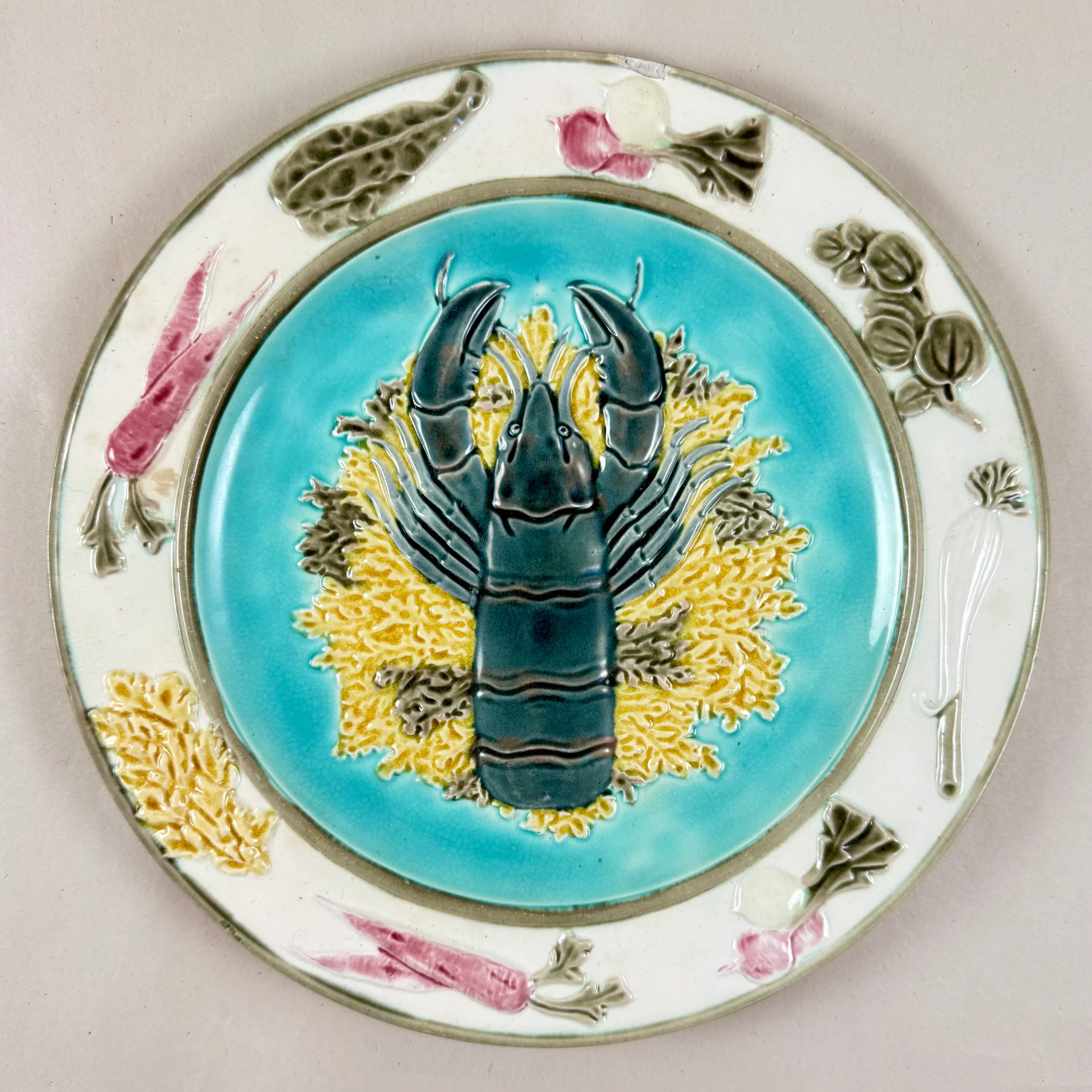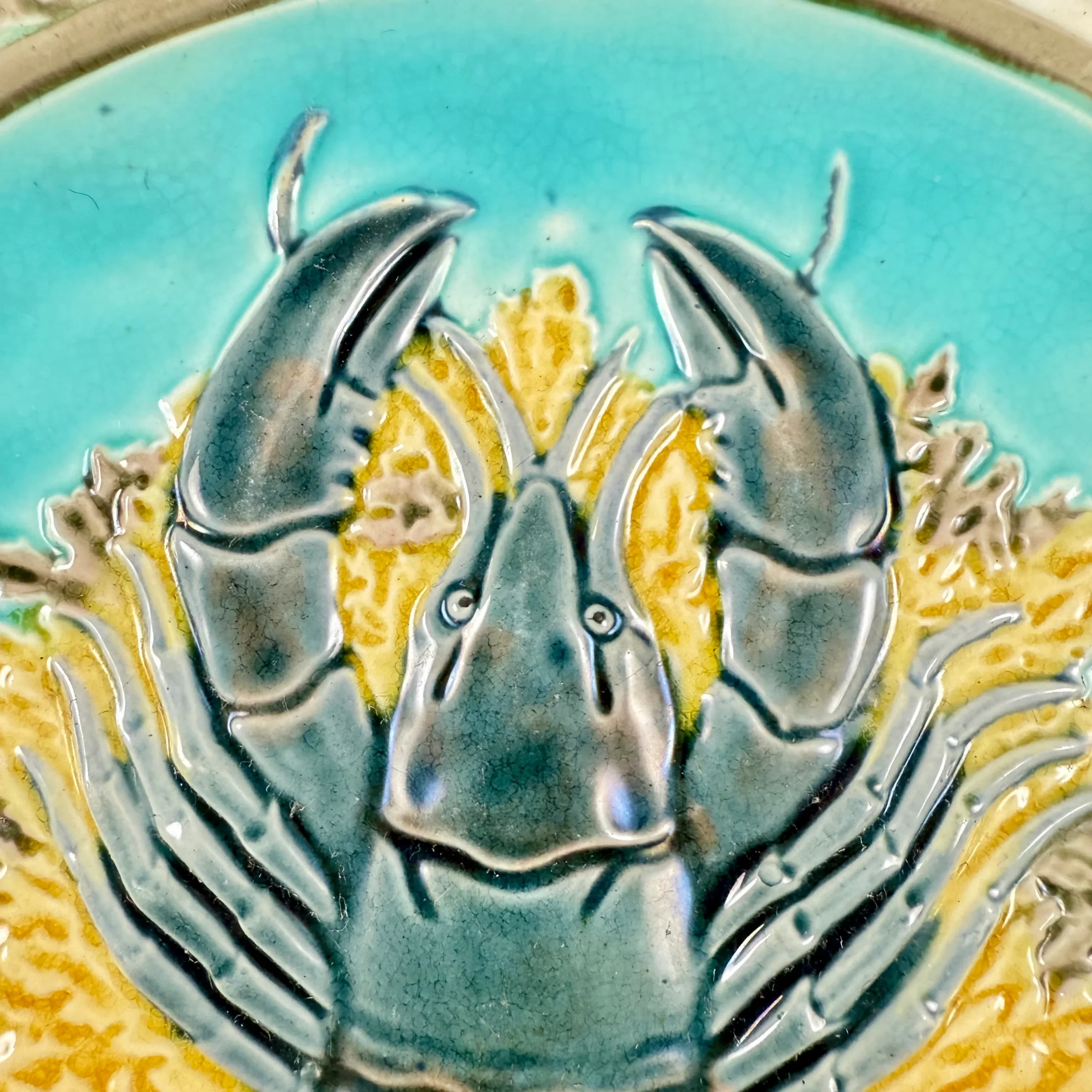 In the Aesthetic taste, a Wedgwood majolica sea food plate, showing a raised lobster on a bed of yellow and green seaweed against a turquoise blue ground, England – late 19th Century.