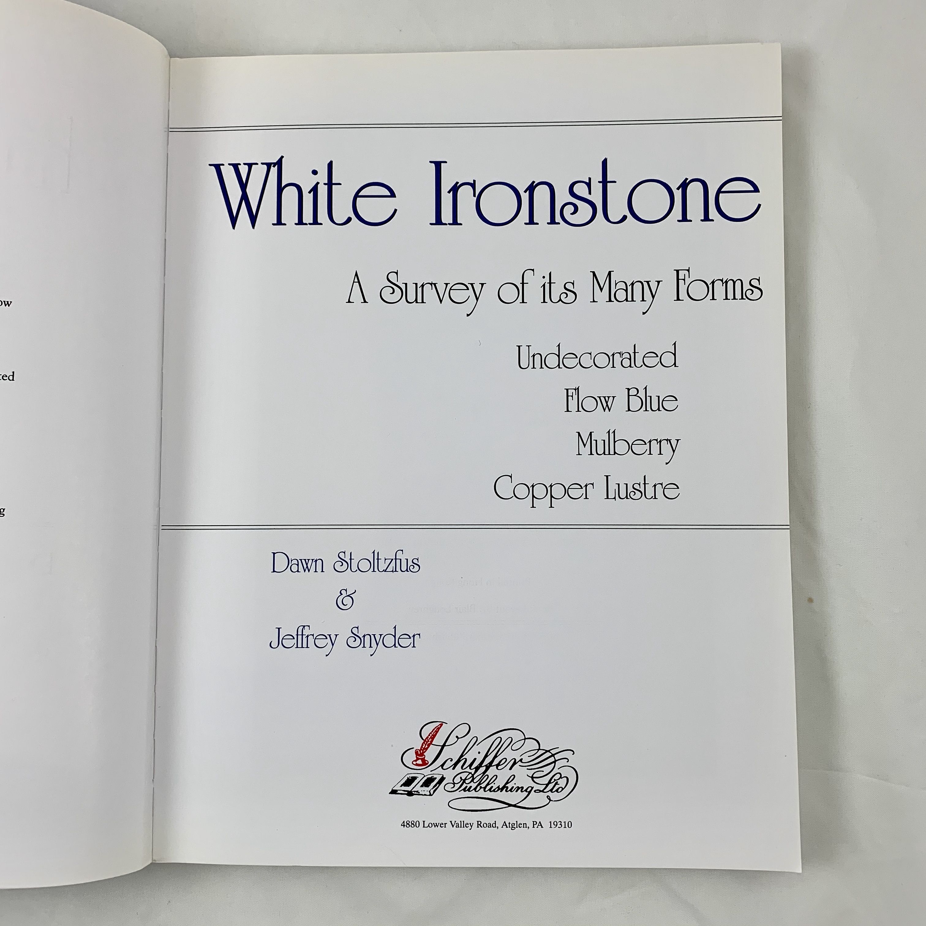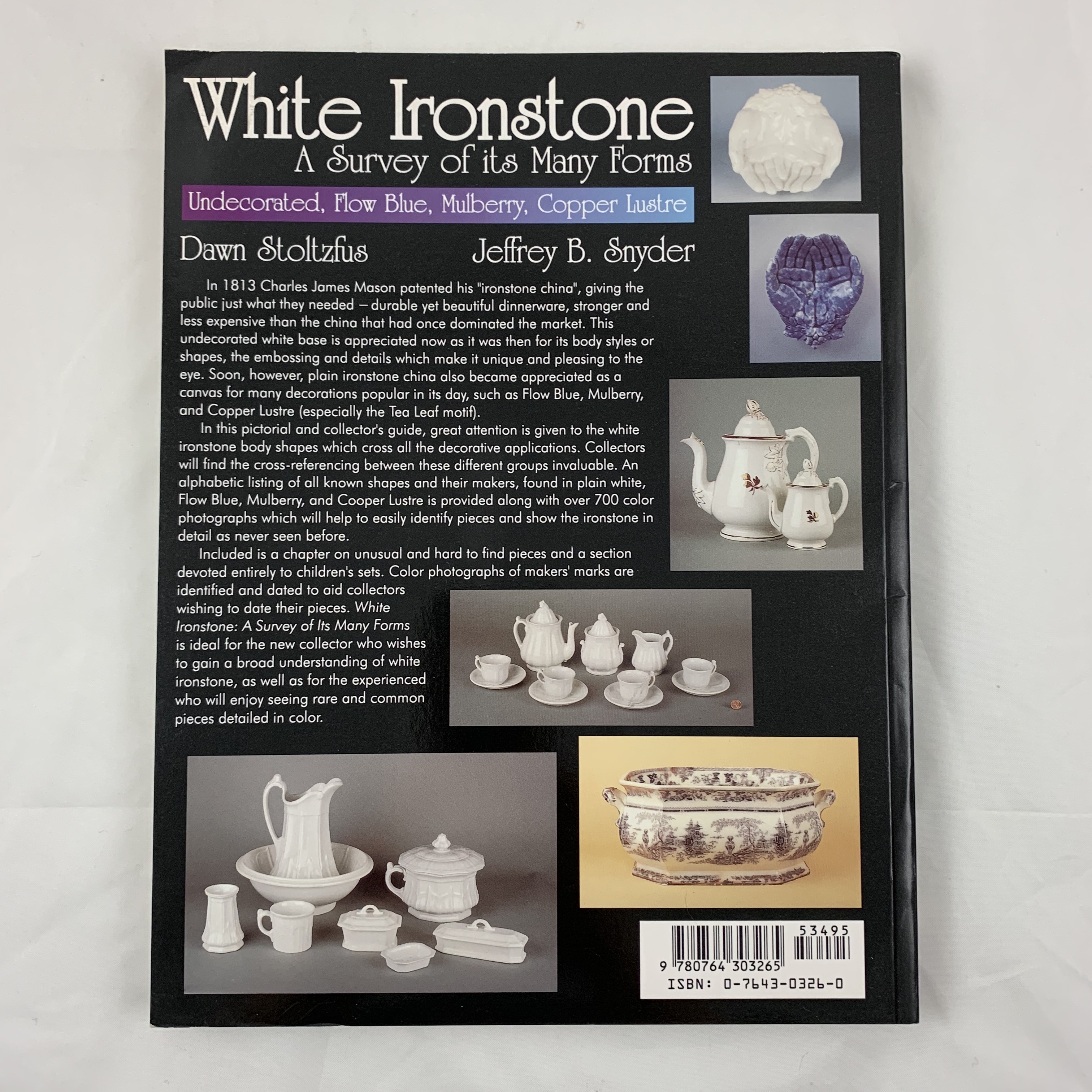 White ironstone, a survey of its many forms: Undecorated, flow blue, mulberry, copper lustre by Dawn Stoltzfus and Jeffrey Snyder 1st Edition Paperback 1997,